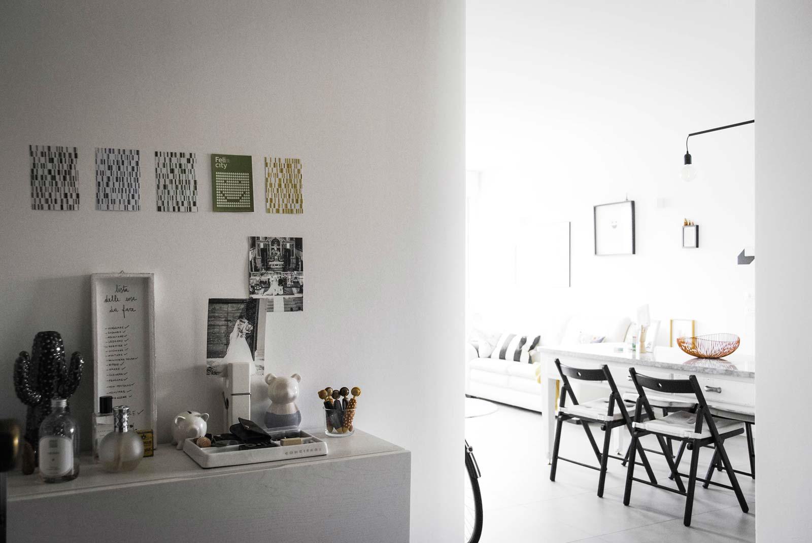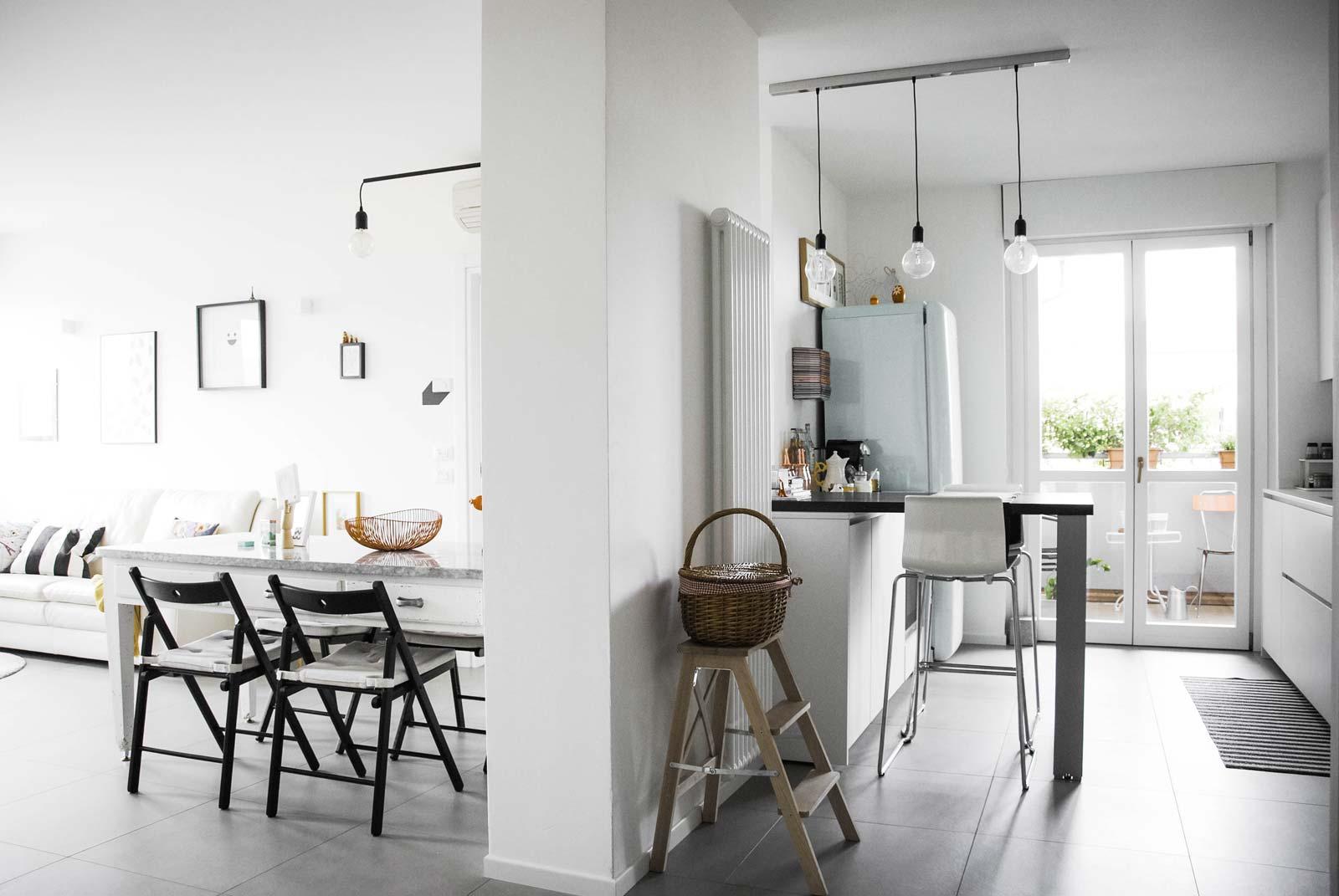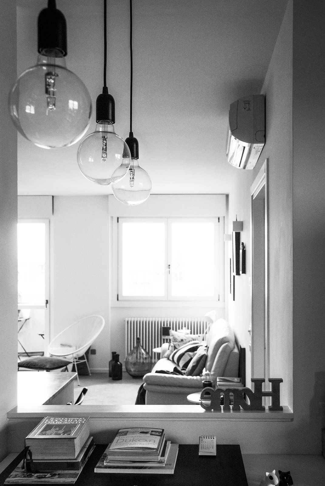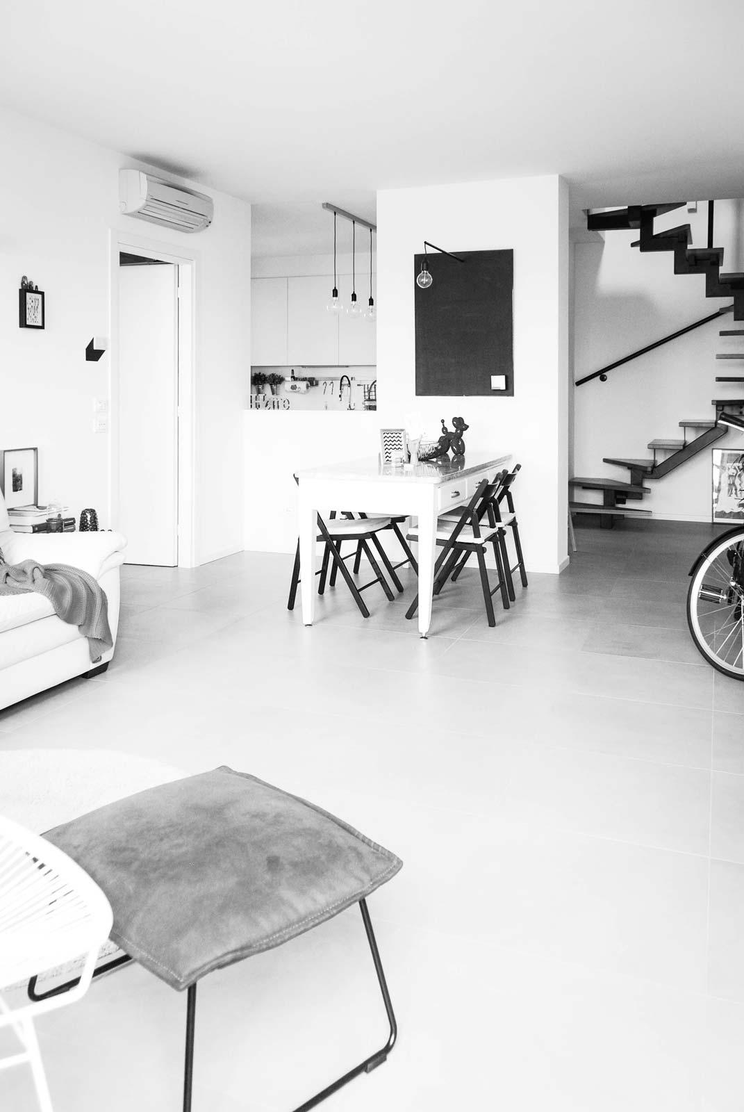 Todos los detalles decorativos han sido estudiados por los proyectistas para reflejar los gustos y la personalidad de los propietarios de la casa y hacen de este dúplex un hogar fresco y acogedor, a la vez que refinado y contemporáneo. Interesante, por ejemplo, el tabique que divide y une al mismo tiempo la sala de estar y la cocina; esta solución resulta aún más eficaz gracias a los detalles de la iluminación visibles desde el comedor.