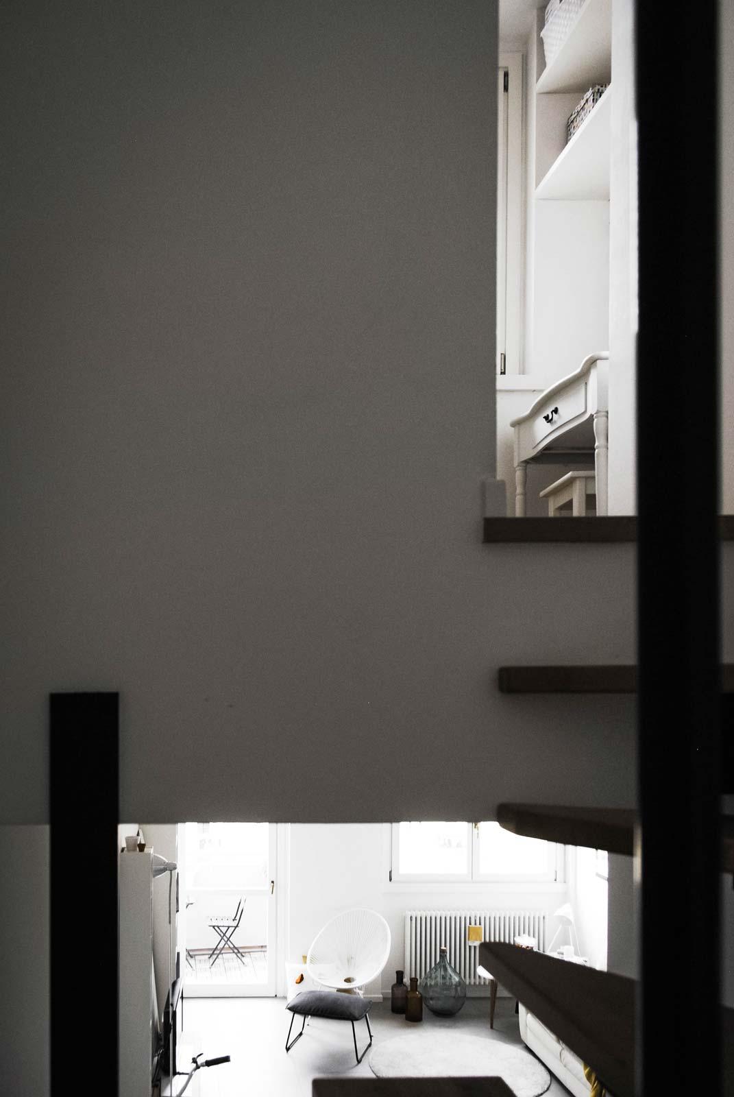 Los dos pisos están conectados por medio de una escalera de caracol, con una estructura metálica negra y escalones de madera, ligera y a la vista, que al mismo tiempo constituye un elemento decorativo de la sala de estar.