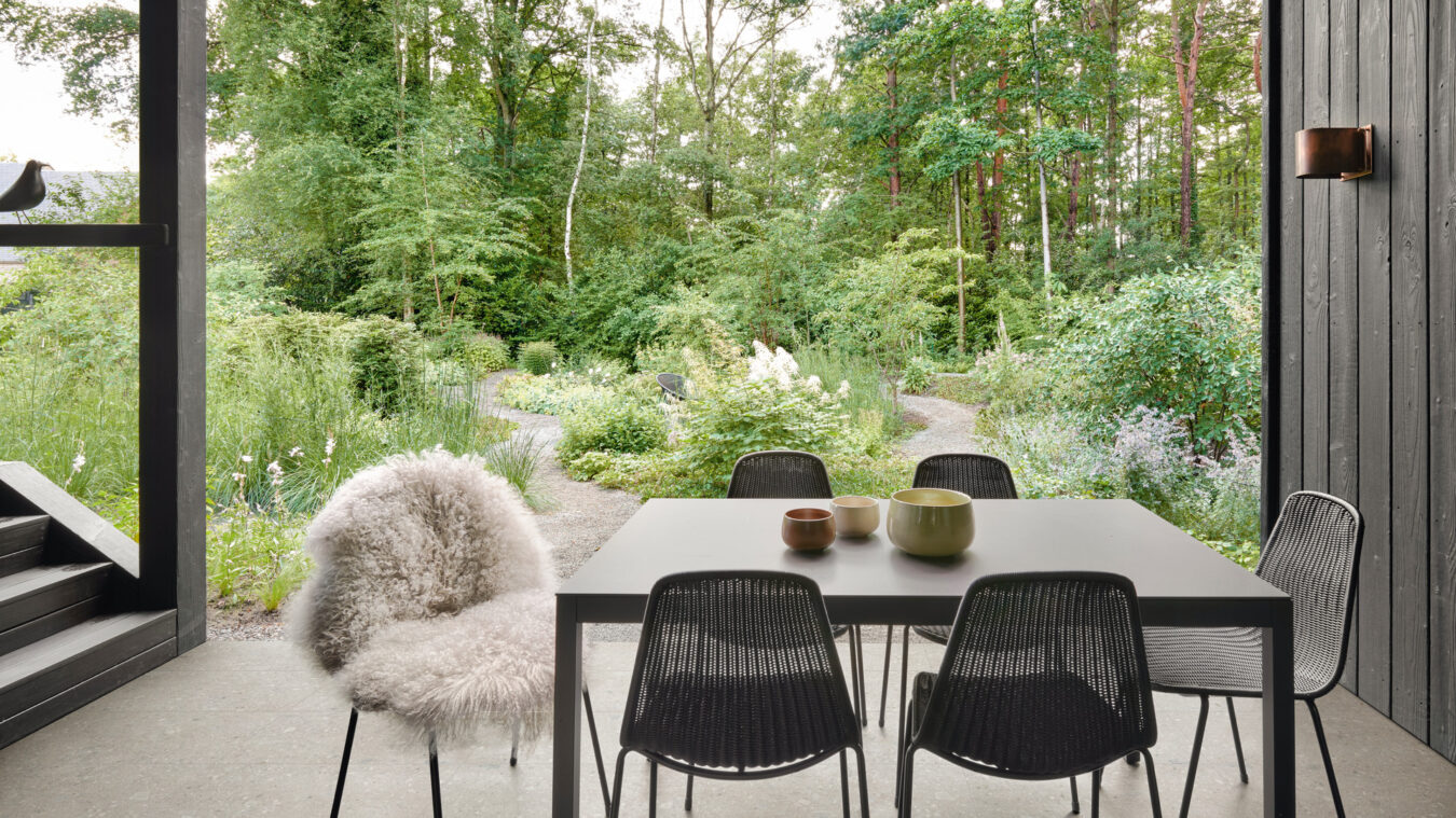 Por el contrario, en el caso de un jardín amplio, es posible organizar el espacio en zonas diferenciadas. Los caminos pavimentados de gres dirigen la mirada y el uso del espacio, creando un verdadero “plano arquitectónico” al aire libre. Los muebles pueden ser de mayor tamaño, desde sofás modulares hasta grandes mesas con capacidad para 8-10 personas.