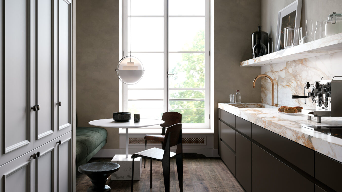 Para el baño y la cocina —ambientes a menudo de pocos metros—, las colecciones de Marazzi proponen revestimientos coordinados con el suelo, ideales para dar vida a un espacio uniforme y refinado. Las soluciones con formatos alargados y texturas minimalistas son perfectas para estancias de reducidas dimensiones, ya que las transforman en ambientes acogedores y bien organizados.