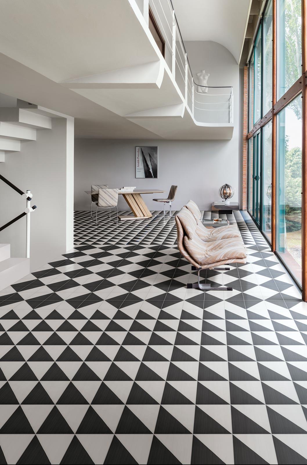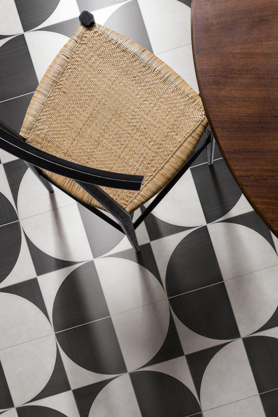 Fuertes grafismos y patrones geométricos connotan Scenario, un gres de 20 x 20 cm de efecto “pincelado” inspirado en la homónima colección de Marazzi, creada en 1958 por el pintor y ceramista Venerio Martini. El esparcimiento irregular del color remite al proceso de decoración manual de aquella época. Dos son las variantes superficiales: semimate, en tres colores, adecuada para pavimentar y revestir espacios residenciales y locales comerciales de tráfico ligero, y ultrabrillante, en cinco colores de sabor mediterráneo.