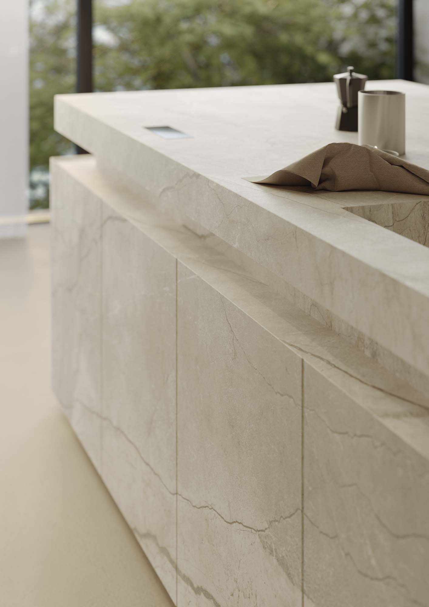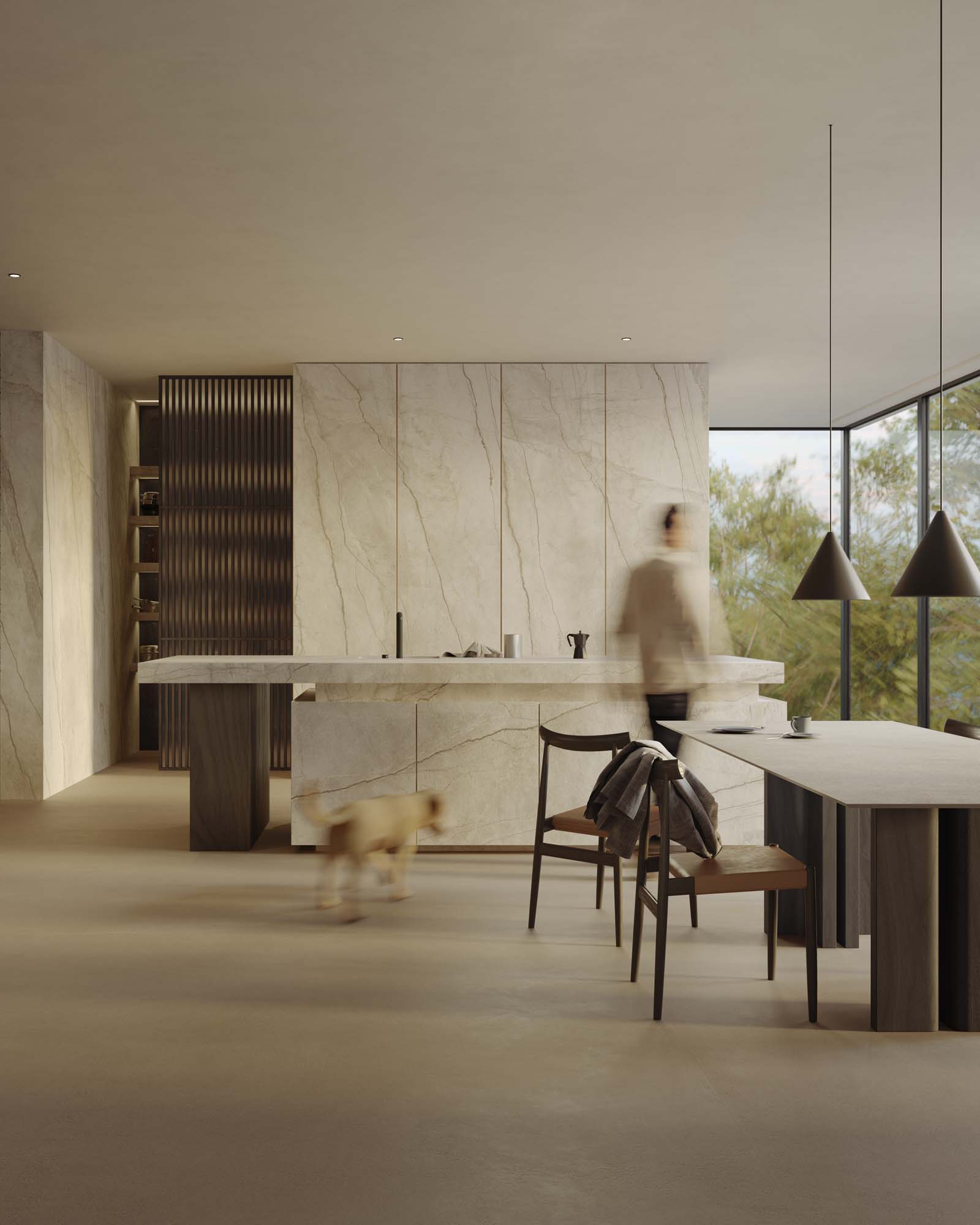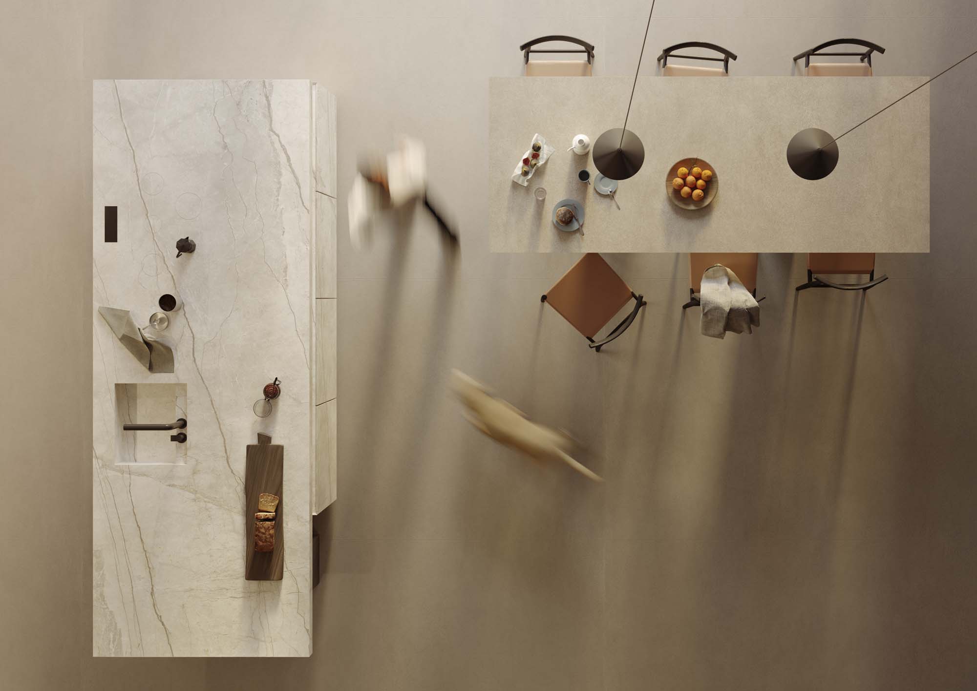 “Las ventanas en banda que se abren a la naturaleza y la habitación amplia y luminosa nos inspiraron una idea de acción más que un simple espacio funcional: un desayuno matutino en una atmósfera nórdica dentro de un espacio abierto y menos mediterráneo.” Están presentes detalles y objetos que evocan momentos del día, como el desayuno, y las funciones de cada una de las zonas; por ejemplo, se percibe un poco de desorden en la despensa, mientras que el tocadiscos sobre la repisa ayuda a fusionar los ambientes living y cocina.” La composición arquitectónica resalta la colección efecto terracota Slow propuesta en la nueva versión en placa de 12 mm color Calce, colocada en el suelo y sobre la superficie de la gran mesa, combinada con la sensación pétrea de la Silver Root en la nueva versión más clara, colocada en la cocina, en la pared trasera y en la repisa.