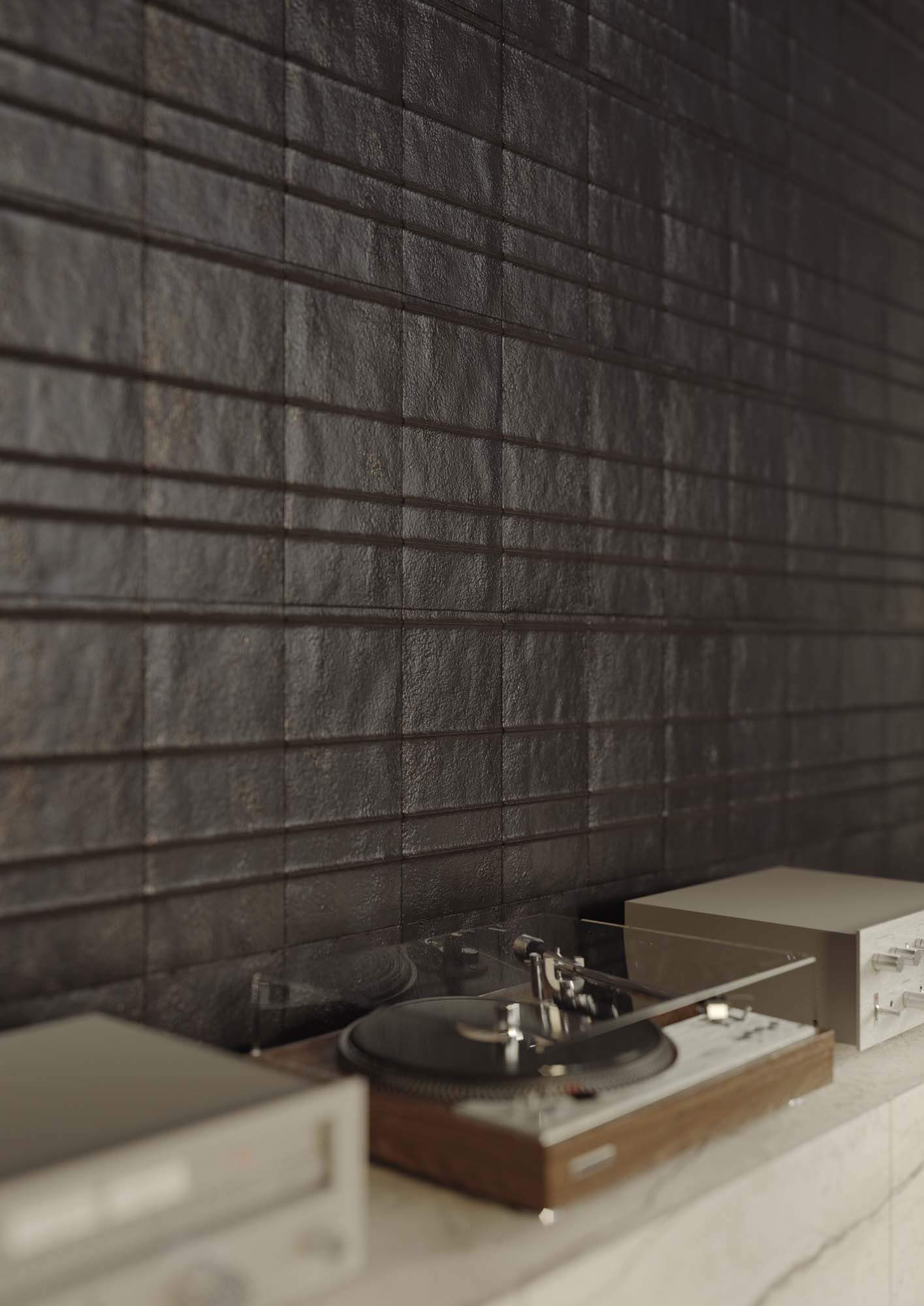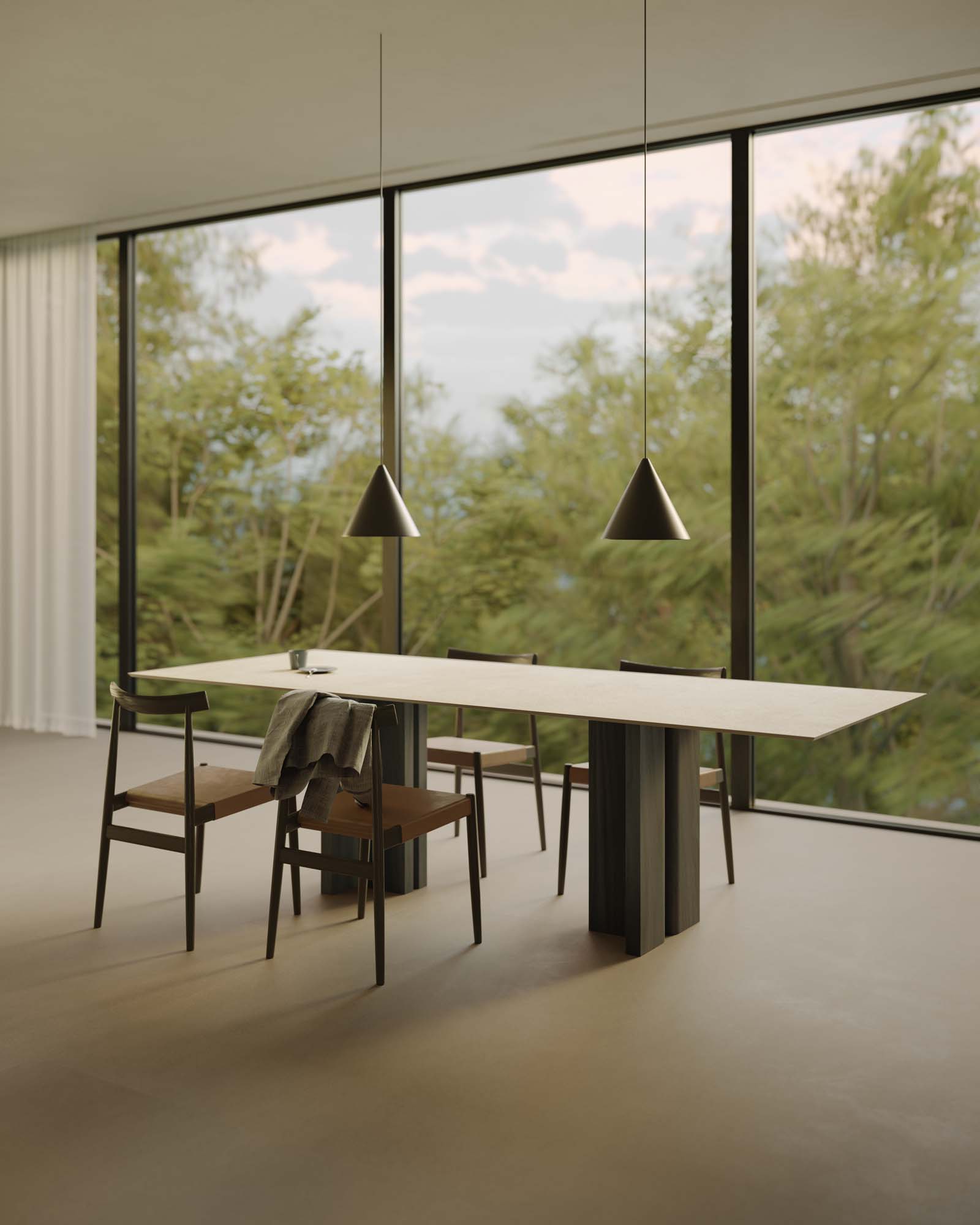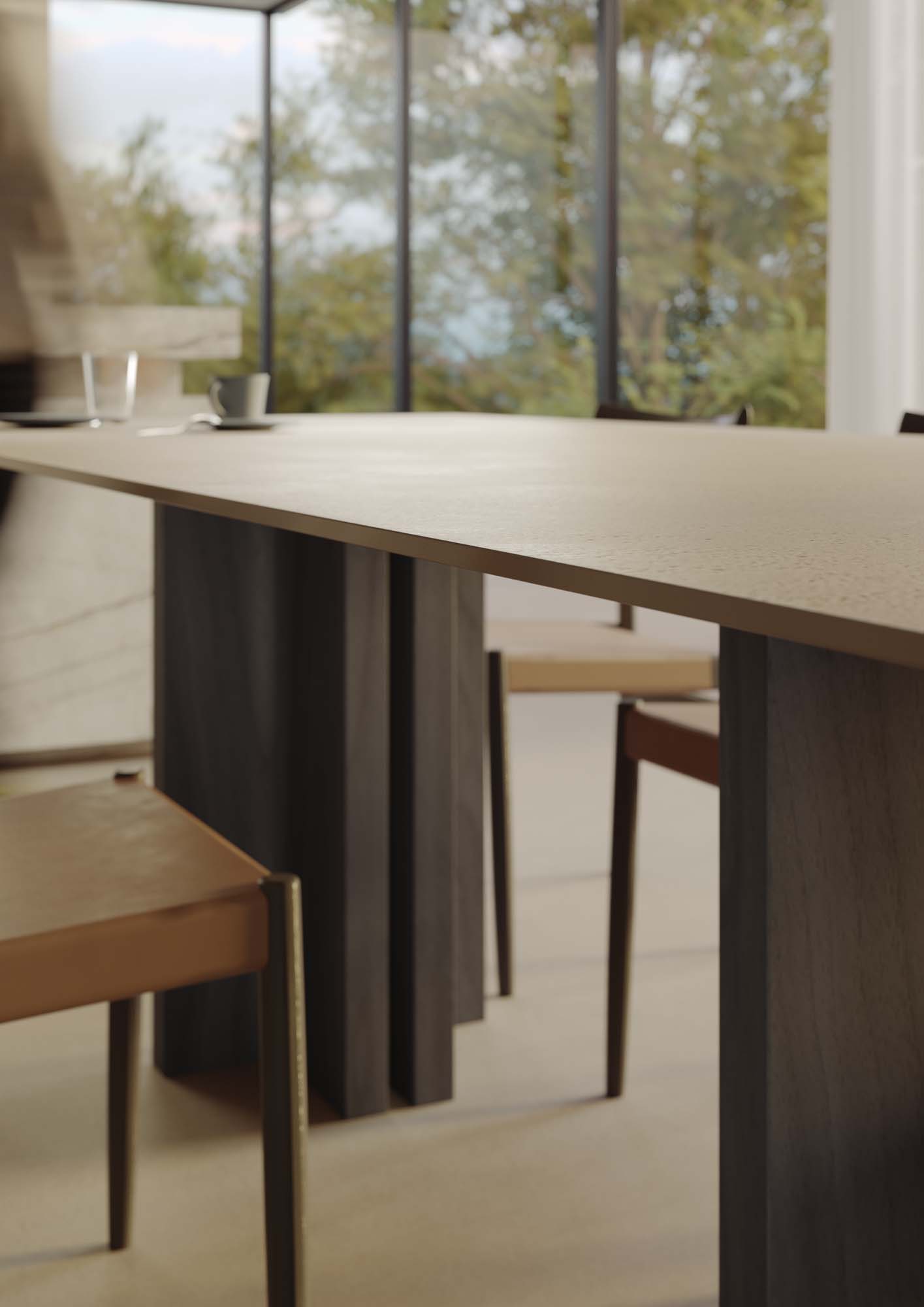 “Las ventanas en banda que se abren a la naturaleza y la habitación amplia y luminosa nos inspiraron una idea de acción más que un simple espacio funcional: un desayuno matutino en una atmósfera nórdica dentro de un espacio abierto y menos mediterráneo.” Están presentes detalles y objetos que evocan momentos del día, como el desayuno, y las funciones de cada una de las zonas; por ejemplo, se percibe un poco de desorden en la despensa, mientras que el tocadiscos sobre la repisa ayuda a fusionar los ambientes living y cocina.” La composición arquitectónica resalta la colección efecto terracota Slow propuesta en la nueva versión en placa de 12 mm color Calce, colocada en el suelo y sobre la superficie de la gran mesa, combinada con la sensación pétrea de la Silver Root en la nueva versión más clara, colocada en la cocina, en la pared trasera y en la repisa.
