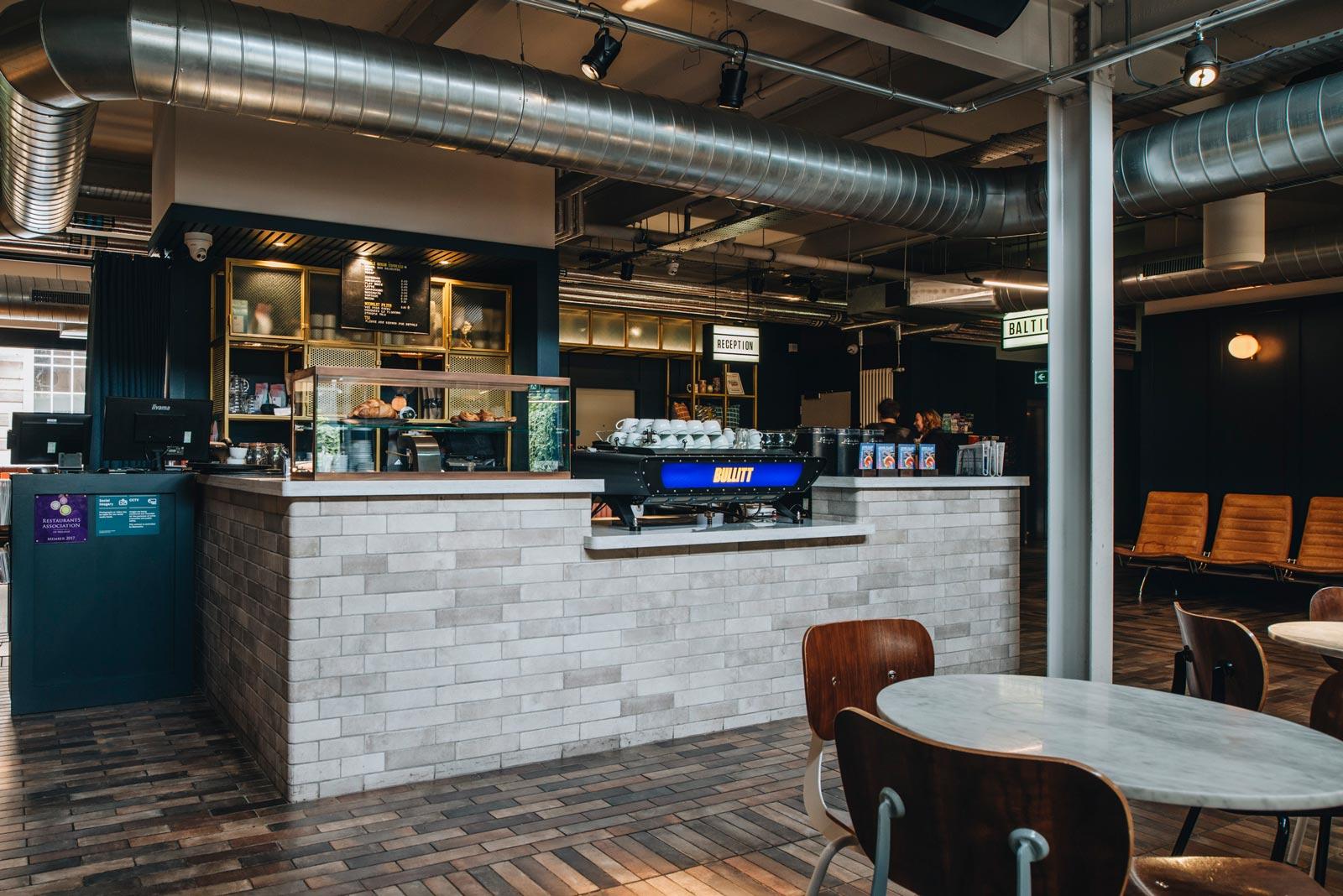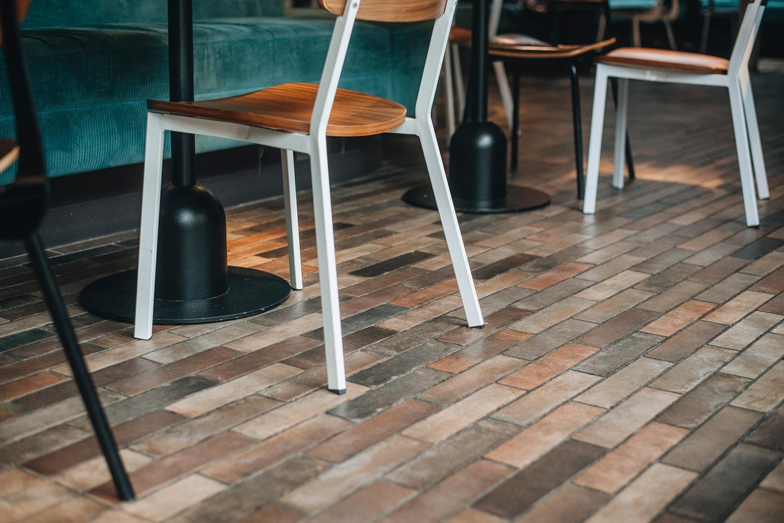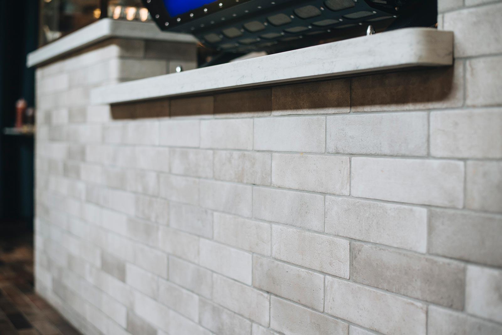Ladrillo y gres porcelánico imitación mármol para decorar un espacio dedicado a la hostelería