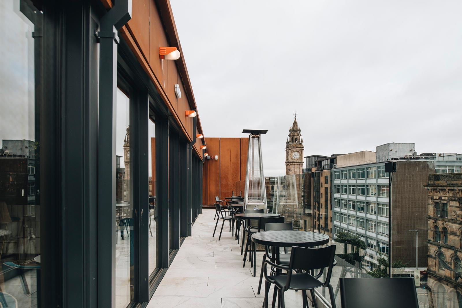 Los arquitectos también han elegido un gres porcelánico de Marazzi para el bar de azotea del hotel, Babel, que es el más grande de Irlanda y cuenta con una terraza panorámica desde la cual se puede contemplar los tejados de Belfast.