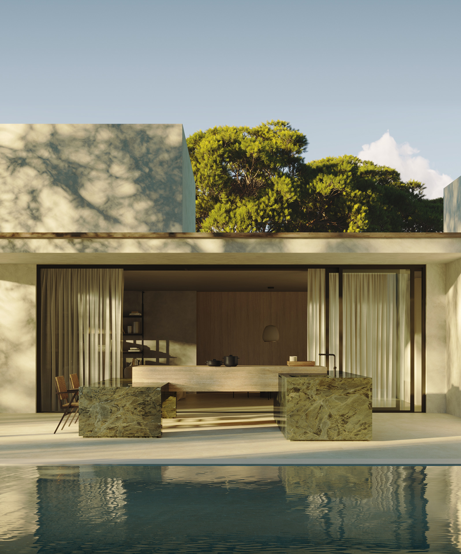 El elemento central del ambiente es una cocina independiente al aire libre, formada por tres bloques completamente revestidos con gres porcelánico: uno central de The Top Stone Look Travertino, donde se encuentra la placa de inducción, y dos laterales de The Top Marble Look Verde Borgogna, con fregadero empotrado y encimera. La mesa redonda se ha realizado basándose en el diseño de los proyectistas, usando Stone Look Granito Black 12 mm, una superficie muy matérica y agradable al tacto. En el suelo, las placas de Stone Look Limestone Ivory.