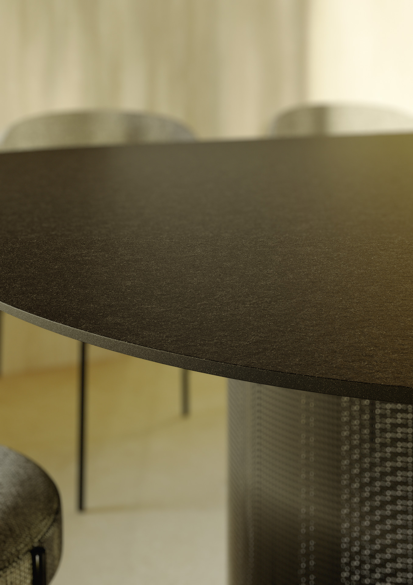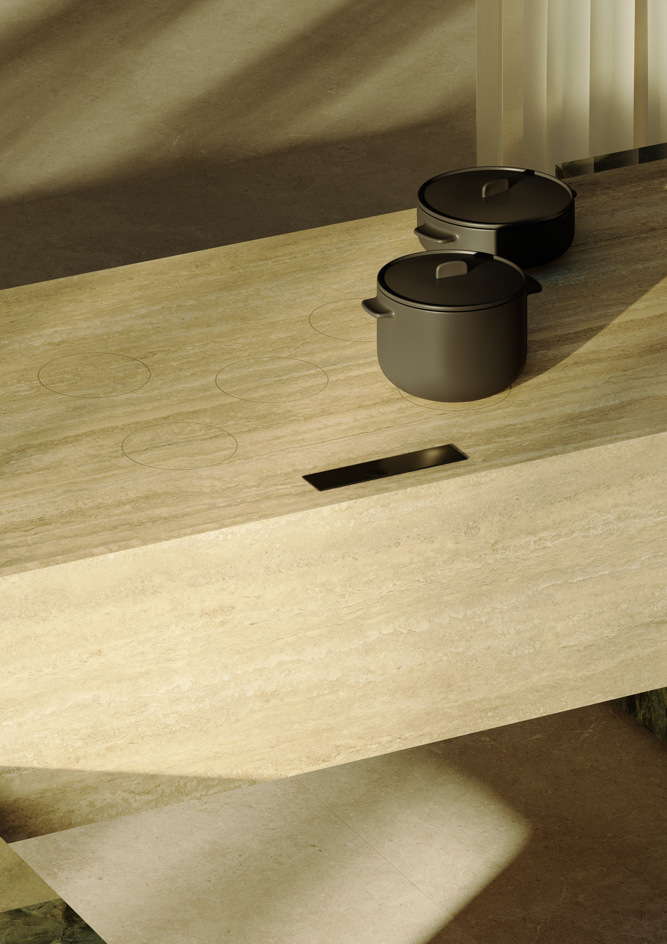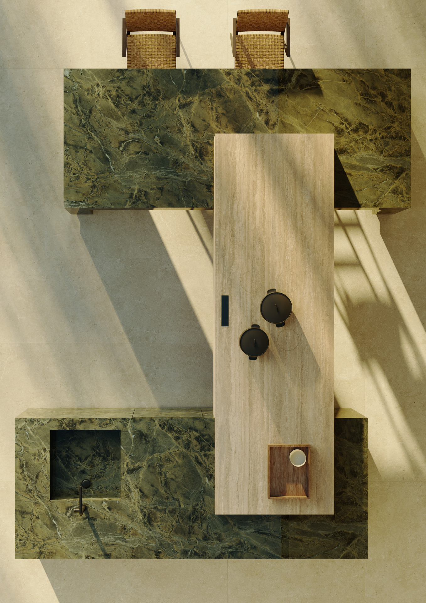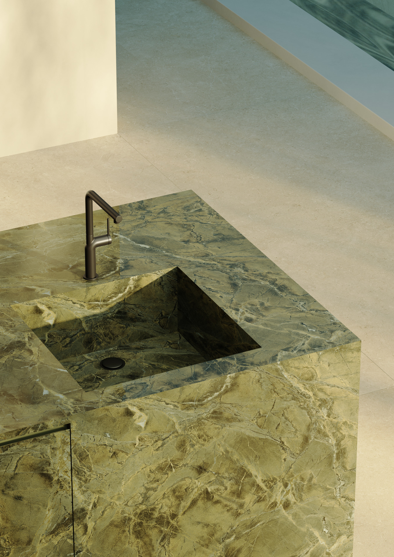 «Al diseñar este espacio —explican Chiara Ormelli y Massimo Colonna, fundadores del colectivo Il Magma, que ha realizado el proyecto—, decidimos jugar con el concepto de ‘fuera de escala’, poniendo énfasis en los volúmenes que se combinan perfectamente con el carácter matérico de la colección de placas The Top y con la versatilidad del gres porcelánico que, en la actualidad, puede utilizarse para revestir cualquier superficie, desde las de trabajo hasta los revestimientos de paredes y suelos, y desde las puertas de armarios y contenedores hasta las superficies decorativas, lo que permite experimentar con una amplia gama de lenguajes y soluciones sin tener que preocuparse por el límite que separa el interior y el exterior».