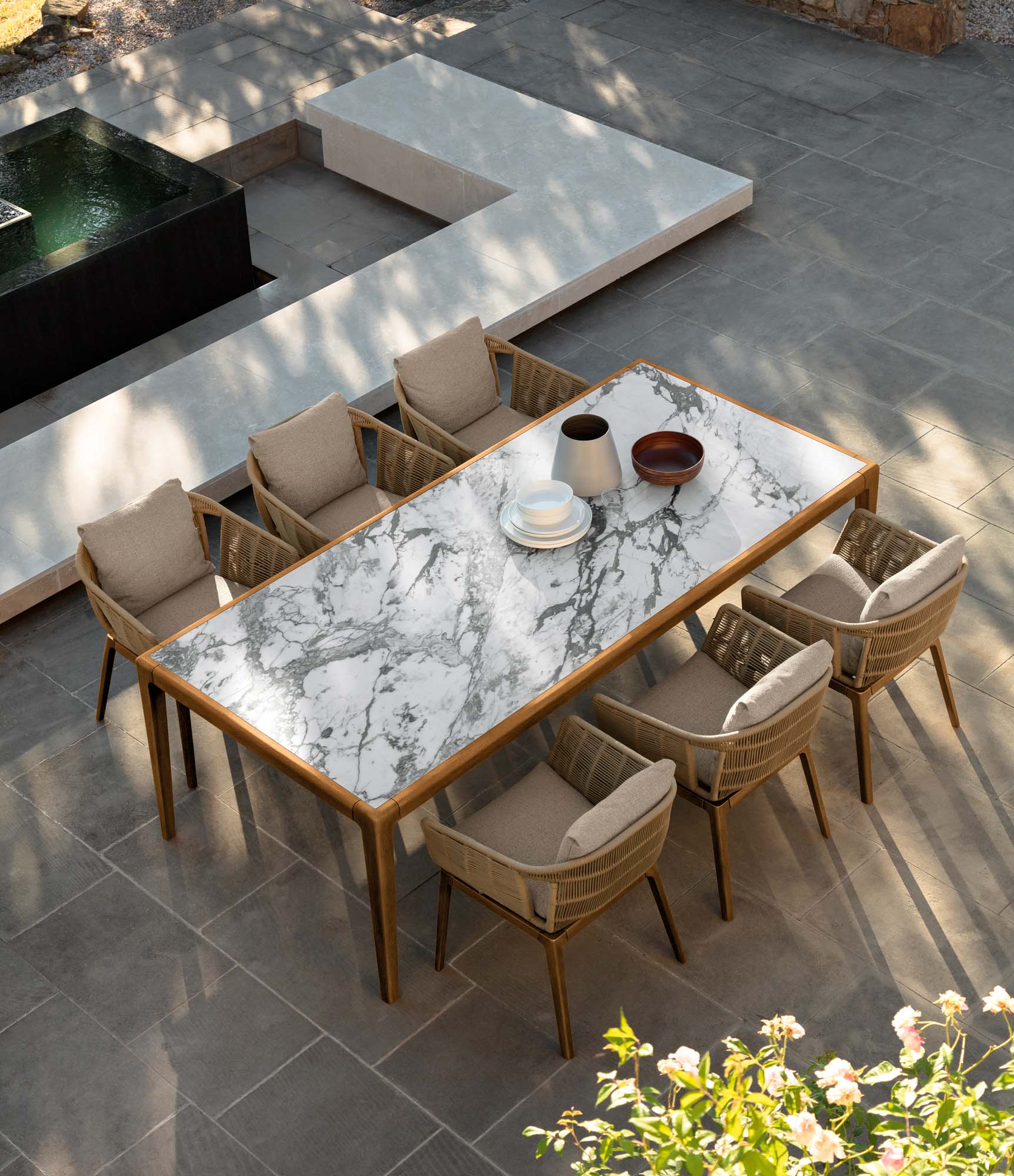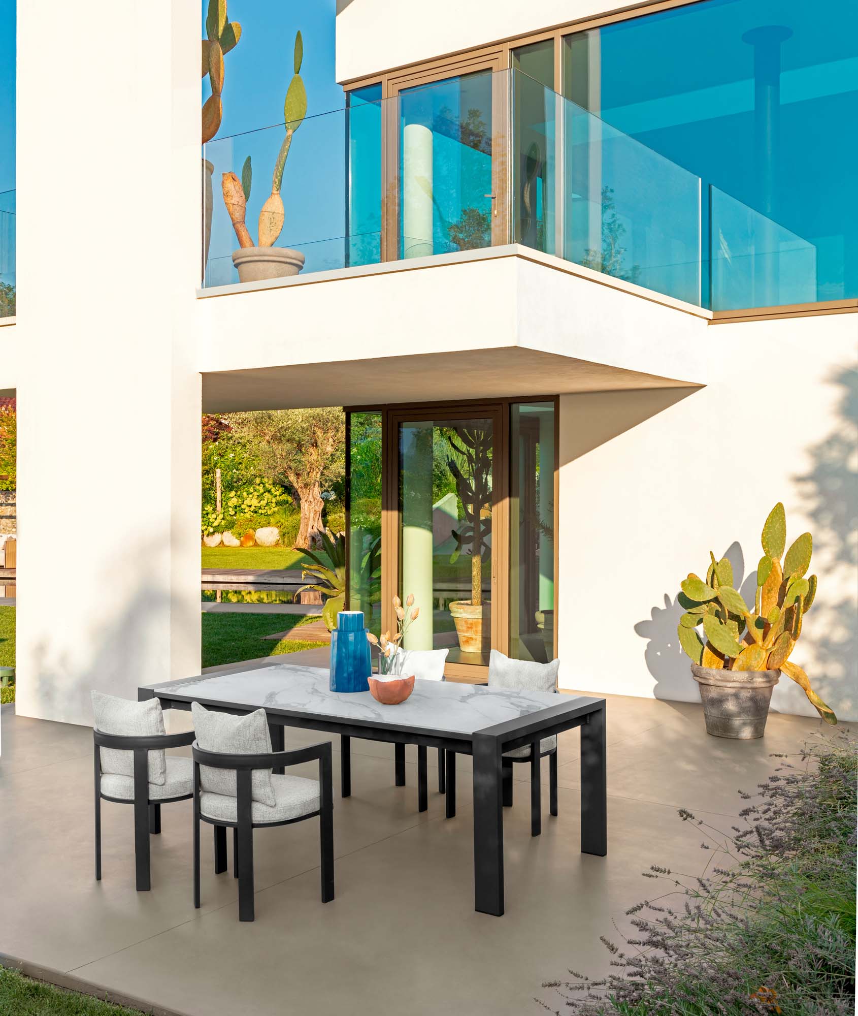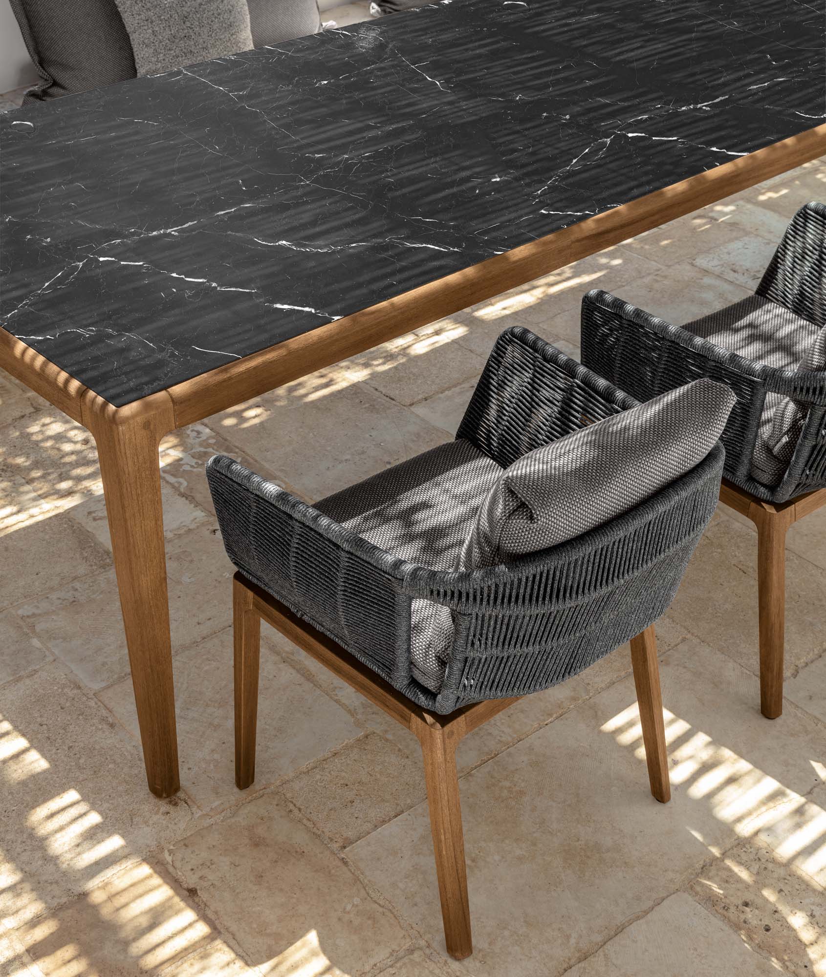 Probablemente, la mesa Cruise Teak de 320×120 cm, en la que el tablero con acabado The Top Marble Look Capraia o Elegant Black ofrece un contraste perfecto con la estructura de teca ahumada. Es uno de nuestros productos más elegantes, que refleja todo el saber hacer de la empresa en términos de artesanía y atención al detalle. Un mueble en el que la placa de gres tiene, sin duda alguna, un papel protagonista.