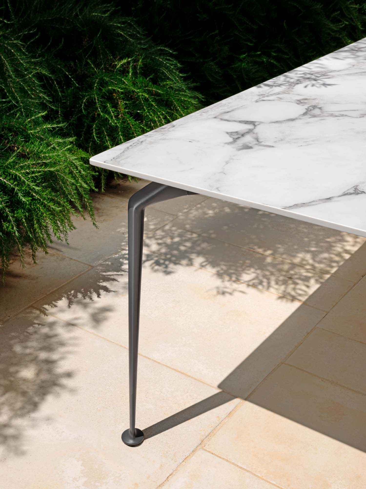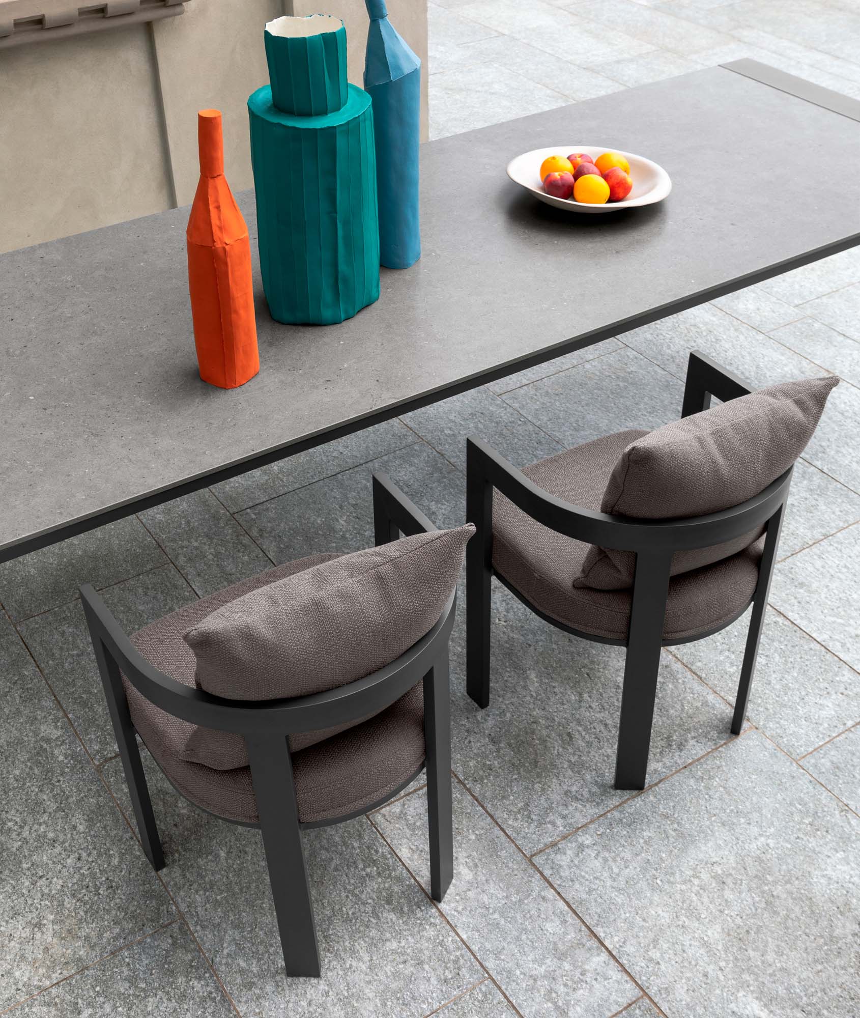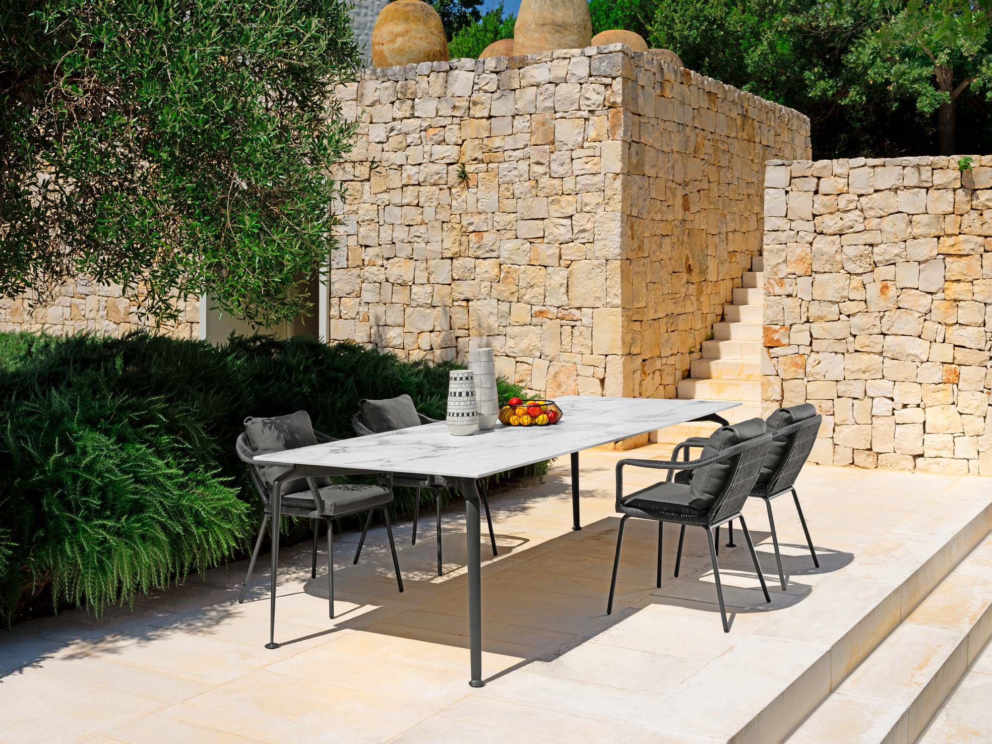Probablemente, la mesa Cruise Teak de 320×120 cm, en la que el tablero con acabado The Top Marble Look Capraia o Elegant Black ofrece un contraste perfecto con la estructura de teca ahumada. Es uno de nuestros productos más elegantes, que refleja todo el saber hacer de la empresa en términos de artesanía y atención al detalle. Un mueble en el que la placa de gres tiene, sin duda alguna, un papel protagonista.