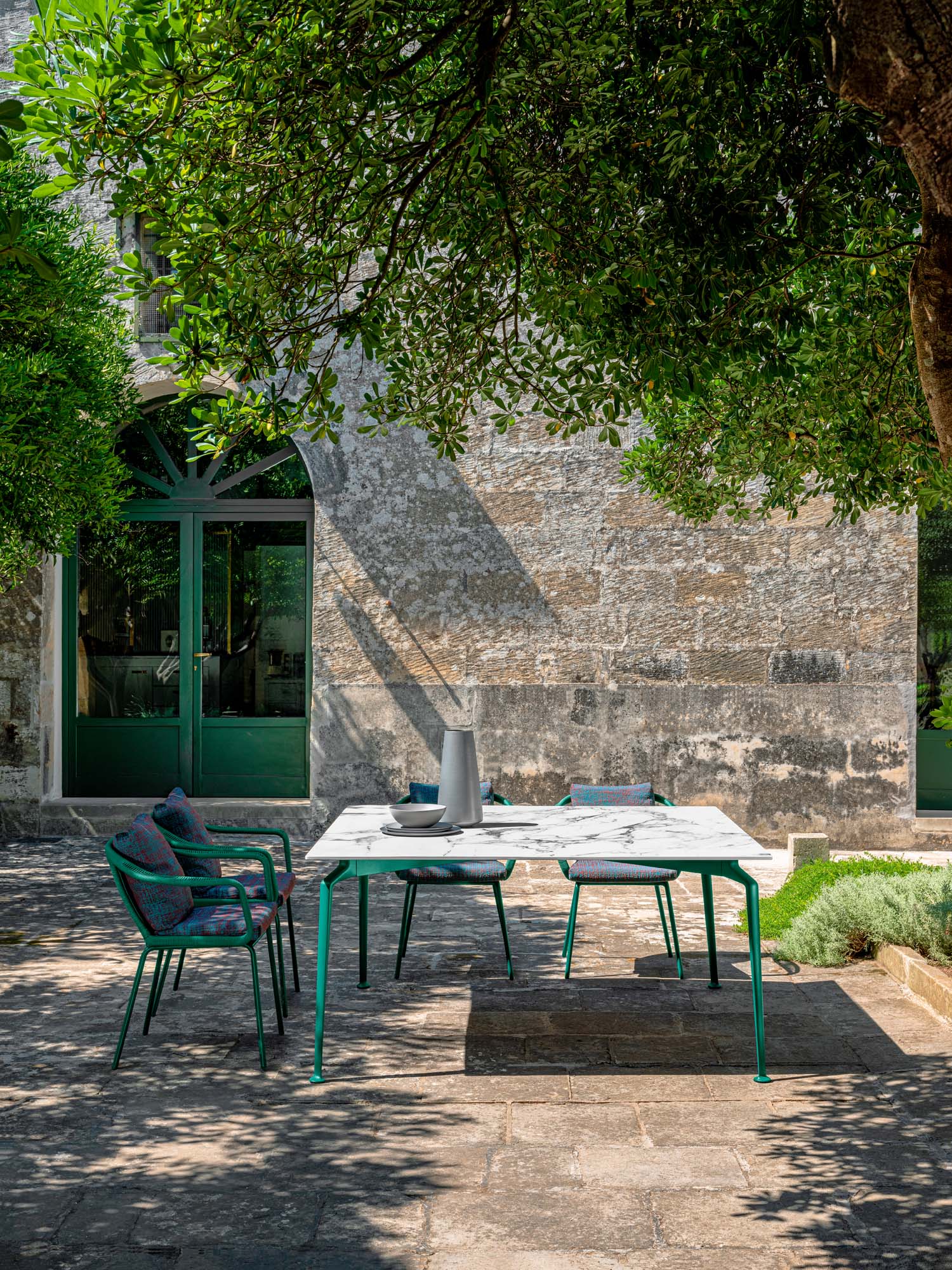 La resistencia a los agentes atmosféricos y la sostenibilidad con características imprescindibles. Por eso, buena parte de nuestra producción se centra en materiales fáciles de reciclar. Además de las maderas como la teca con certificado FSC y la Accoya, una madera blanda de rápido crecimiento, sometida a un proceso de tratamiento atóxico, utilizamos aluminio, versátil y reciclable hasta el infinito, acero, muy resistente a la corrosión, y cemento de elaboración artesanal. Para los tableros de nuestras mesas optamos por materias primas ecológicas que no solo sean resistentes a la lluvia y a los cambios de temperatura, sino también de fácil mantenimiento. Tampoco podía faltar el gres porcelánico, presente en el 70 % de nuestras colecciones, que gracias a su versatilidad brinda una amplia gama de acabados. También está el VittEr, un laminado compacto realizado sin utilizar formaldehído, y las piedras naturales y de lava, esta última con acabado extra glossy obtenido gracias al proceso de ceramización del vidrio reciclado y fundido.