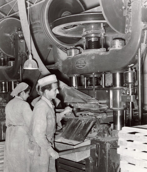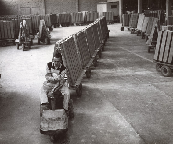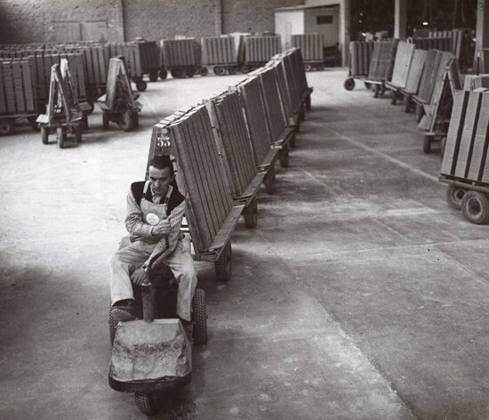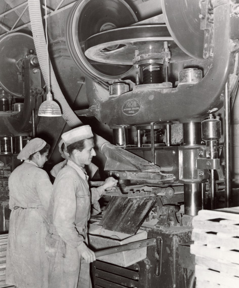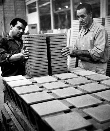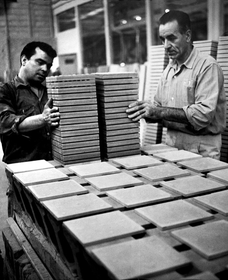 También el volumen que tienen entre las manos tiene como protagonista una superficie plana y cuadrada: la baldosa. En las primeras décadas del siglo XX, este objeto modular, perfecto para la producción en serie, vivió una etapa gloriosa. Basta con contemplar las fotografías tomadas en el interior de las fábricas Marazzi: obreros con mono de trabajo supervisan filas de piezas que entran en un túnel de láminas y salen cocidas, listas para ser pintadas. Una vez empaquetadas, su destino es acabar en los baños y cocinas de los italianos, para hacerlos más higiénicos y habitables. La baldosa, en esas décadas, es una alegoría de la lógica empresarial, orientada al pensamiento racional y a la búsqueda de la eficiencia.