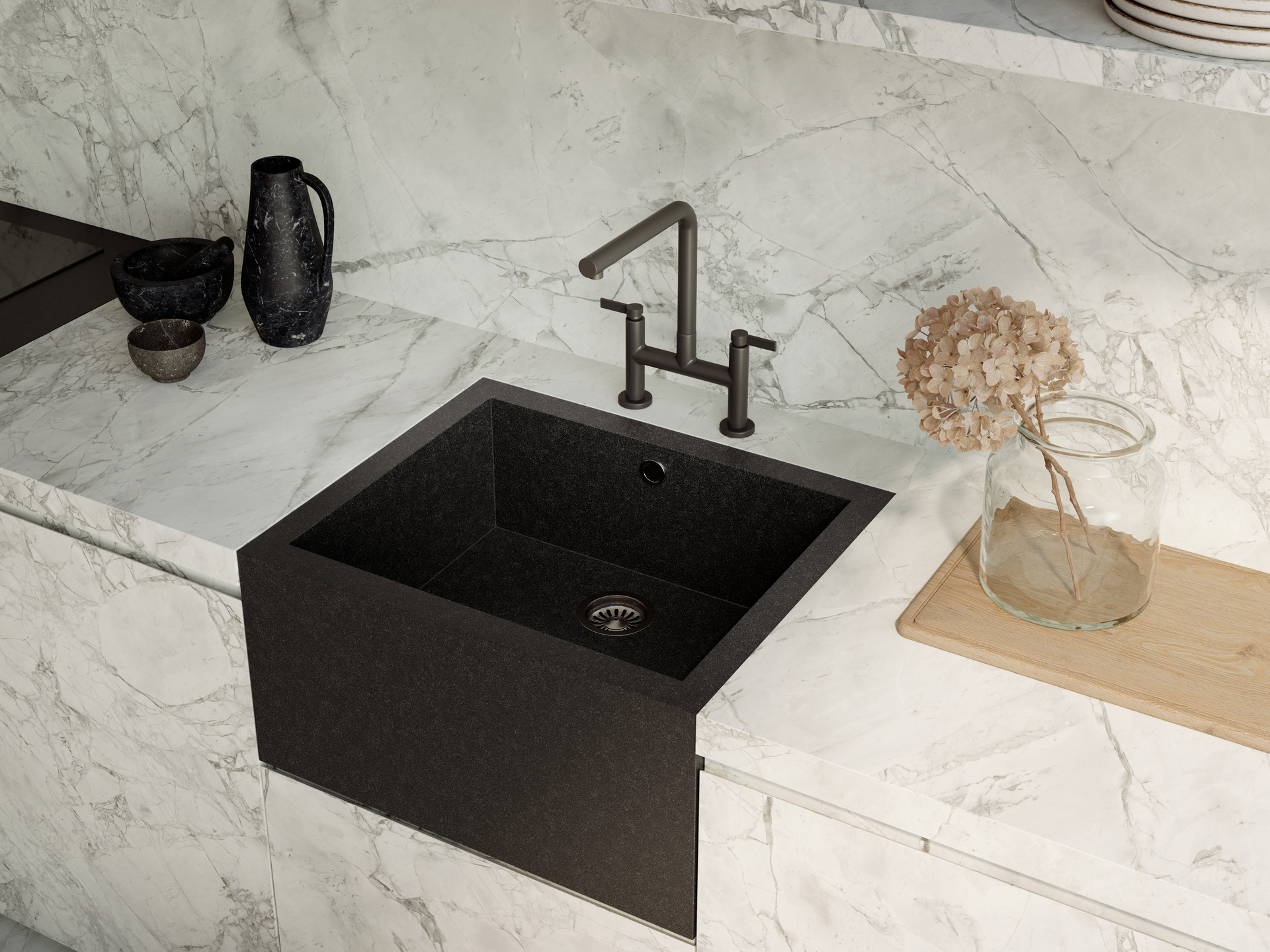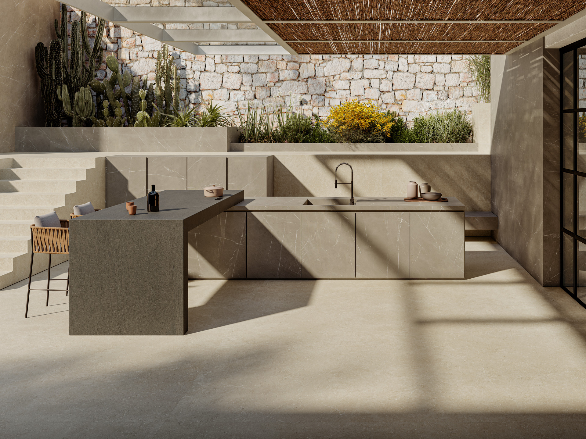 Placas grandes de gres porcelánico que combinar en armonía o en contraste. Marazzi The Top es una herramienta al servicio del diseño de proyectos para realizar encimeras de cocina, salpicaderos, mesas, revestimientos verticales o elementos decorativos utilizando, de modo personalizado, materiales de alta tecnología para satisfacer funciones diversas. El generoso catálogo The Top, que incluye superficies de imitación del mármol, el cemento, la piedra y el metal, y colores plenos, permite crear un diálogo matérico entre los espacios y los elementos de la arquitectura, como por ejemplo entre la sala de estar y la cocina, en parte gracias a las propiedades antibacterianas que incrementan la higiene de las superficies que hayan de entrar en contacto con la comida.