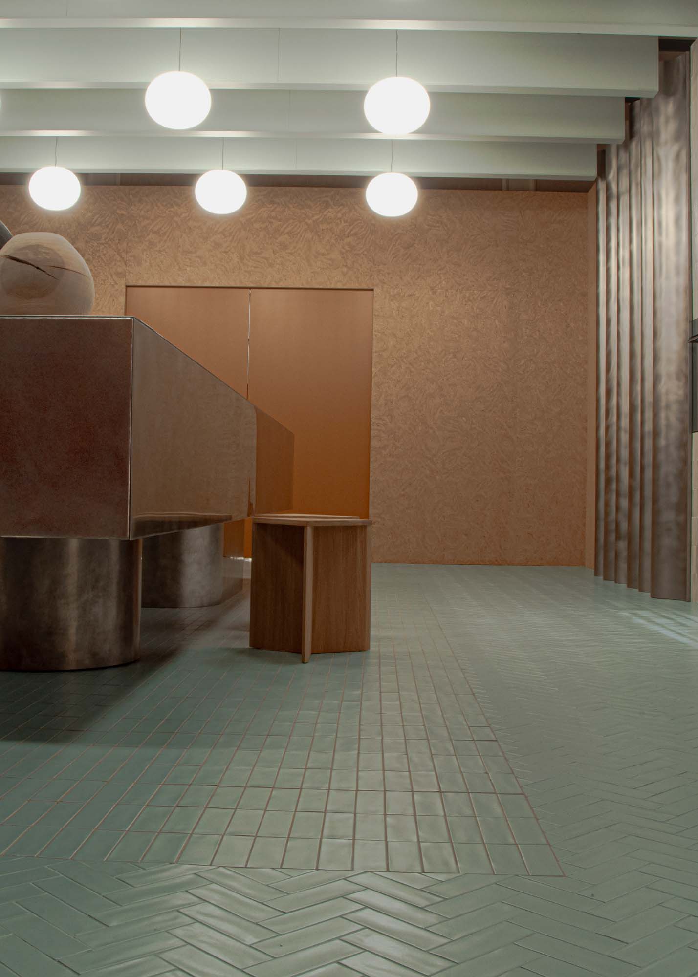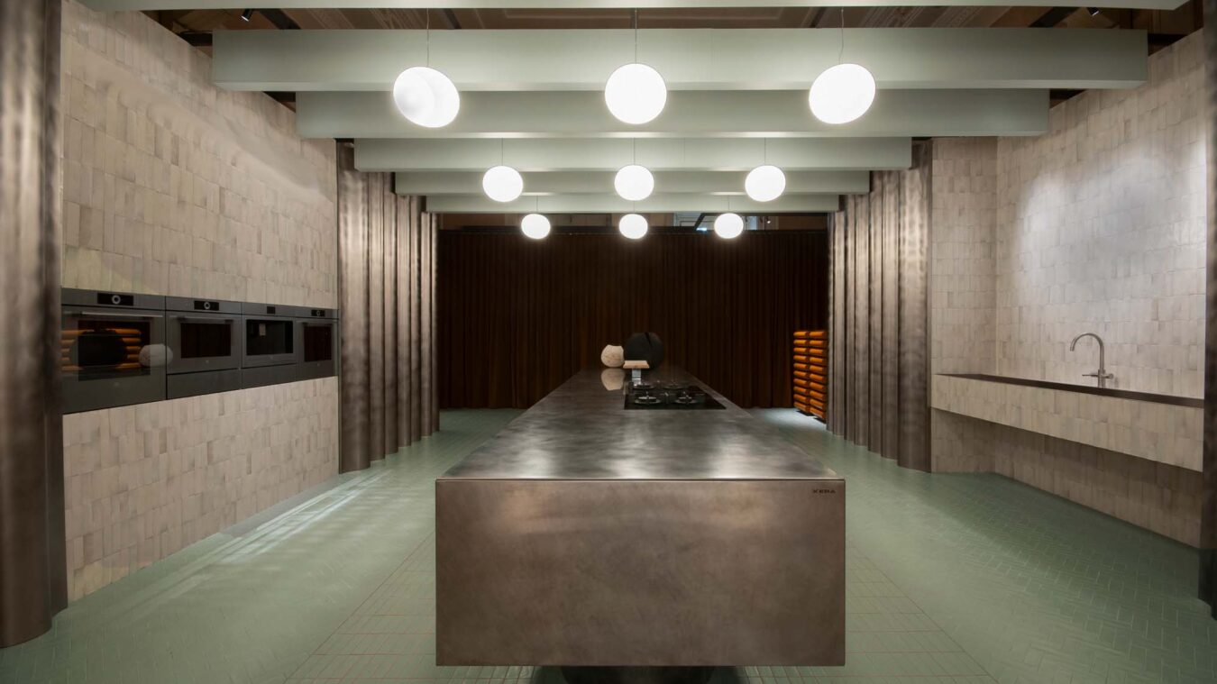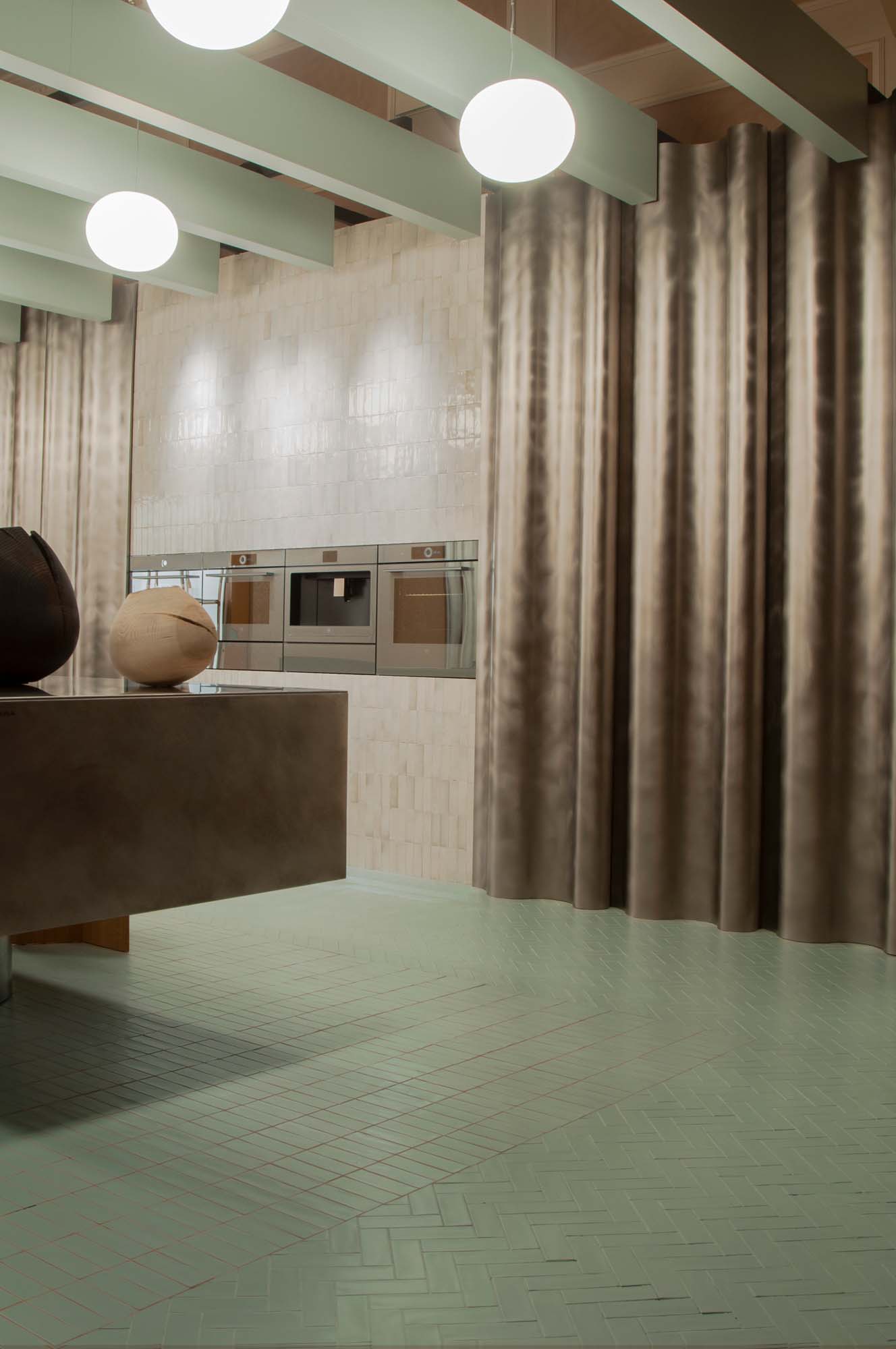 La habitación Superfici muestra una espaciosa cocina. Además de constituir el núcleo del hogar, lugar de socialización íntima, también hace las veces de banco de ensayos en el que probar los materiales, tanto en sus características estéticas como de prestaciones técnicas. Para remarcar la importancia de este ambiente, Ossino ha decidido situar en el centro del espacio una magnífica isla de acero de fuerte impacto visual. El monolito está circundado por los materiales cerámicos de la serie Crogiolo de Marazzi. Azulejos de formato pequeño, de estética cálida que evoca lo hecho a mano, en contraposición con las formas geométricas netas y la atmósfera más minimalista de la isla central.