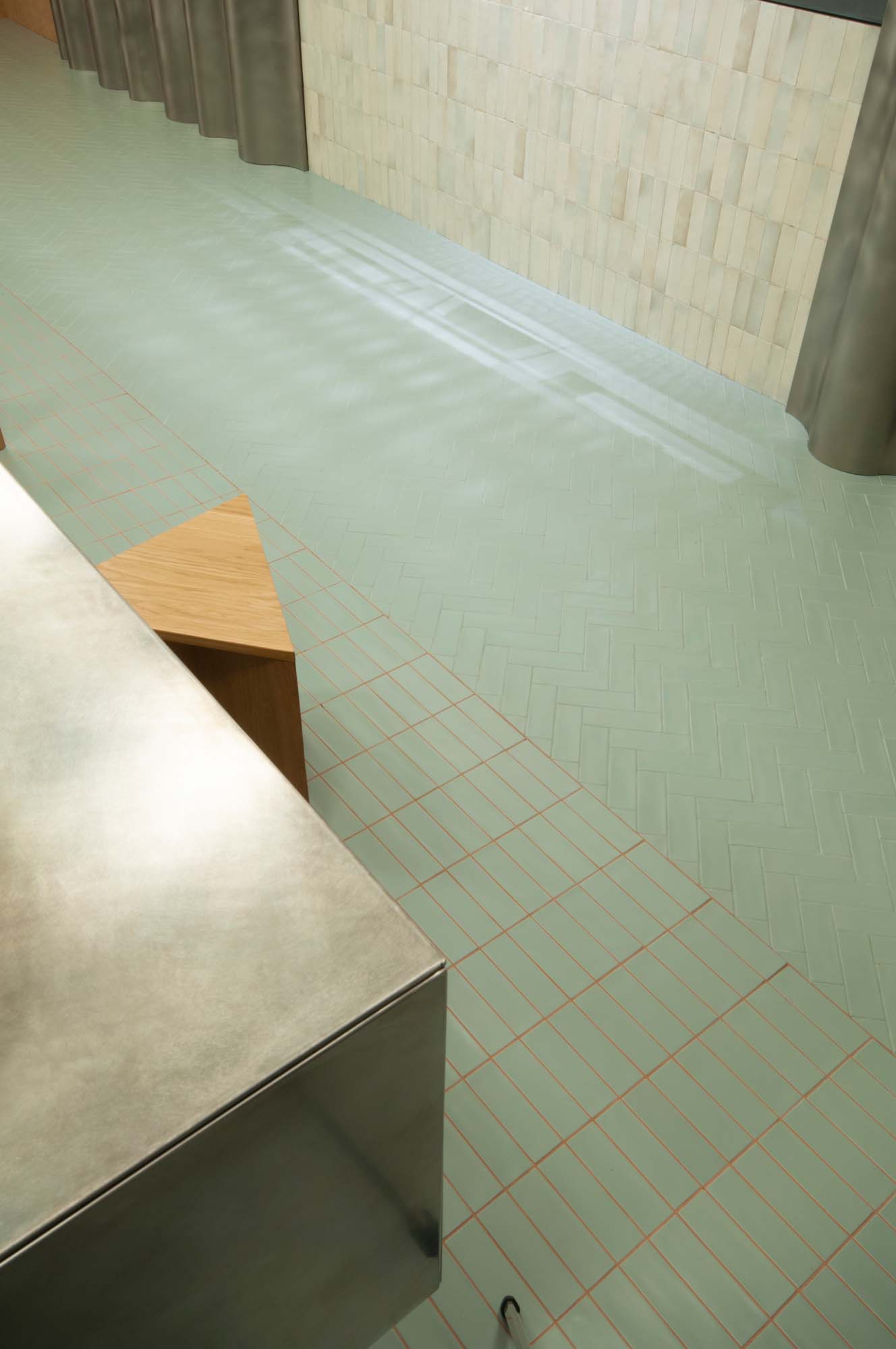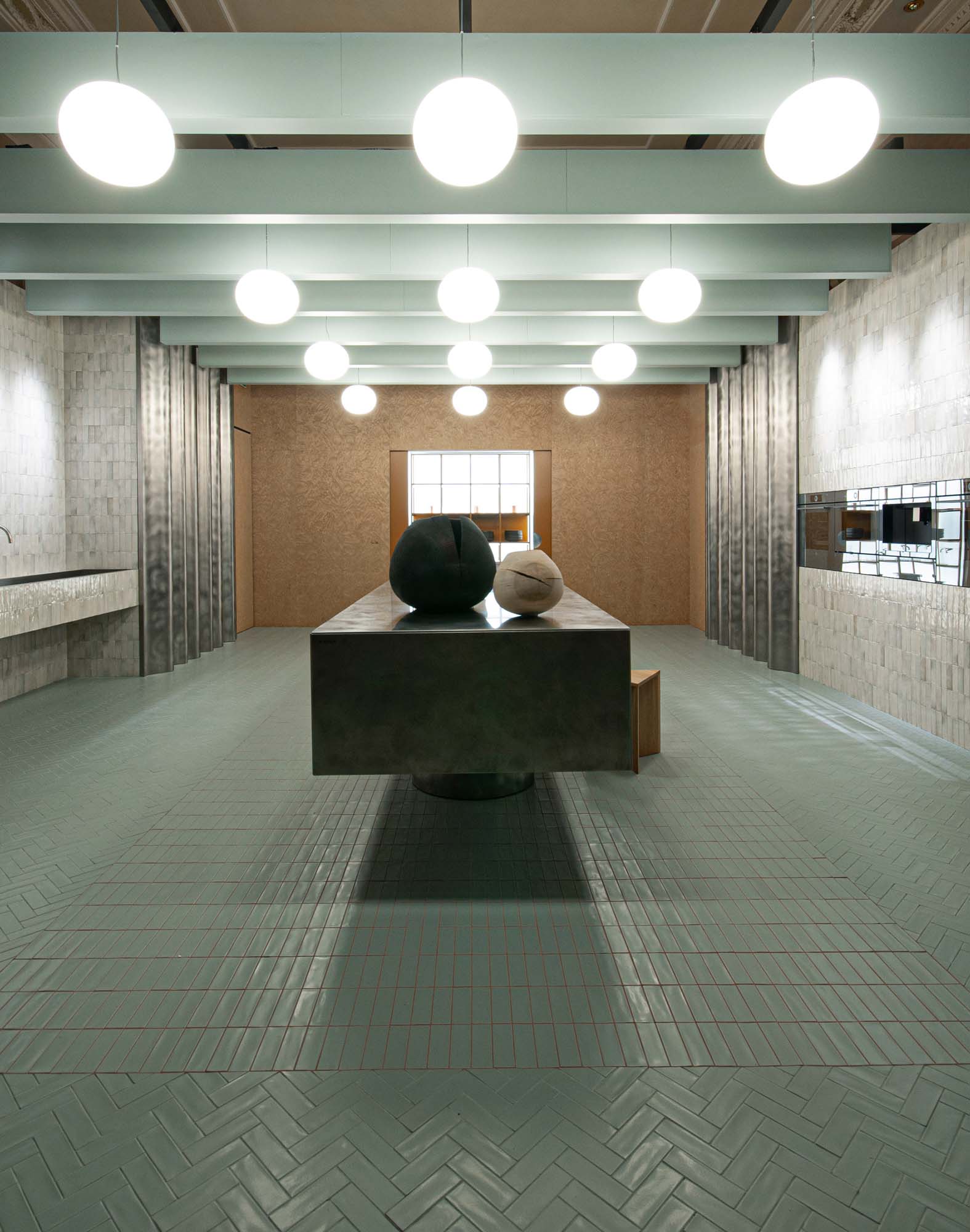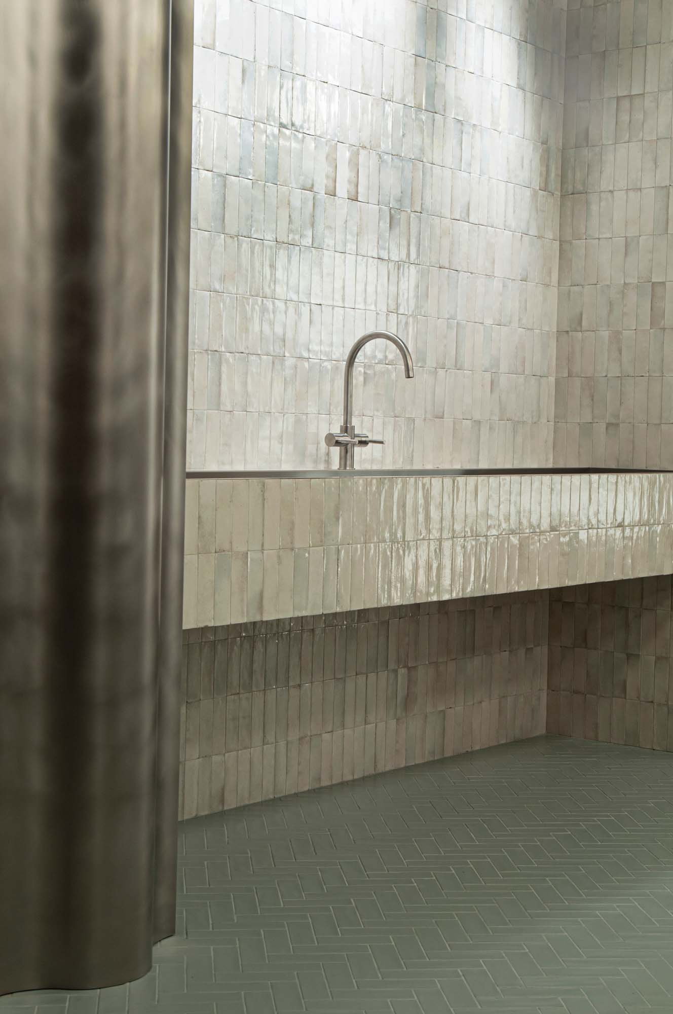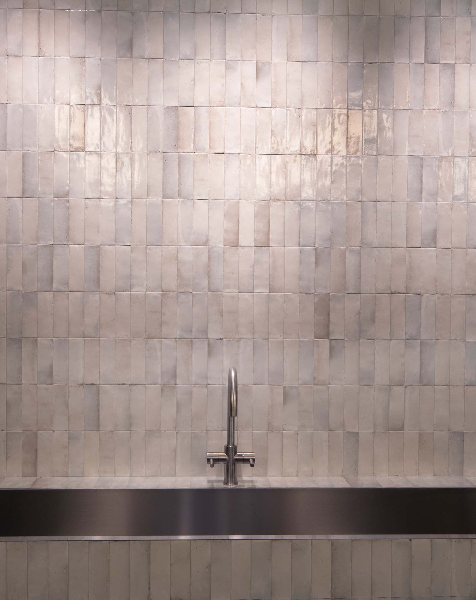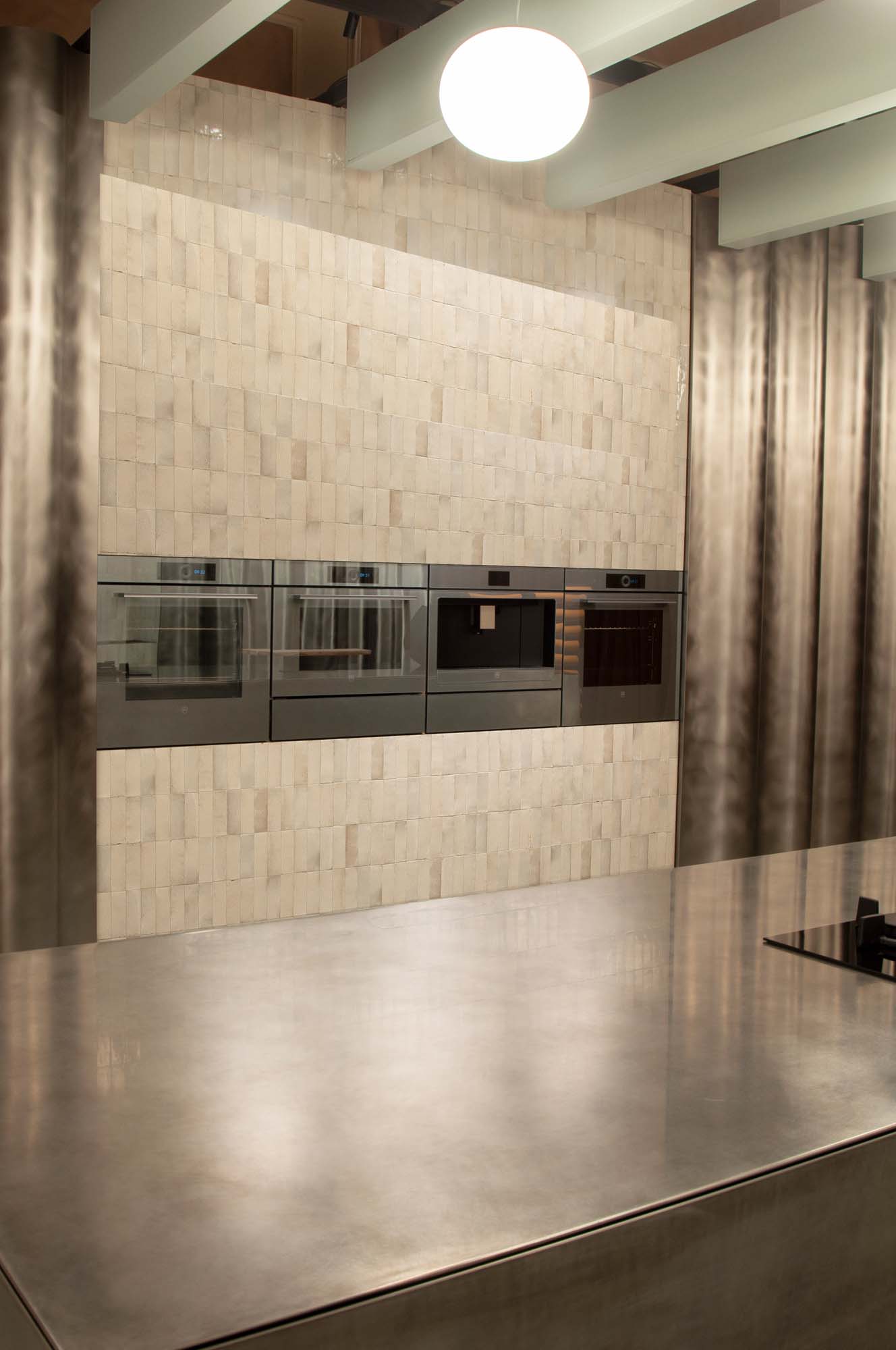 Este efecto se ve resaltado asimismo por el solado con la colección Confetto, dispuesto tanto en espiga como en línea recta, creando una alfombra central con juntas en contraste. Entre los doce colores disponibles, Ossino ha optado por el color Azzurro, que juega con los tonos fríos del acero que, en el gres porcelánico de Confetto, se convierten en una superficie semimate y suave al tacto. Para realizar los revestimientos verticales, desde el suelo hasta el techo, se ha elegido la colección Crogiolo Rice en el color Natural: azulejos rectangulares de formato pequeño de acabado brillante y las superficies deliberadamente irregulares que enmarcan los electrodomésticos empotrados, subrayando de nuevo el contraste entre el efecto de la alta tecnología y la manufactura. El mismo concepto subyace en el revestimiento del amplio fregadero de la isla de acero con Crogiolo Rice. Como ha destacado Ossino: los contrastes y la coexistencia de materiales diversos determinan superficies inéditas en geometrías escultóricas.