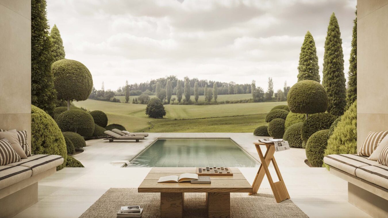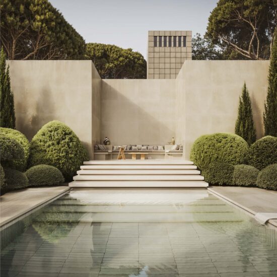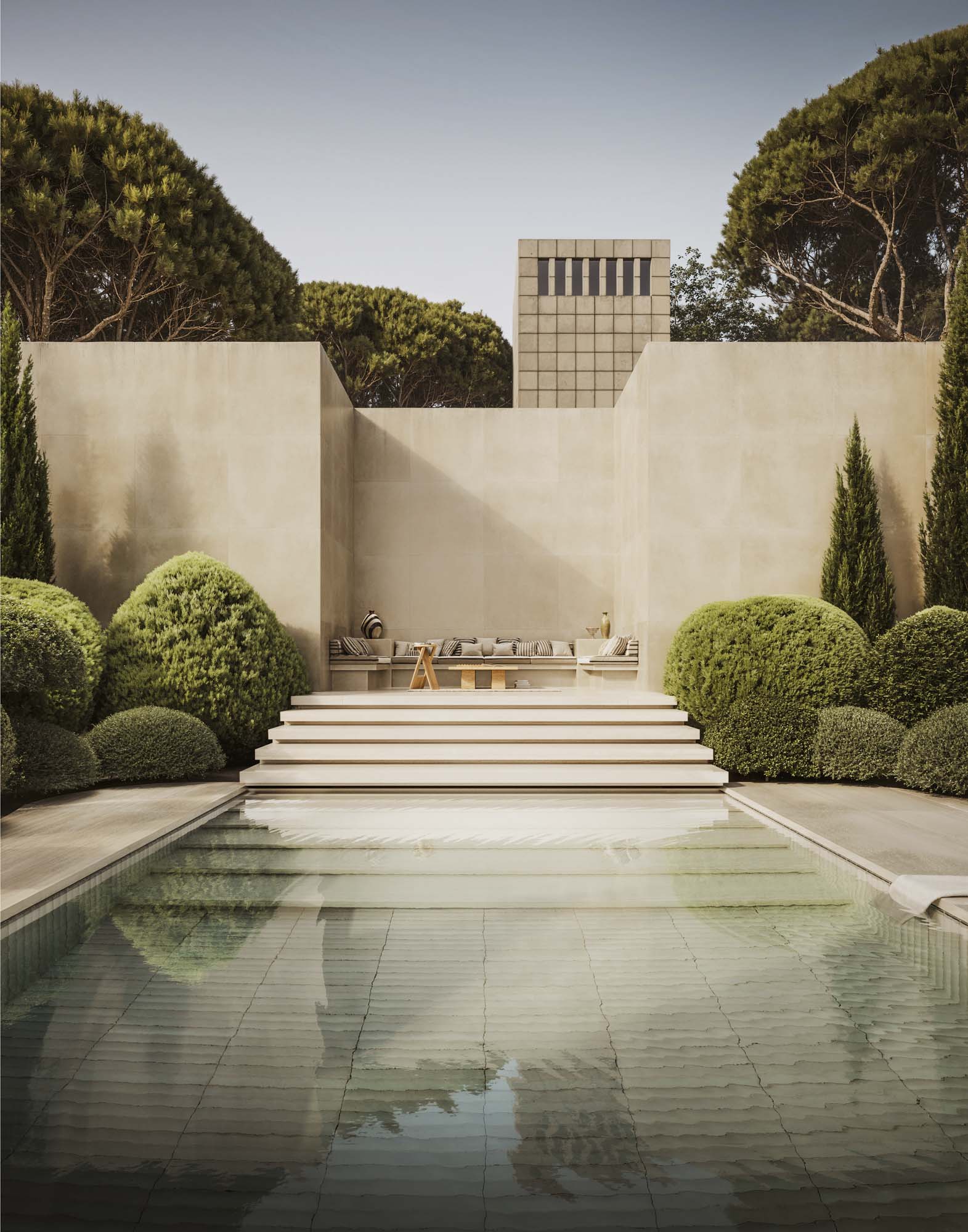 En el jardín, Charlotte Taylor imagina una extensión fluida de la casa, inspirada en los paisajes toscanos, donde los escalones, la piscina y las amplias vistas crean una atmósfera mediterránea sin límites definidos entre interior y exterior. En este espacio, Objects of Common Interest reflexiona sobre el jardín como un lugar de libertad y memoria, un rincón de naturaleza capaz de transmitir identidad y vínculos de generación en generación.