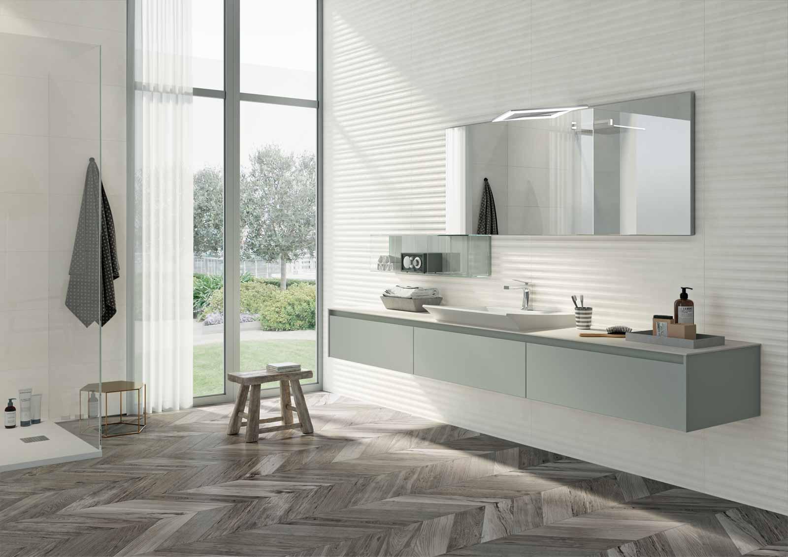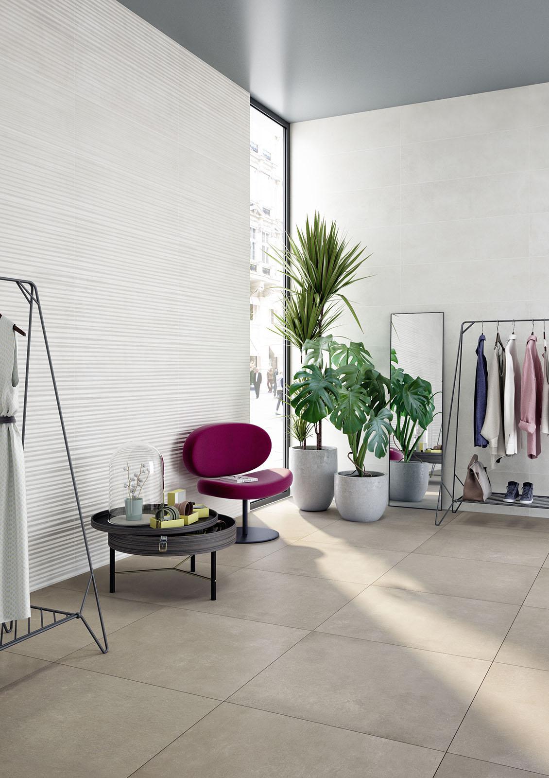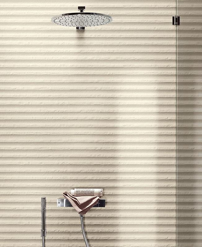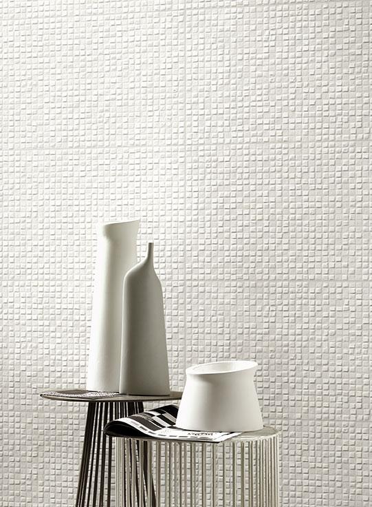 Son cerámicas de grosor reducido y de formato grande: la colección Essenziale, revestimiento completamente blanco, para los amantes del estilo minimalista, actualmente también en las nuevas versiones estructuradas Ars y Micromos y con el acabado metal; Oficina7, una colección original y creativa disponible en una vasta gama de decoraciones y colores.
