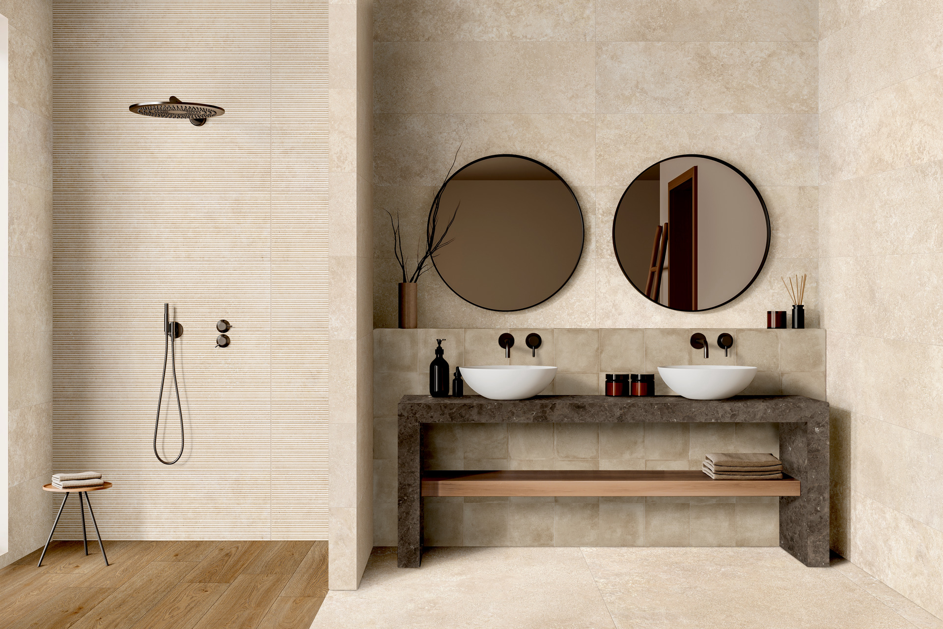 Los azulejos que imitan los matices naturales de la piedra y la arena son perfectos para un diseño minimalista. Las tonalidades neutras se combinan bien con los elementos de madera, las plantas y las luces tenues, y contribuyen a crear un baño de aspecto relajante y sofisticado.