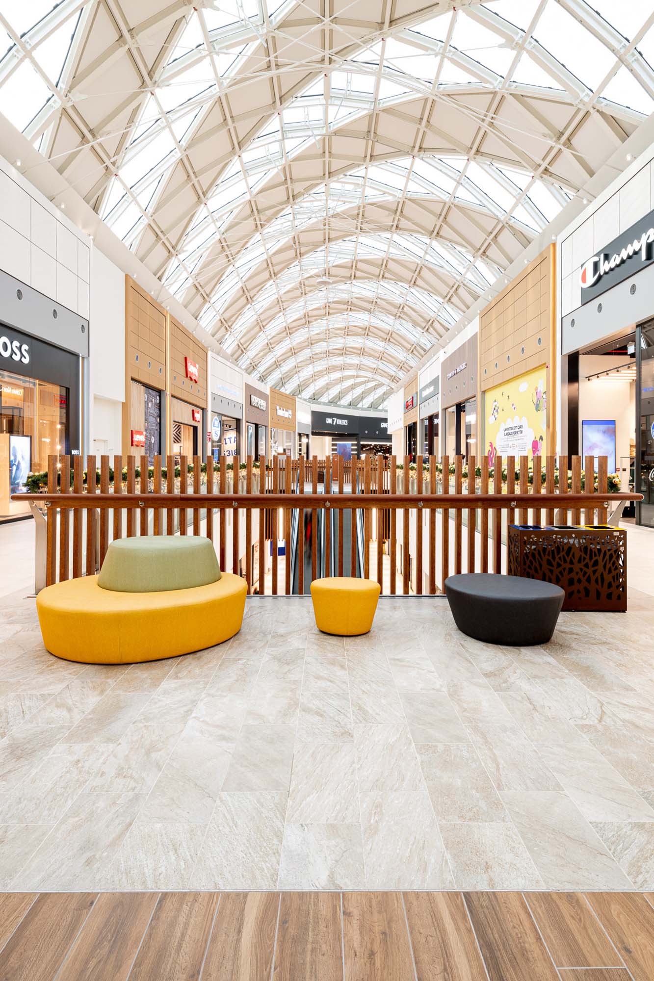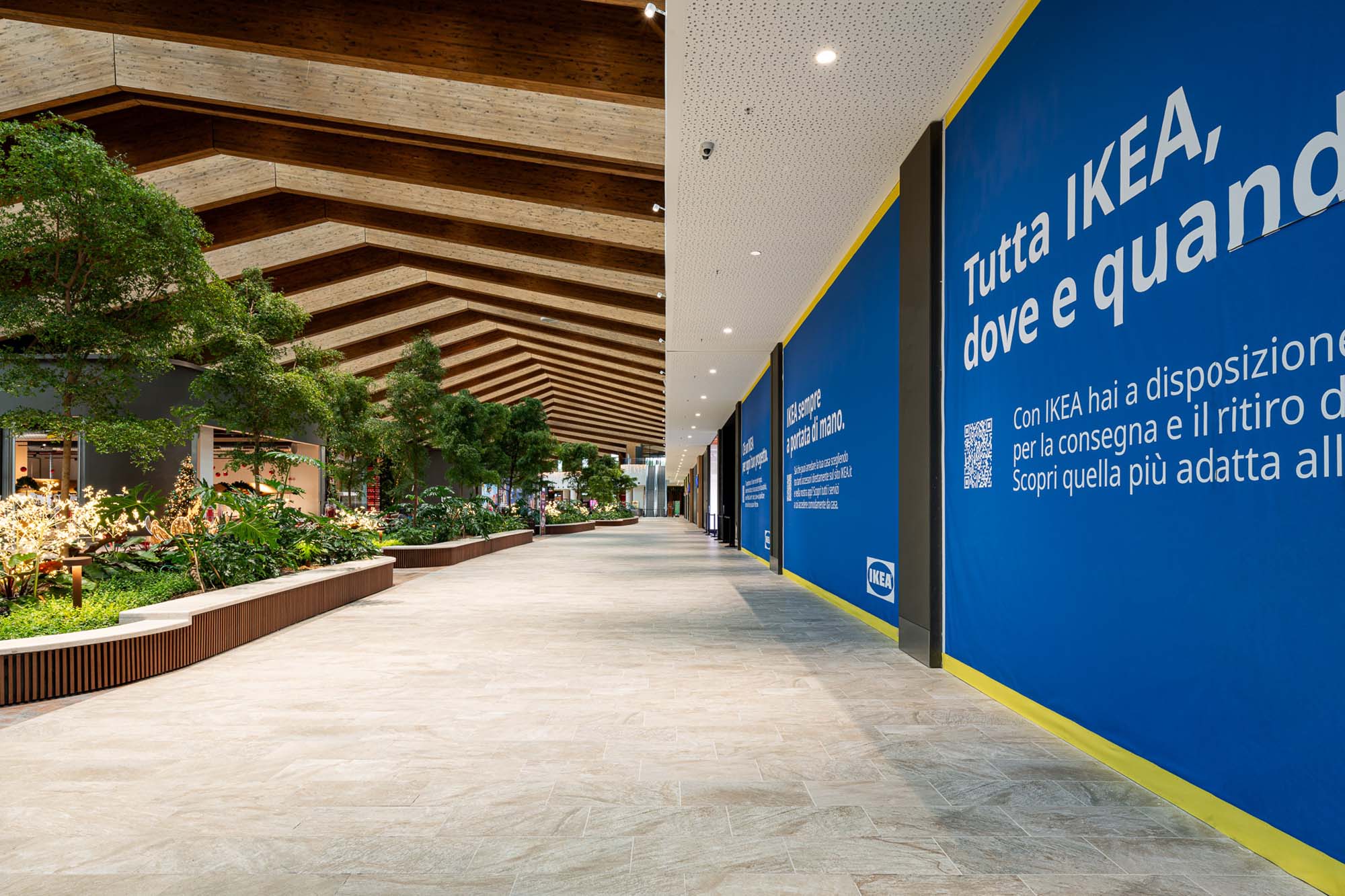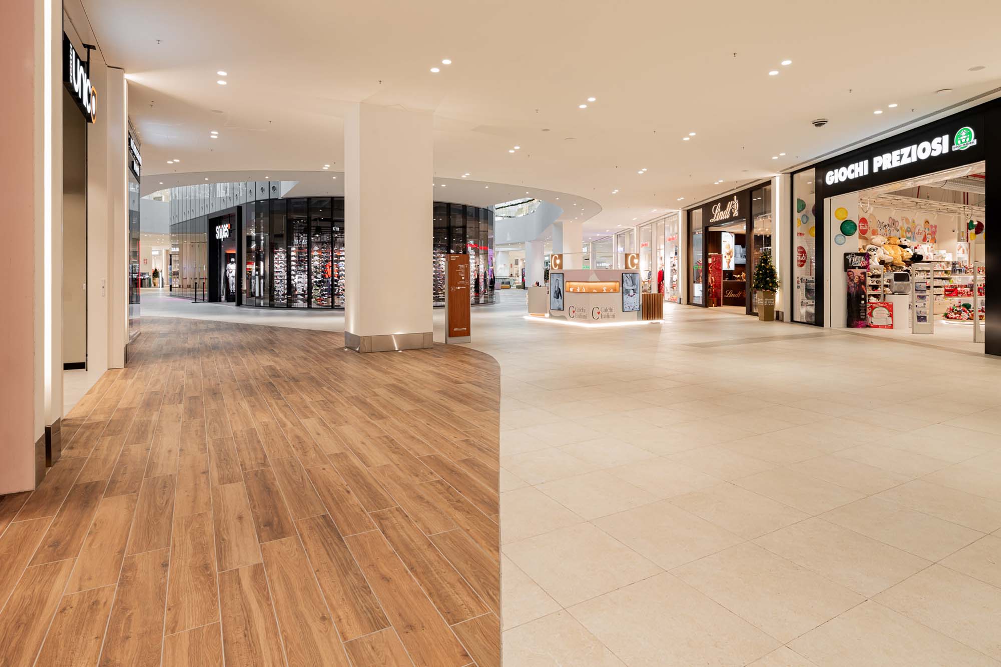 Los pasillos de las galerías, a los que se asoman las tiendas insignia de las numerosas marcas alojadas en Merlata Bloom, así como el gran multicine, se ven ritmados por los azulejos de la serie Rocking, siempre junto a las texturas de inspiración natural de la colección Treverkview, con superficie estructurada, en las versiones Multicolor —inspirada en la heterogeneidad de las piedras naturales— y Beige. Tales azulejos, en la versión de 20 mm de grosor, acompañan al visitante en los espacios públicos del exterior del Life Style Centre, convirtiéndose en el módulo compositivo de las áreas al aire libre.