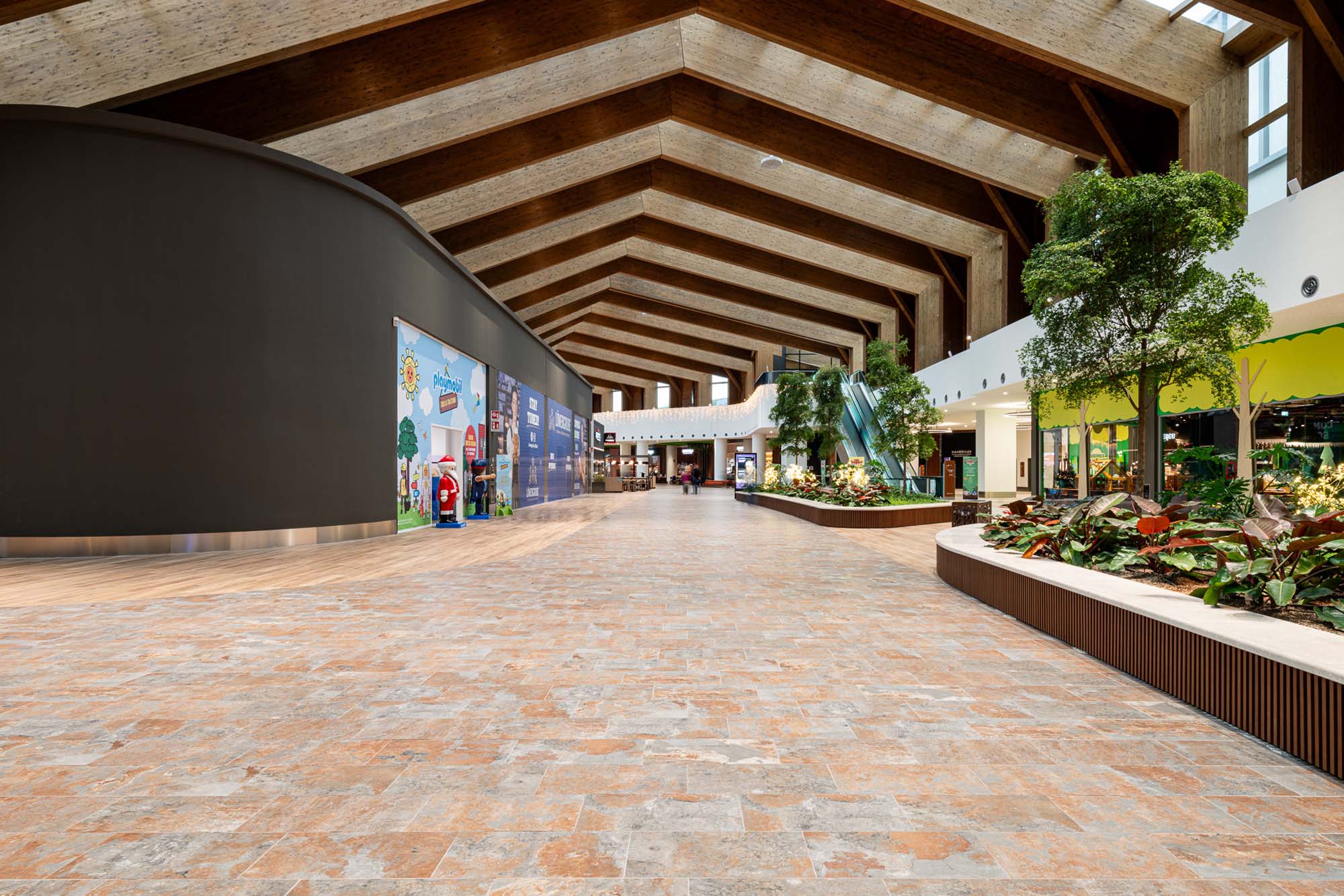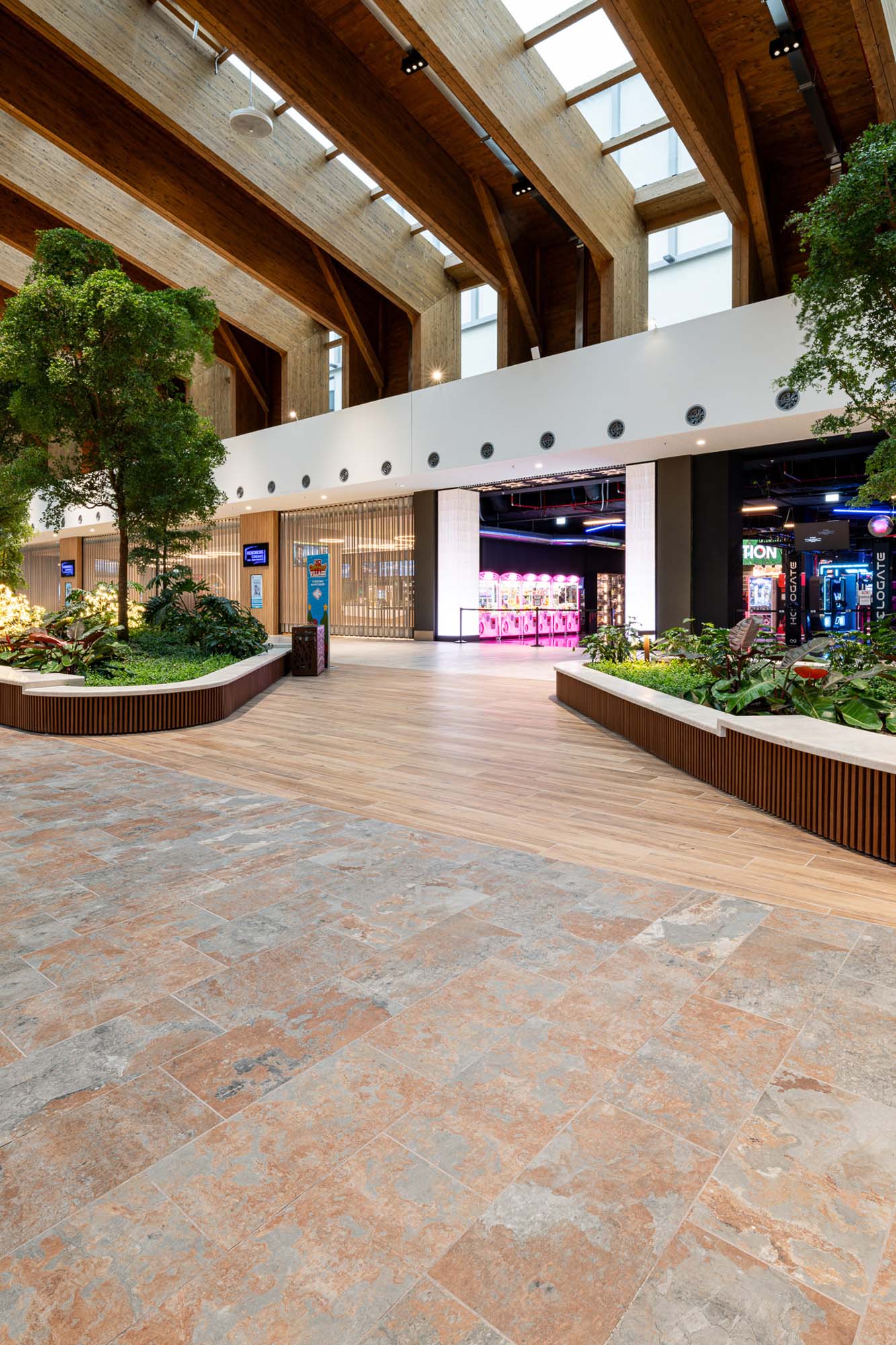 En las galerías, las texturas inspiradas en varios tipos de madera de Treverkview se ven flanqueadas por amplias islas y paseos revestidos con la colección de imitación de la piedra Mystone Limestone, en las suaves tonalidades Ivory y Sand.
