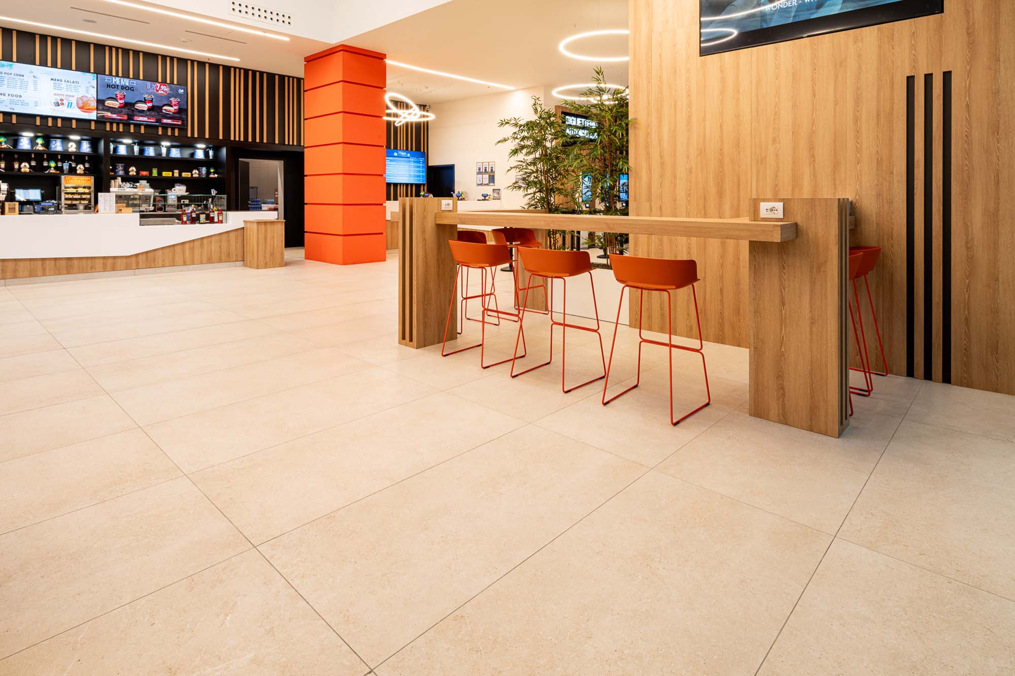 Muchas de las superficies del interior de los espacios comerciales se han solado con colecciones de gres porcelánico de Marazzi.