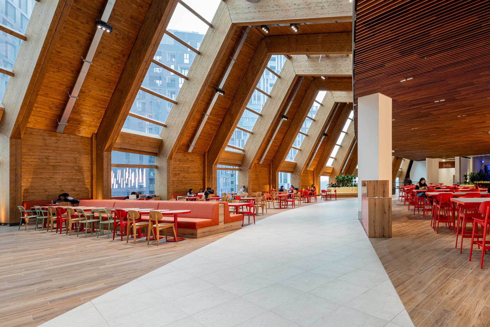 Las plazas públicas de acceso, las terrazas que crean la conexión visual entre el interior y el exterior, así como la profusa utilización de materiales naturales como la madera estructural y los pavimentos de gres porcelánico, además de la plantación de verde en numerosos espacios interiores, facilitan la conexión con los espacios urbanos sin solución de continuidad.