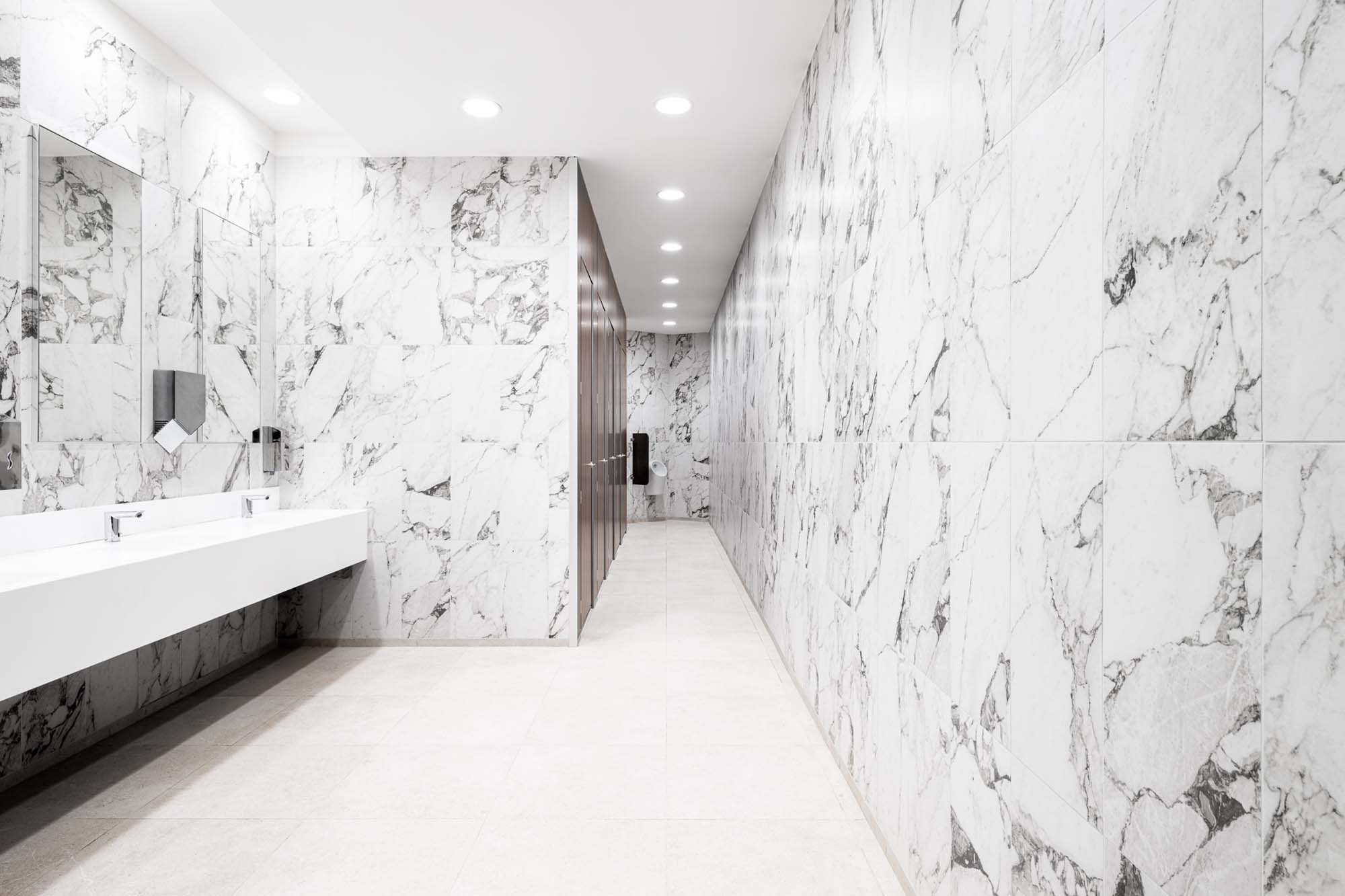 En los baños, la combinación de las placas Allmarble, en las versiones Calacatta Extra y Elegant Black, con acabado brillante, crean espacios elegantes y luminosos.