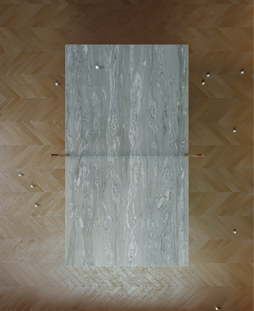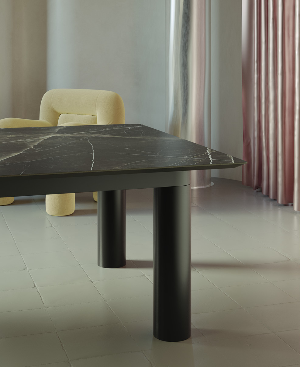 Las patas de las mesas ofrecen 5 variantes: Partitina 0-1 tiene patas redondas y monolíticas; Partitina 0-2, cuatro patas en semicircunferencia; Partitina 0-3, cuatro soportes en las esquinas, con pintura en polvo para permitir su uso en exteriores; Partitina 0-4 presenta una base más compleja, con elementos de madera de cedro o de teca, para poder utilizarla en exteriores; por último, Partitina 0-5, cuenta con una cortina de tela personalizable que oculta la parte portante, en un guiño a las cortinas que cubrían la alacena en las cocinas de antaño. No en vano, la diversión y la ironía son la clave del proyecto. Partitina 0-6, una creación para Lava caracterizada por el equilibrio y la delicadeza, diseñada por Gio Tirotto.