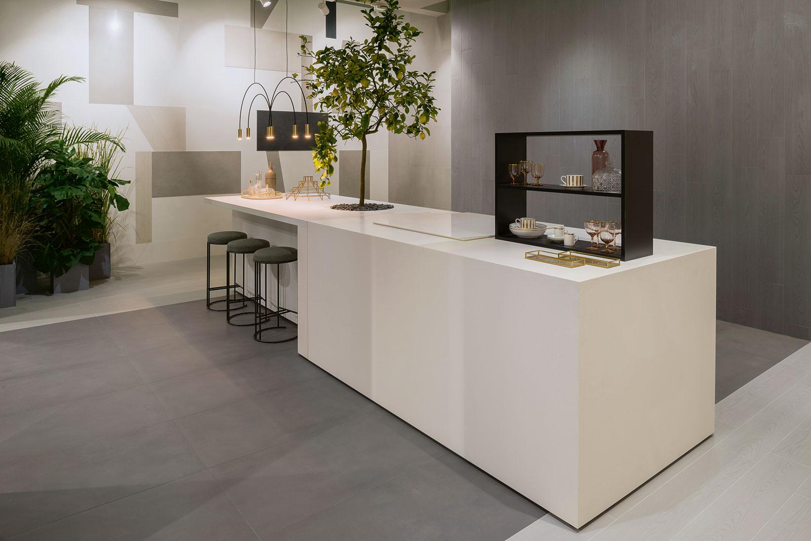 El aspecto satinado, casi encerado, de esta nueva superficie se combina con las superficies natural, pulida y estructurada, que permiten utilizar la colección en diferentes espacios, como revestimiento de suelos y paredes, y en entornos con distintos índices de esfuerzo, incluso los más pesados.