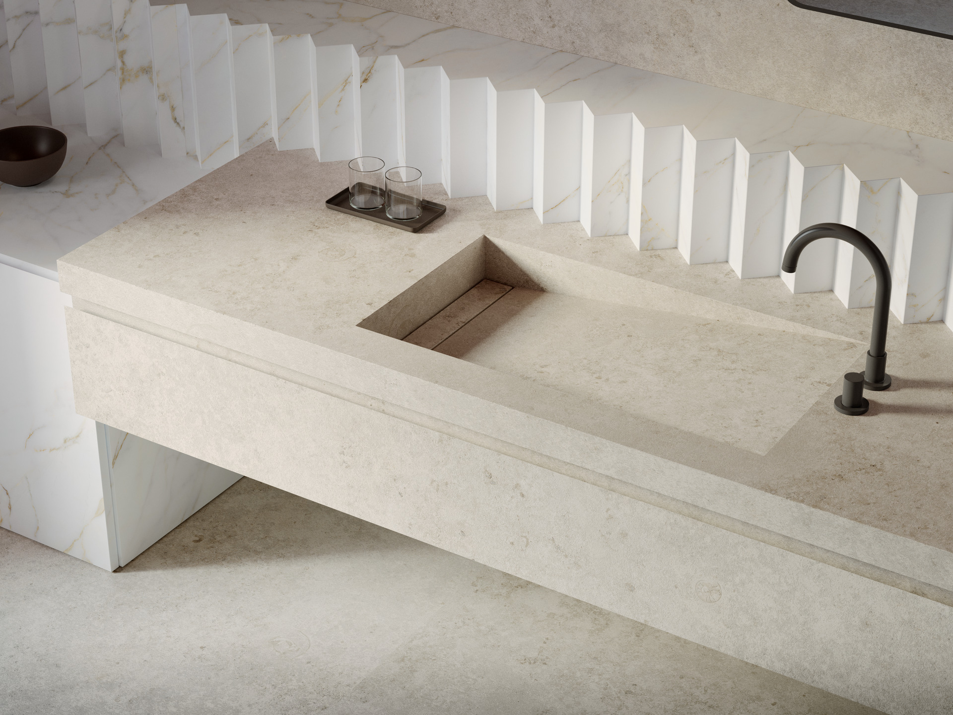 La colección se ve ampliada con una nueva evocación del mármol (Calacatta Supreme), dos imitaciones de la piedra (Jura, articulada en los colores Beige y Grey, e Infinity en el color Anthracite), y la imitación de la madera Oak. Calacatta Supreme se inspira en el mármol de procedencia italiana que se extrae en las montañas de Carrara y presenta vetas preciosas de tonos grises y dorados. La tecnología 3D Ink, aplicada por vez primera al gres porcelánico de imitación del mármol The Top, crea unos ligeros surcos en las vetas, aumentando la profundidad del grafismo.