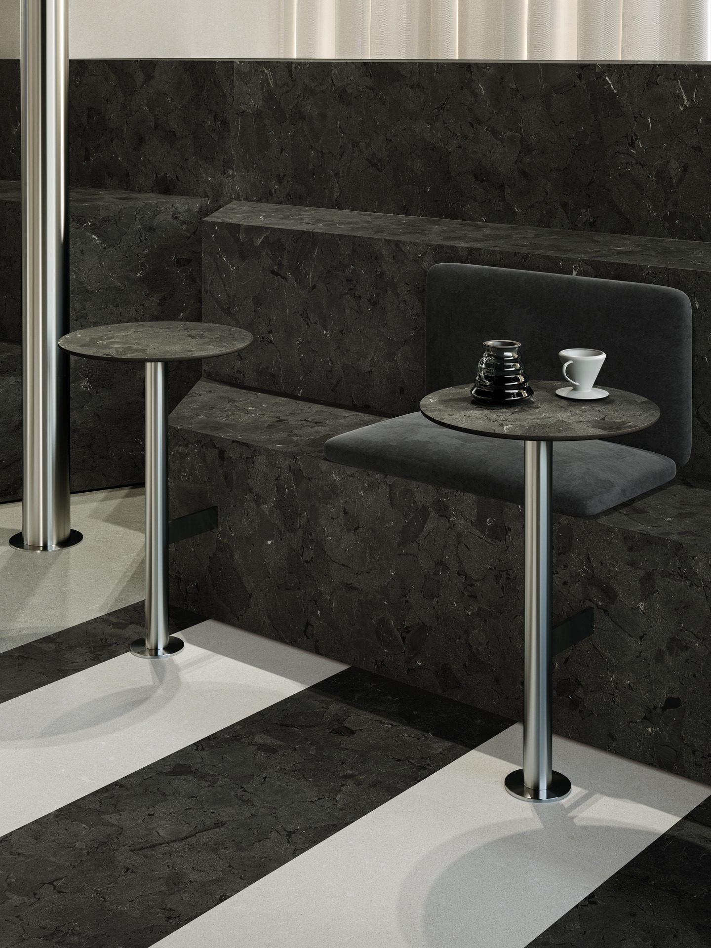 La cuarcita brasileña se ve reinterpretada en la esencia Infinity, disponible en el color Anthracite, oscuro y profundo, con cantos de diferentes tamaños, que se caracterizan por presentar una ligera variación cromática tono sobre tono combinada con vetas ligeras. Las nuevas placas de The Top se realizan siguiendo procesos de elaboración controlados, en fábricas de ciclo cerrado, se sirven de máquinas de vanguardia capaces de reducir al mínimo el empleo de recursos y de recuperar todos los materiales residuales.