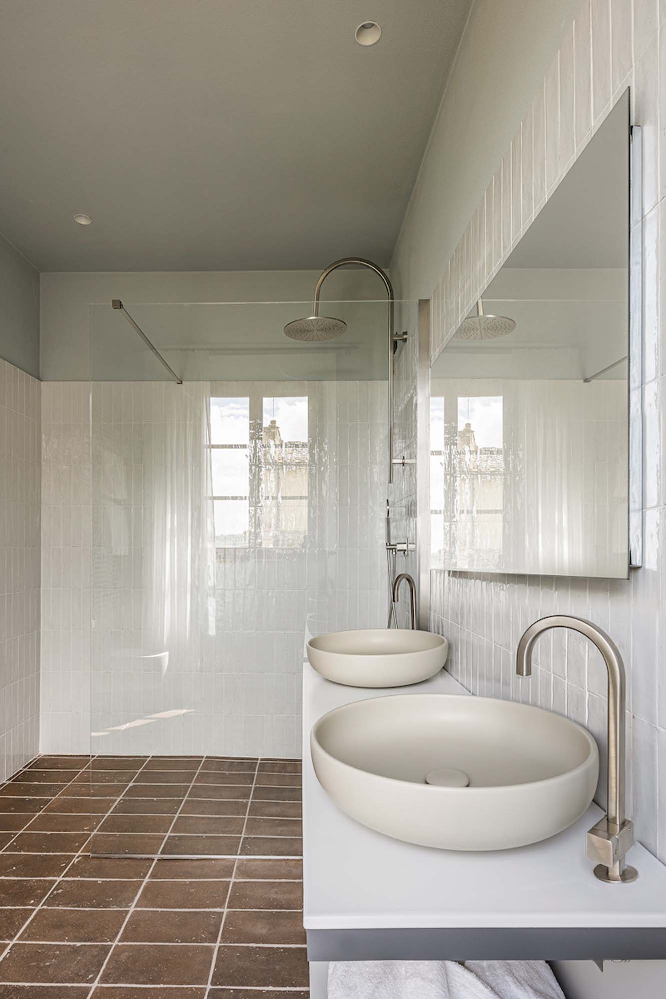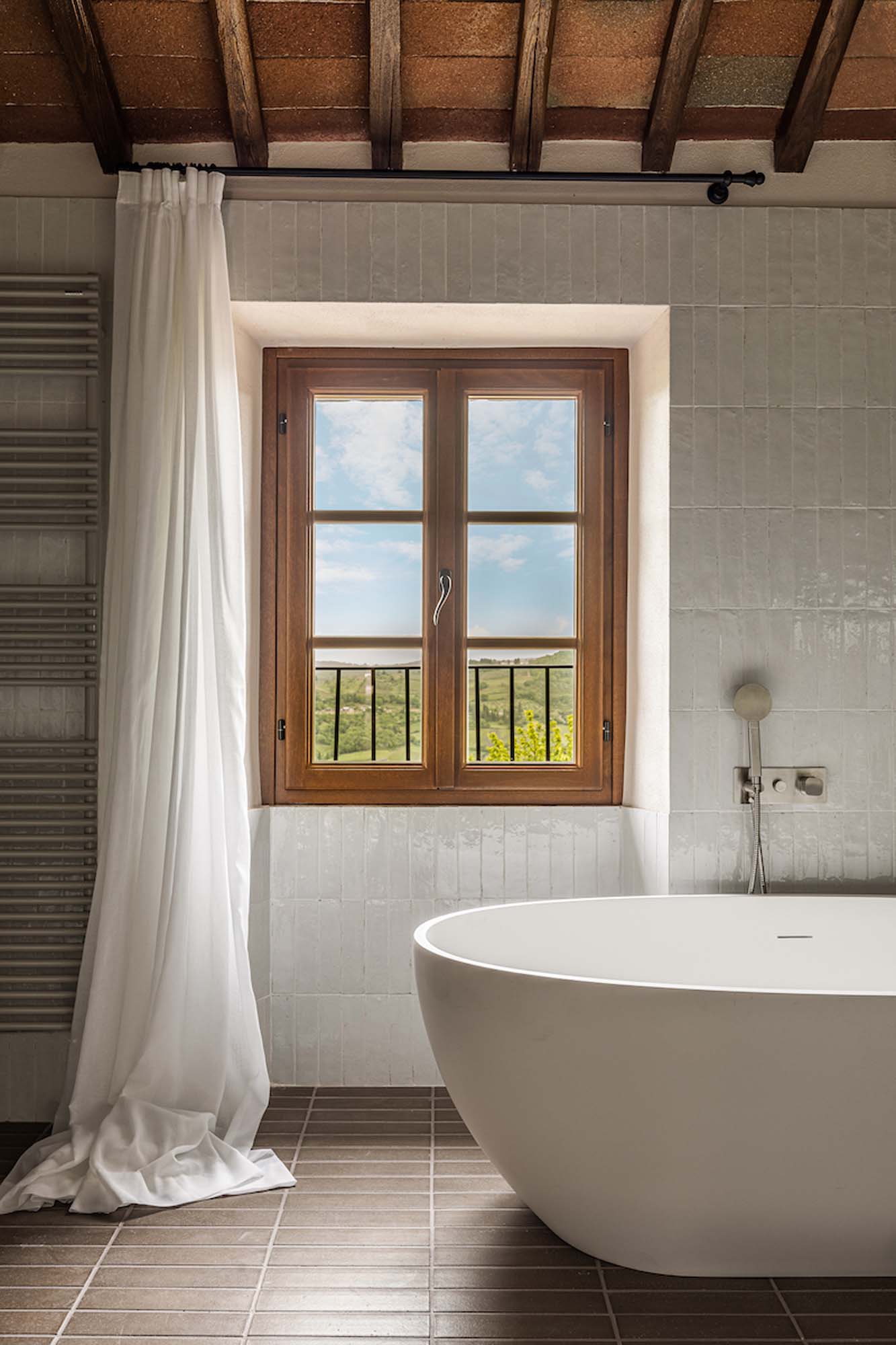 Entre los productos elegidos para resaltar la atmósfera auténtica y refinada del hotel boutique Pieve Aldina destaca el revestimiento de las paredes del baño con Crogiolo Lume de color White, ladrillos de gres porcelánico que evocan la sensación de los azulejos hechos a mano. Esta elección refleja la atención al detalle y la búsqueda de una elegancia atemporal por las que se caracteriza la estética del proyecto. El azulejo superbrillante Lume se combina magistralmente con el cotto original de la residencia y crea un contraste armonioso entre la tradición y la modernidad.