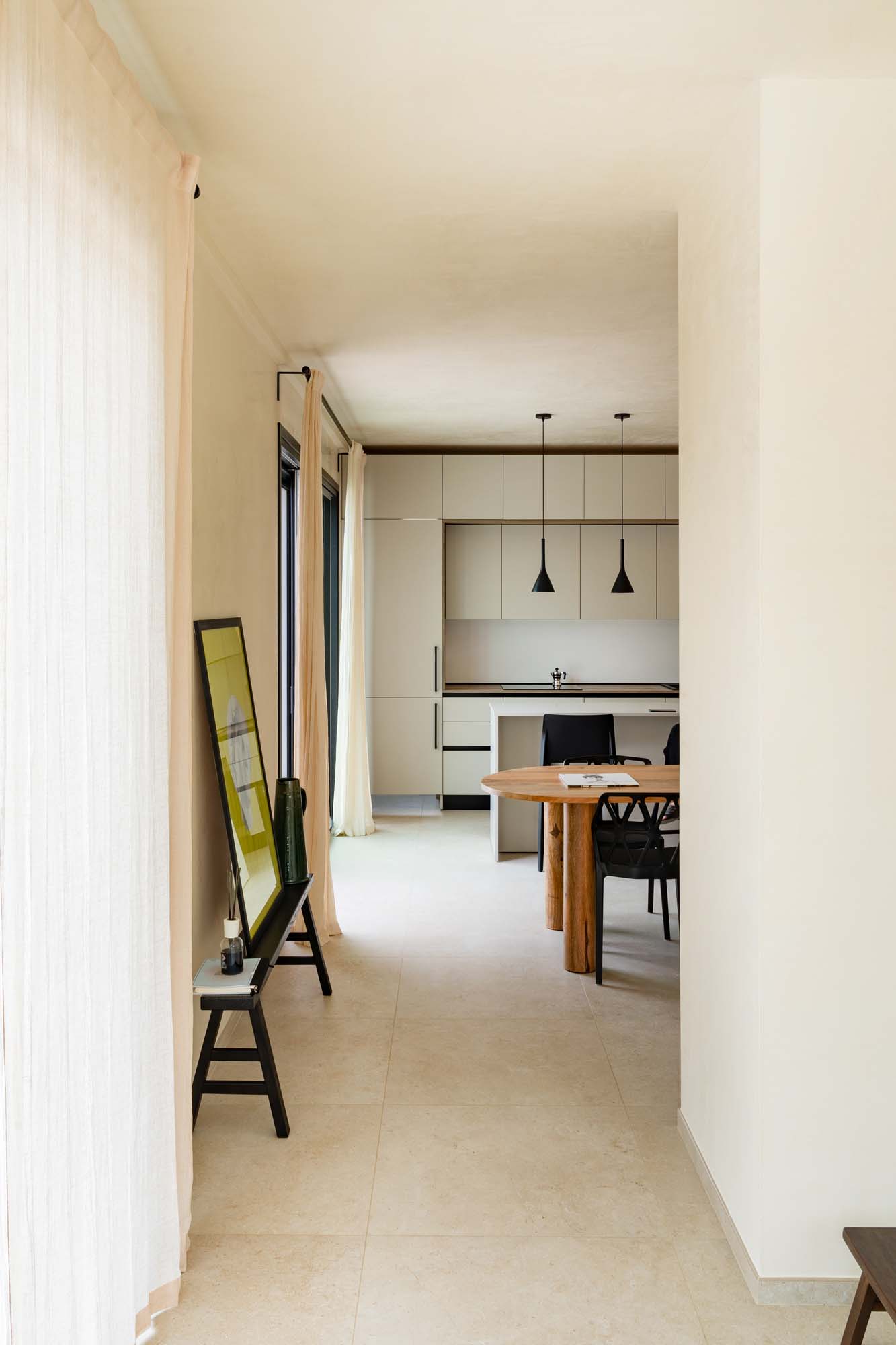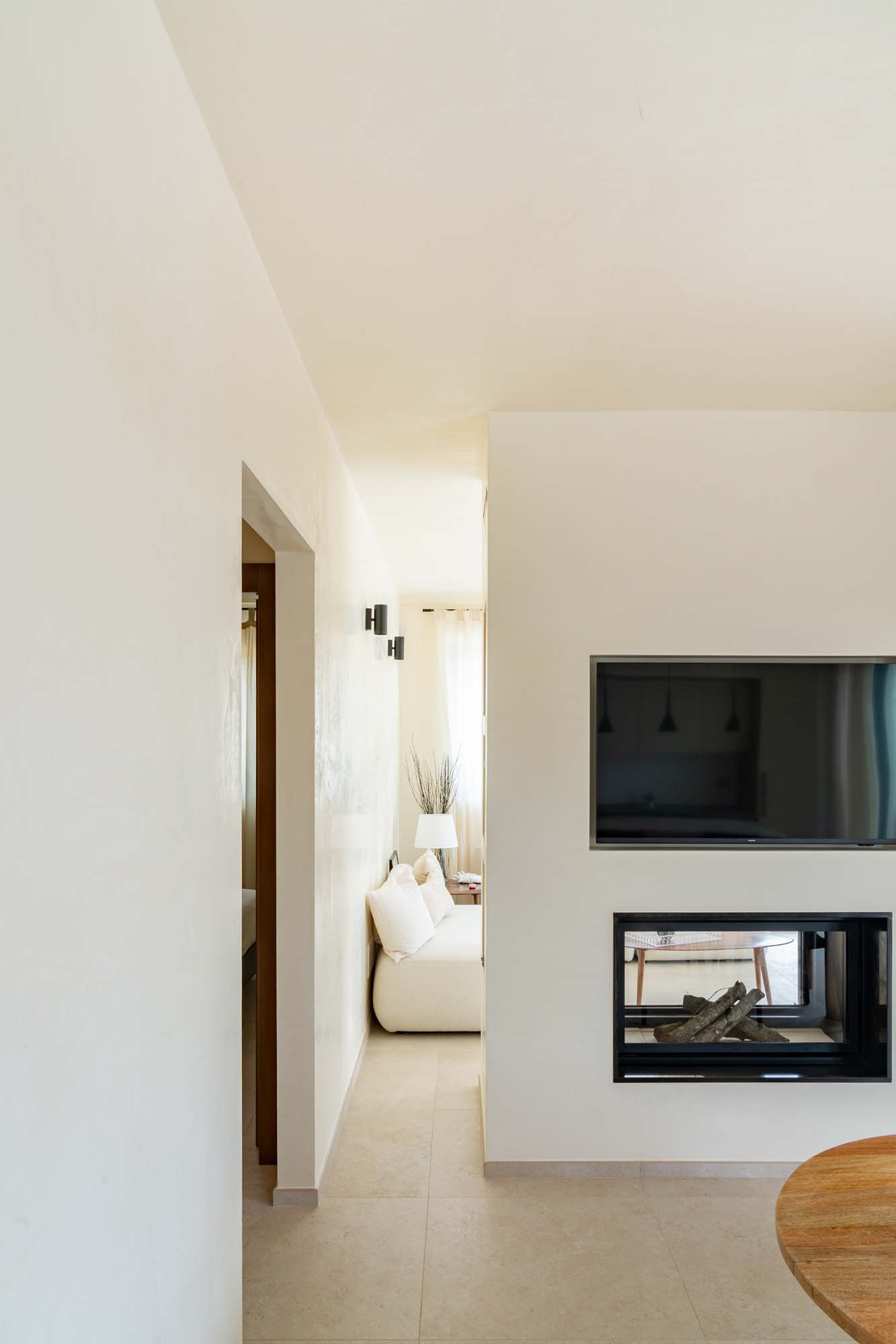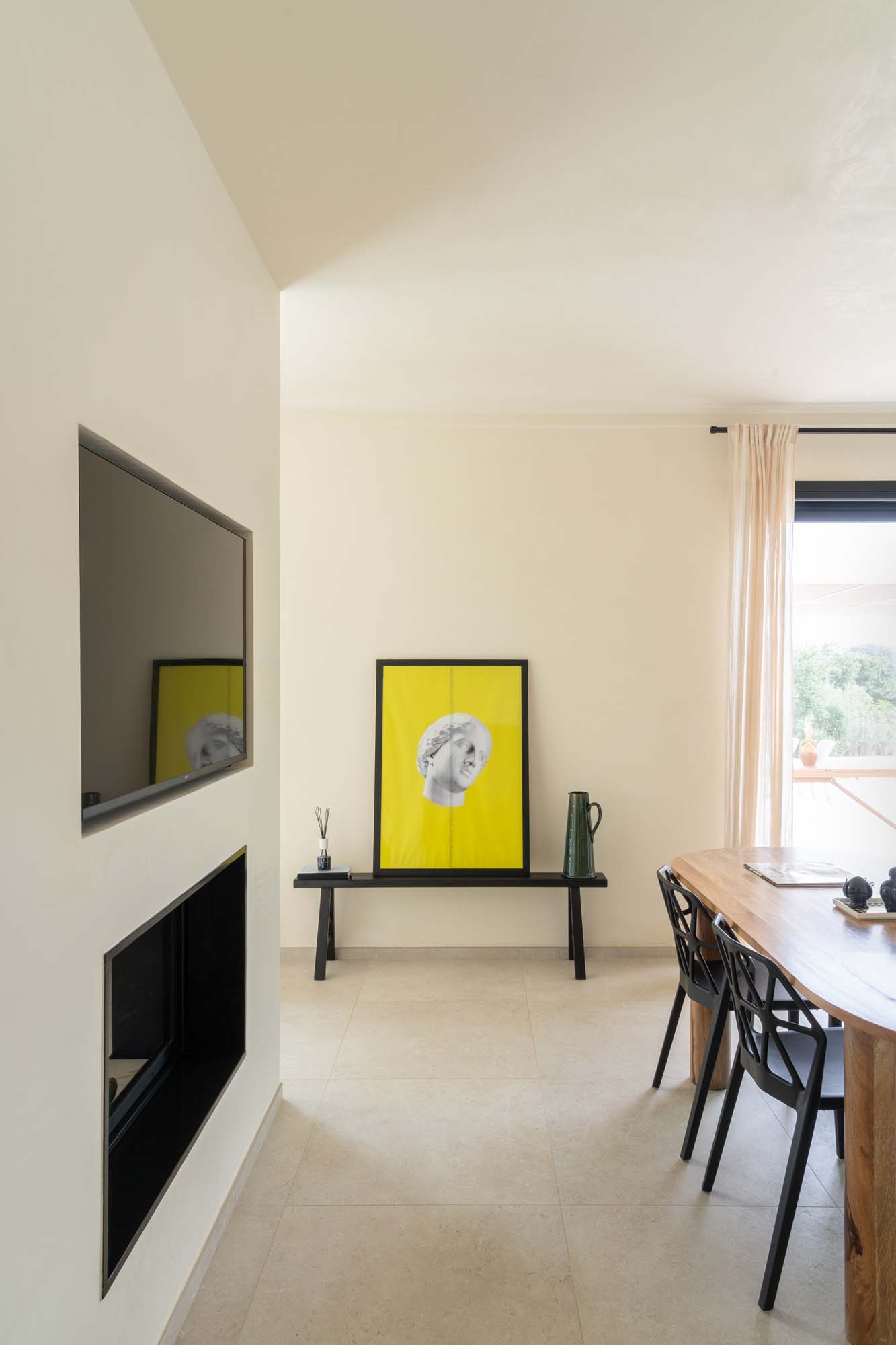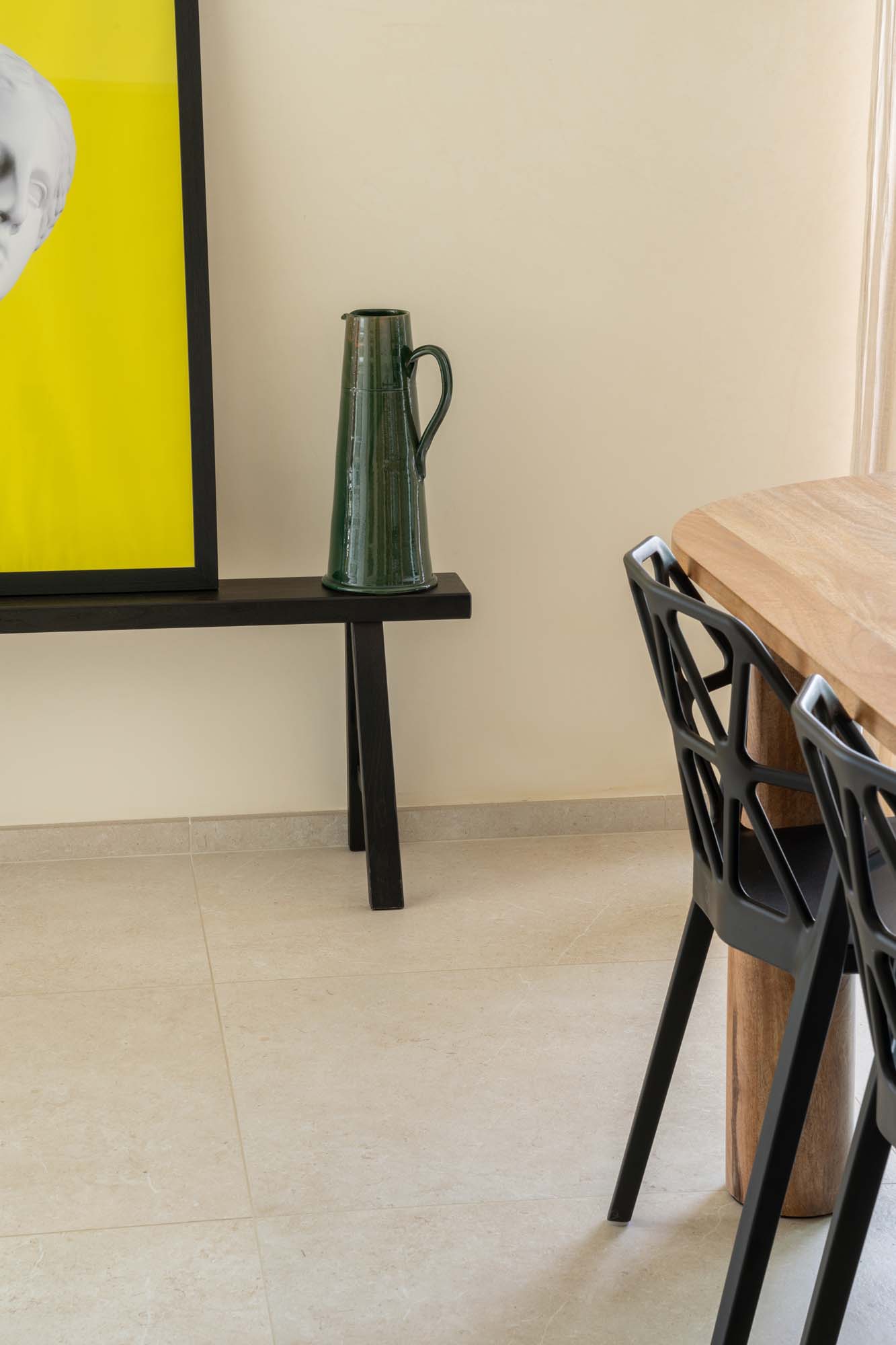 La selección de los materiales ha sido fundamental para el éxito del proyecto. Mara Prezioso ha optado por las cerámicas Marazzi, concretamente el gres porcelánico de imitación de la piedra Mystone Limestone en el color luminoso Ivory, para pavimentar toda la casa. Este producto se ha seleccionado por su capacidad de remarcar el contraste entre la naturaleza rústica de los trulli y la modernidad de los interiores. La colección Mystone Limestone, con sus tonalidades cálidas y naturales, casa perfectamente con las paredes de piedra y los elementos de madera, configurando un ambiente acogedor y refinado.