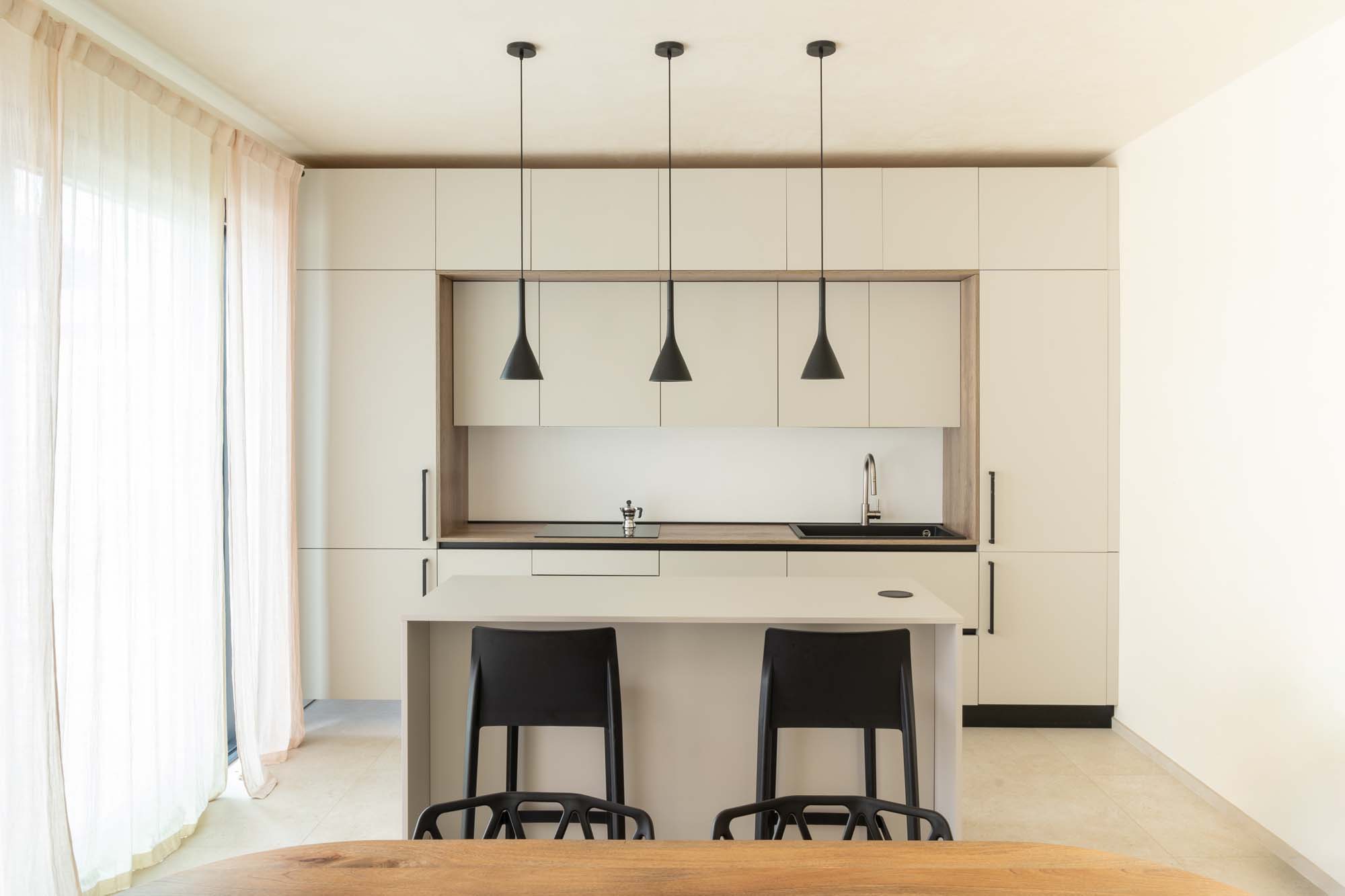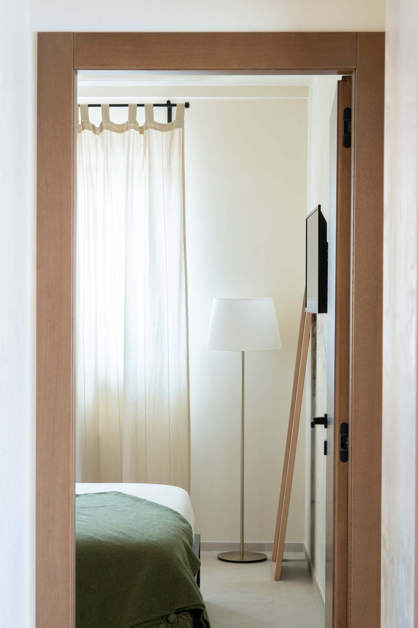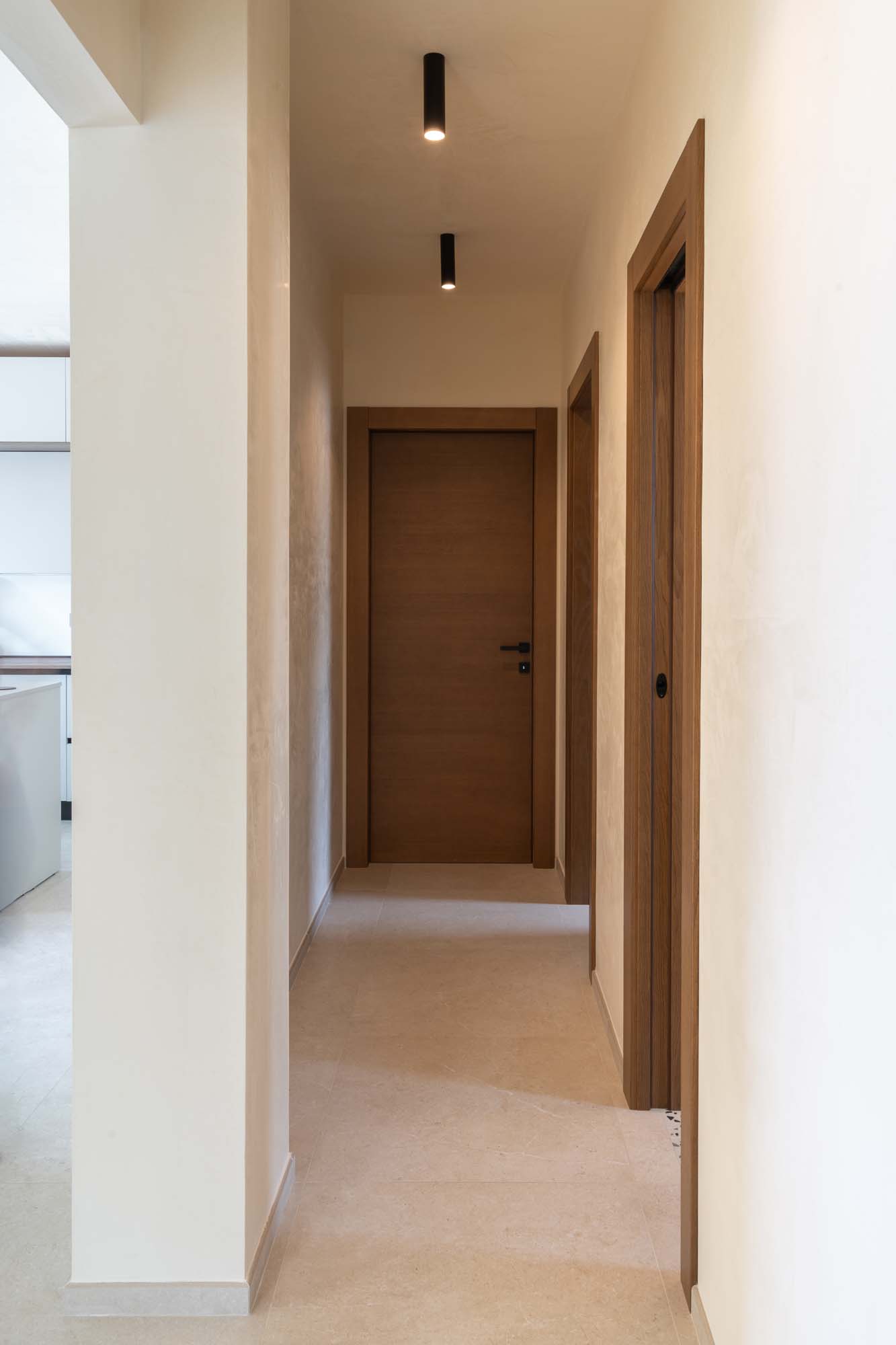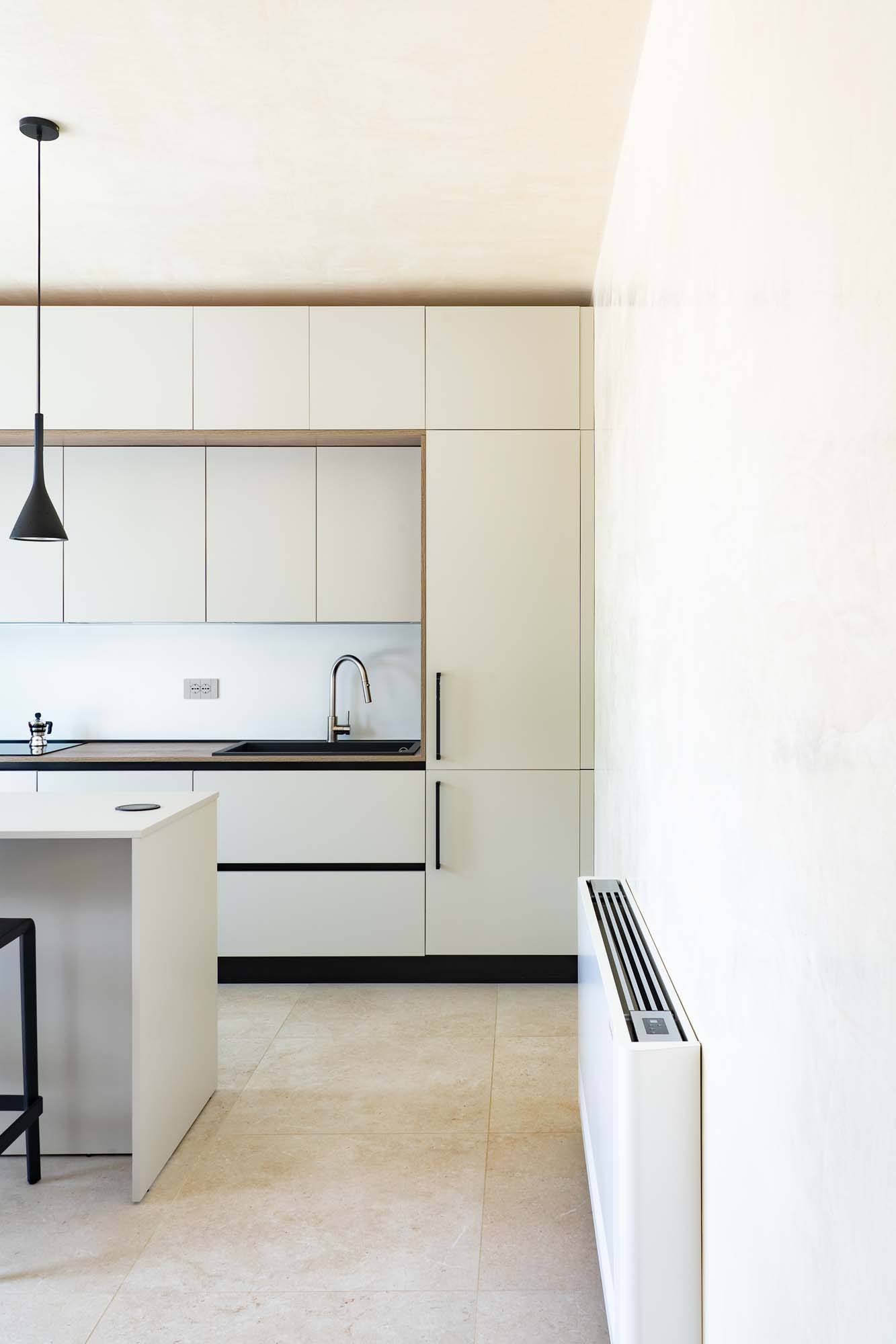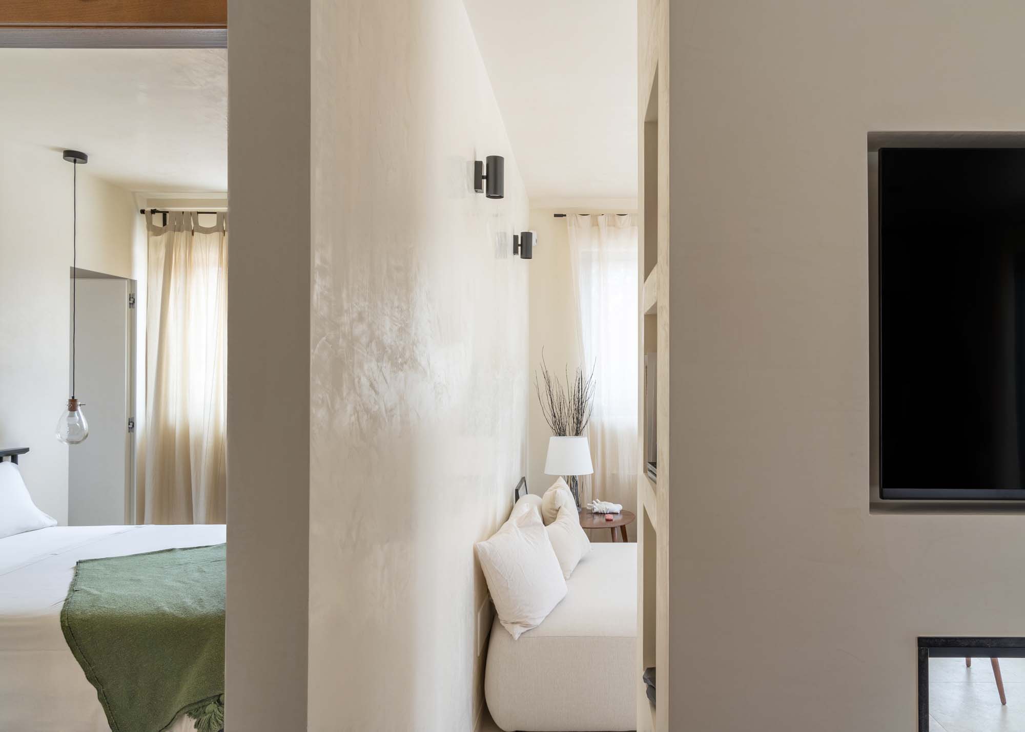 La selección de los materiales ha sido fundamental para el éxito del proyecto. Mara Prezioso ha optado por las cerámicas Marazzi, concretamente el gres porcelánico de imitación de la piedra Mystone Limestone en el color luminoso Ivory, para pavimentar toda la casa. Este producto se ha seleccionado por su capacidad de remarcar el contraste entre la naturaleza rústica de los trulli y la modernidad de los interiores. La colección Mystone Limestone, con sus tonalidades cálidas y naturales, casa perfectamente con las paredes de piedra y los elementos de madera, configurando un ambiente acogedor y refinado.