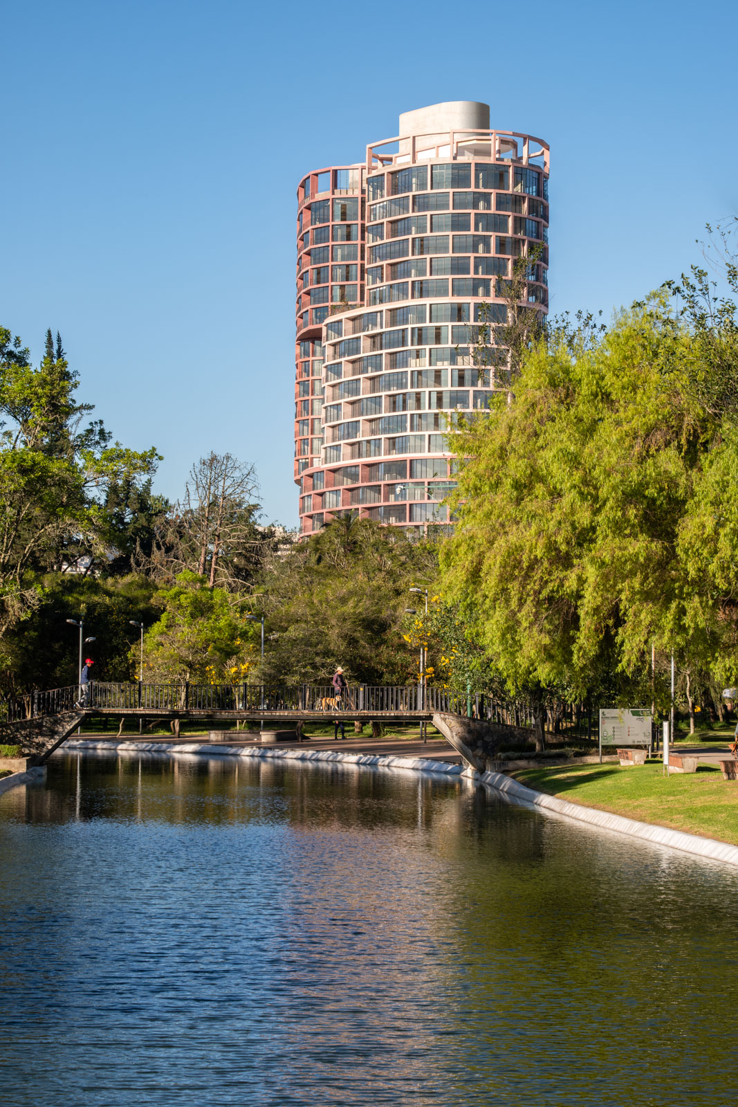 Unos magníficos patios verdes rompen la forma compacta de la torre, asomándose al parque paisajístico de más de veintiséis hectáreas en el que se yergue el edificio para brindar una vista privilegiada a todos los residentes.