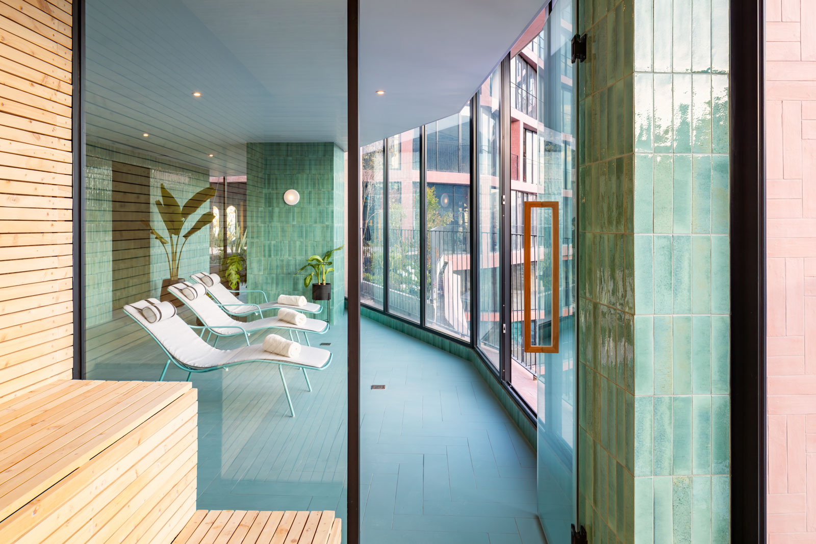 Las superficies de paredes y suelos están revestidas con los azulejos de 6 x 24 centímetros de Crogiolo que, imperfectos y muy brillantes, captan y reflejan de manera única la luz natural que atraviesa las amplias aberturas de las fachadas que dan al parque.