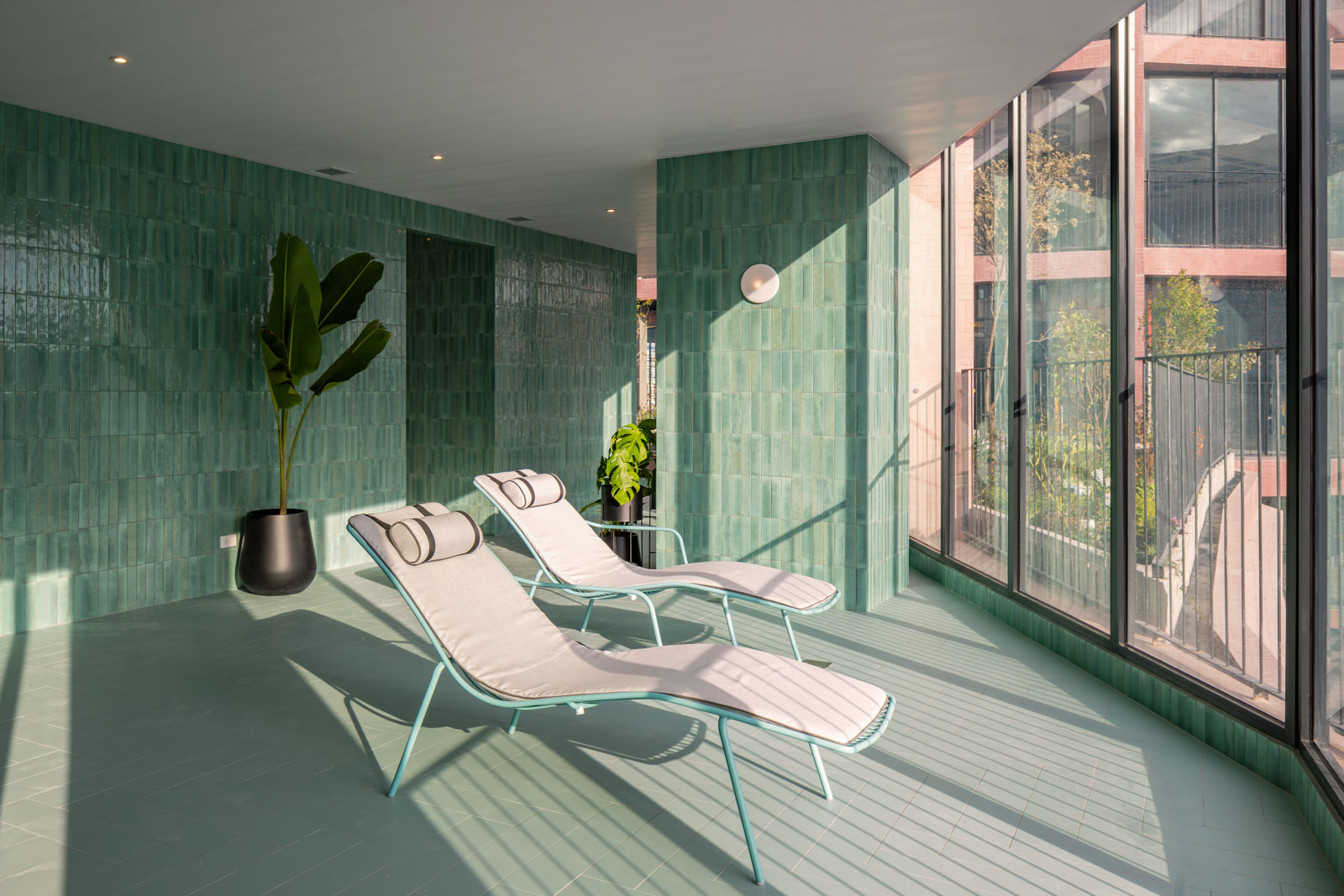 El área del spa del interior de la torre residencial, que constituye una apuesta ulterior en pro del bienestar, está revestida con los ladrillos superbrillantes de mayólica de gres porcelánico de la serie Crogiolo Lume en el color Turquoise. La tonalidad vivaz y la estética de lo “hecho a mano” nos remiten de nuevo a la tradición, también local, de la cerámica y de los colores intensos de las viviendas ecuatorianas.