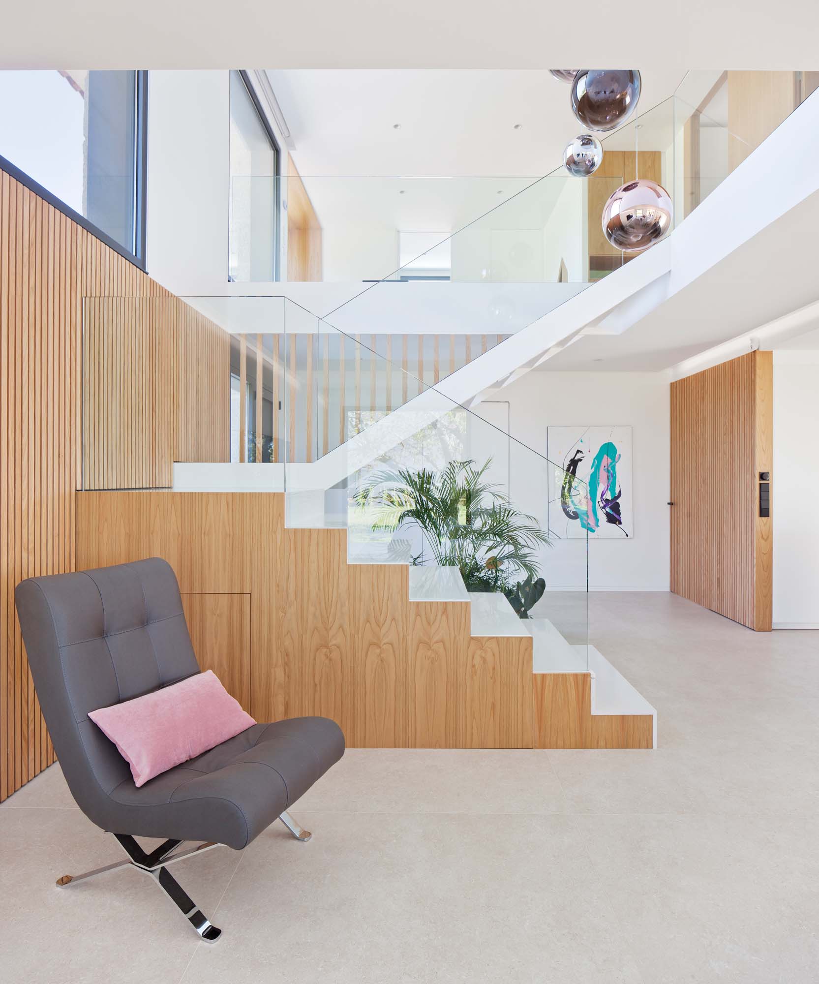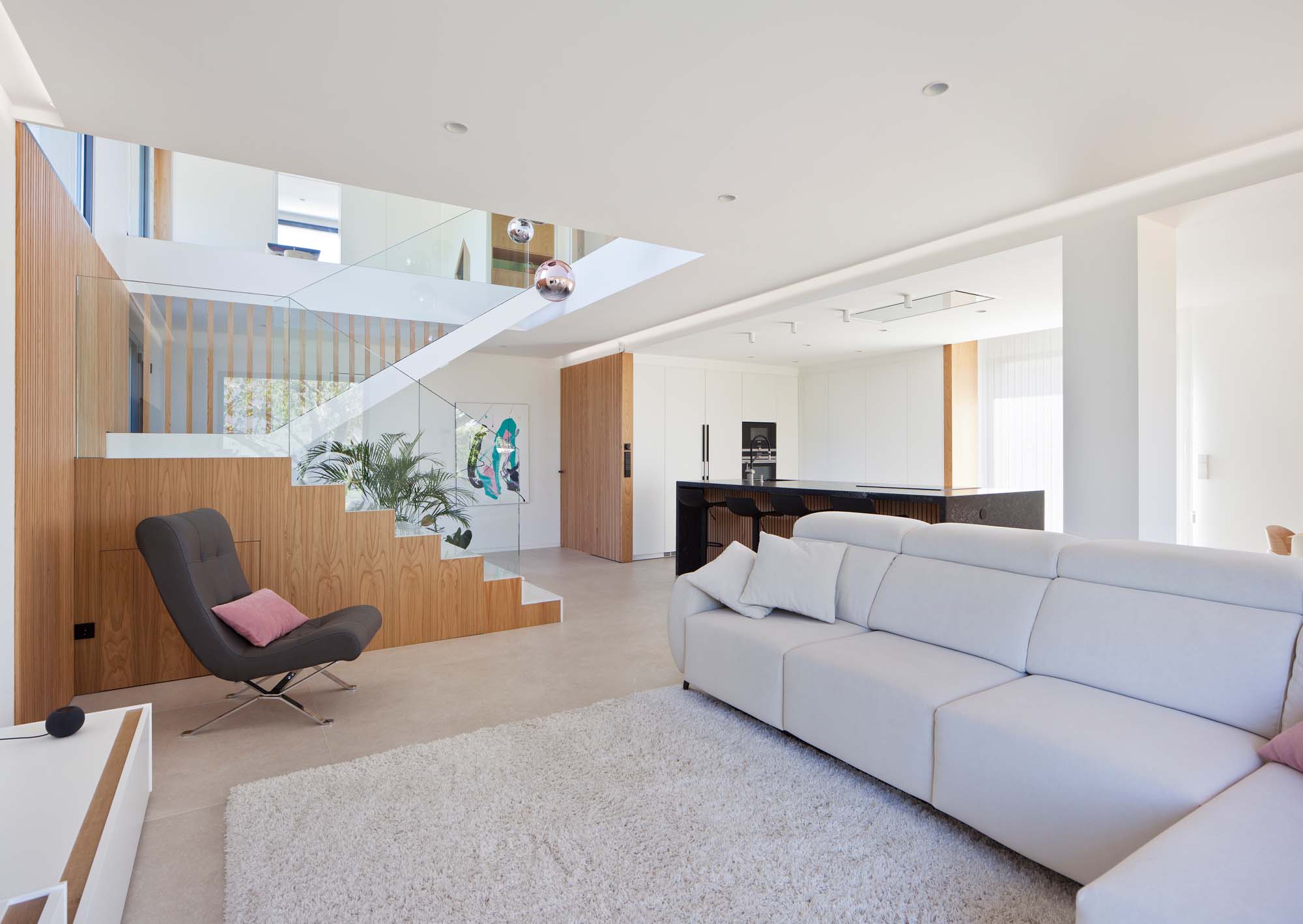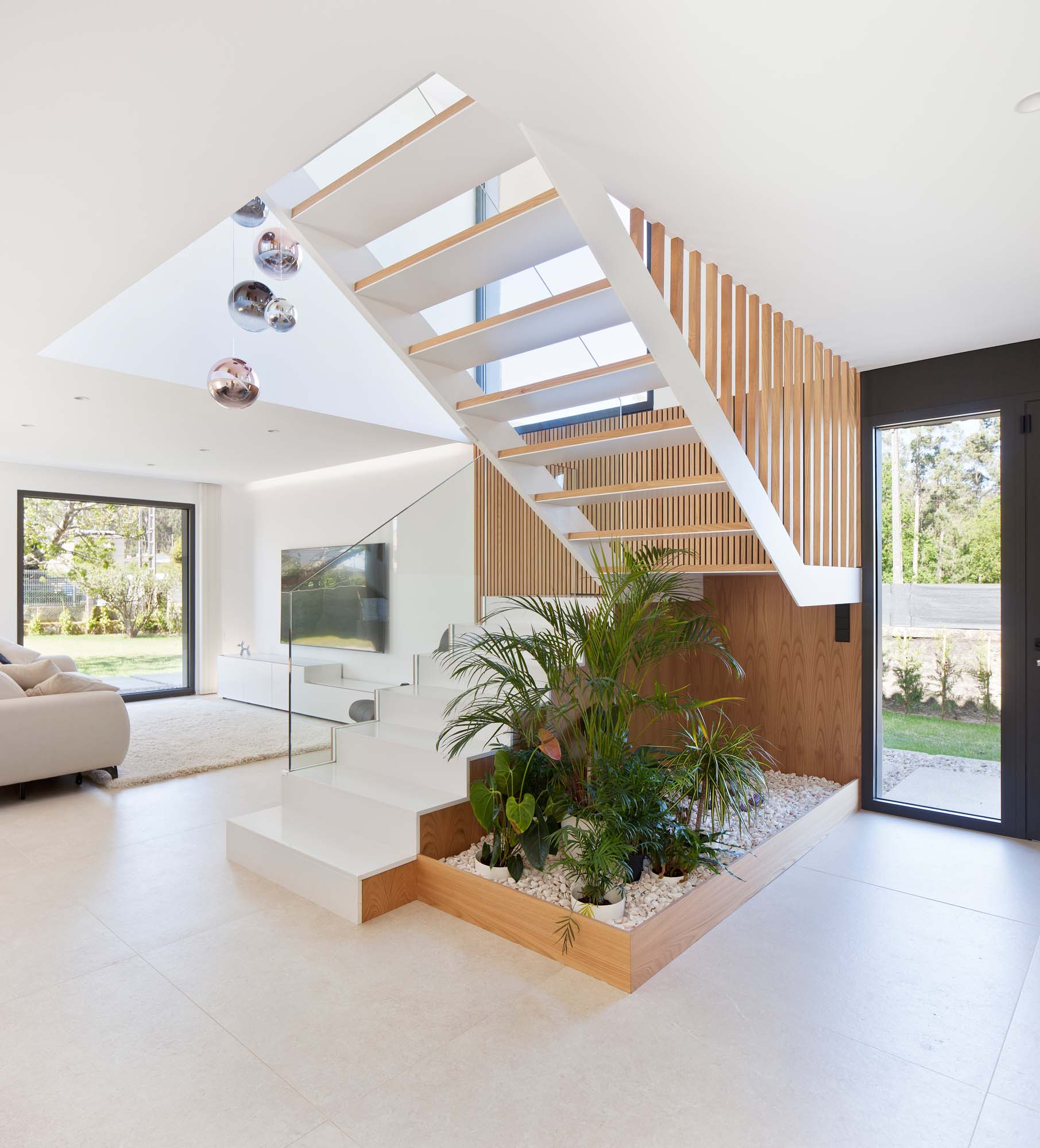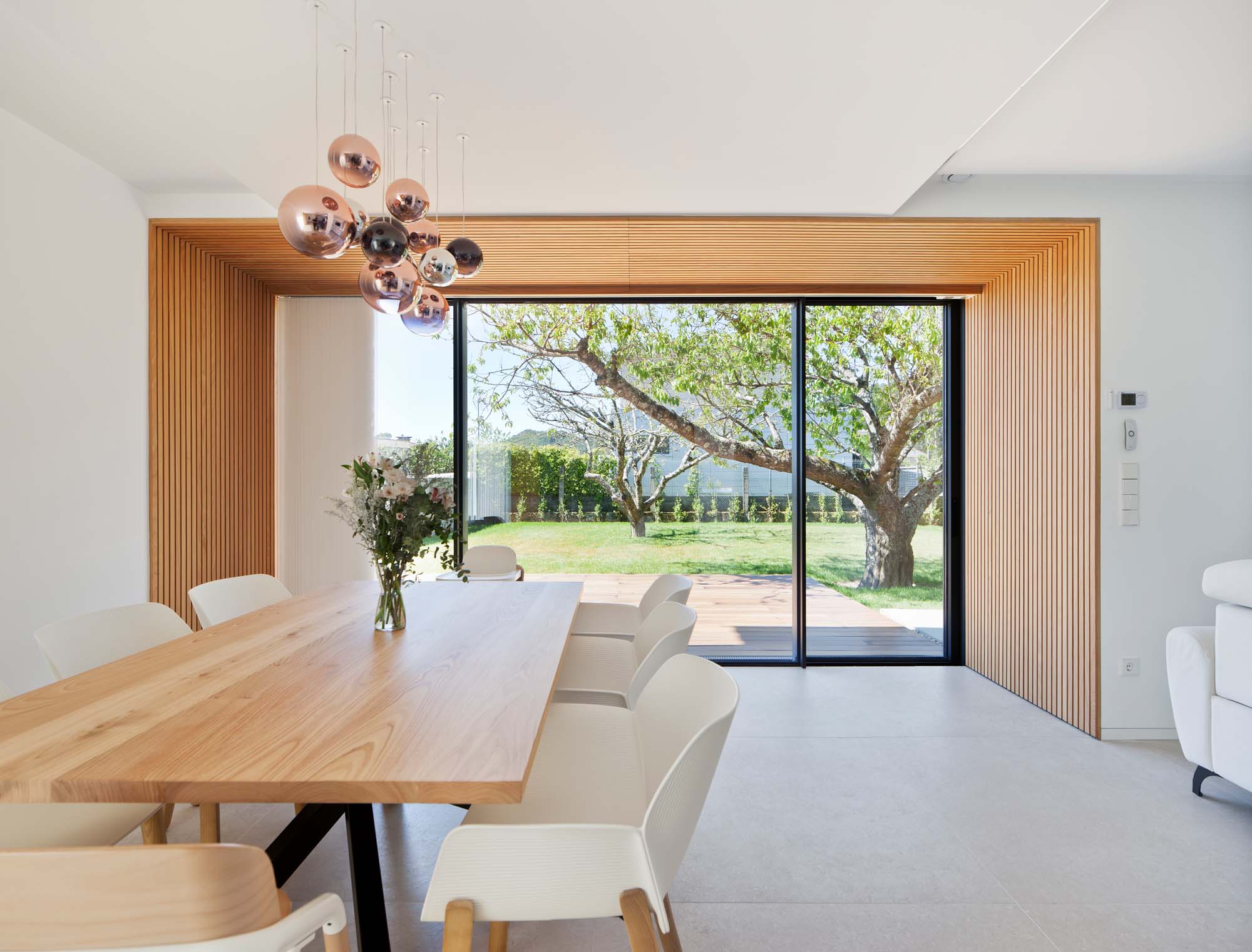 La nueva vivienda familiar gira en torno a los espacios comunes públicos: la zona de día principal se abre al jardín, que alberga un magnífico cerezo, protagonista de la conexión entre la casa y el exterior. El nexo se establece a través de listones de madera de castaño, creando un “portal” que se extiende hasta el pavimento exterior.