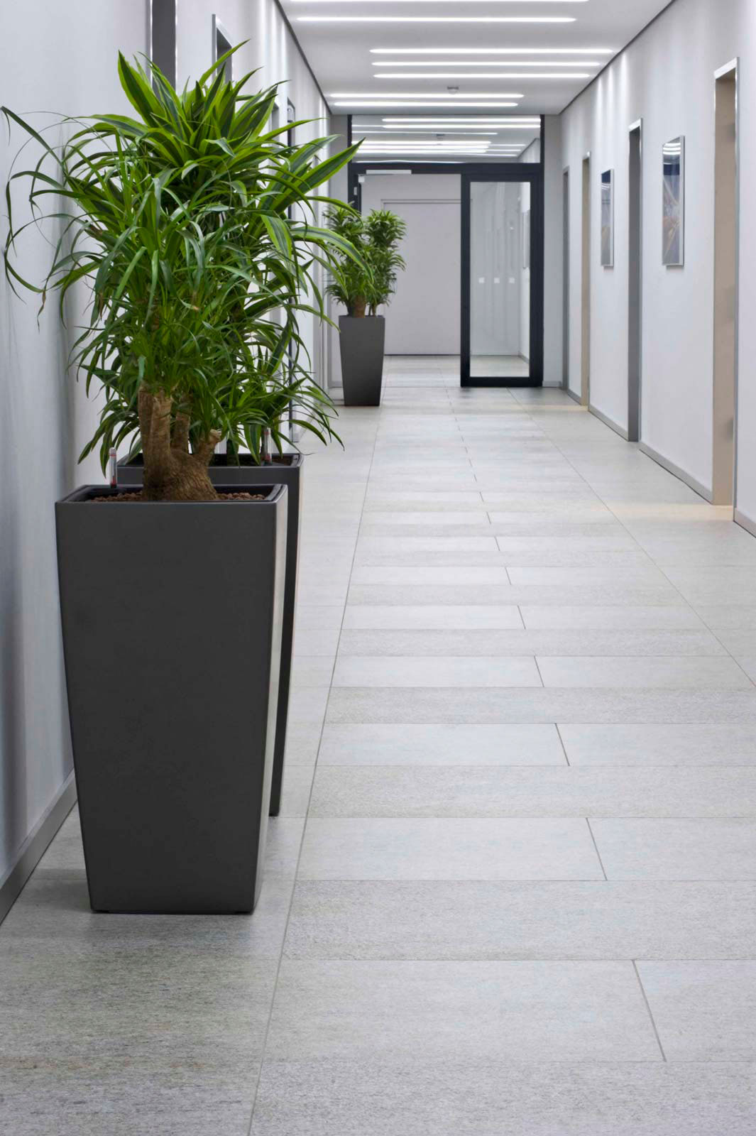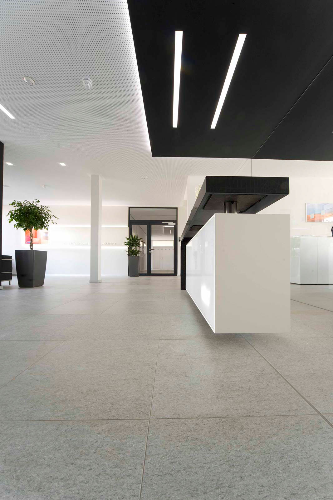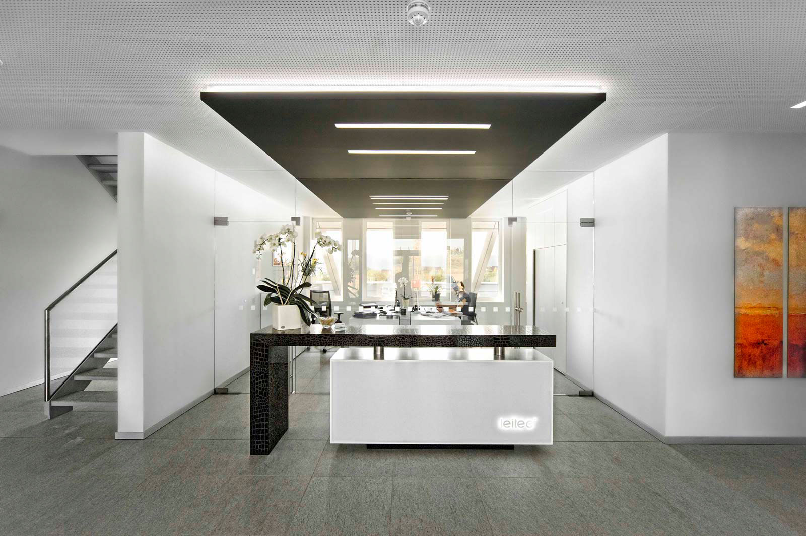 La estructura que alberga a la alemana Leitec expresa por medio de una moderna arquitectura la dedicación y la especialización de la empresa en diversos sistemas energéticos. Una de las fachadas exteriores, en efecto, se ha construido por entero con paneles fotovoltaicos para la producción de energía. El aire contemporáneo del edificio se refleja en el estilo decorativo y en la distribución de los espacios interiores, donde unas líneas netas, austeras y elegantes circunscriben las oficinas y la zona de la recepción. Se confiere un notable realce a los espacios gracias al pavimento de efecto piedra Evolutionstone Luserna de Marazzi de 60 x 120, de superficie estructurada, alternado con dos módulos de 60 x 60, de superficie natural.