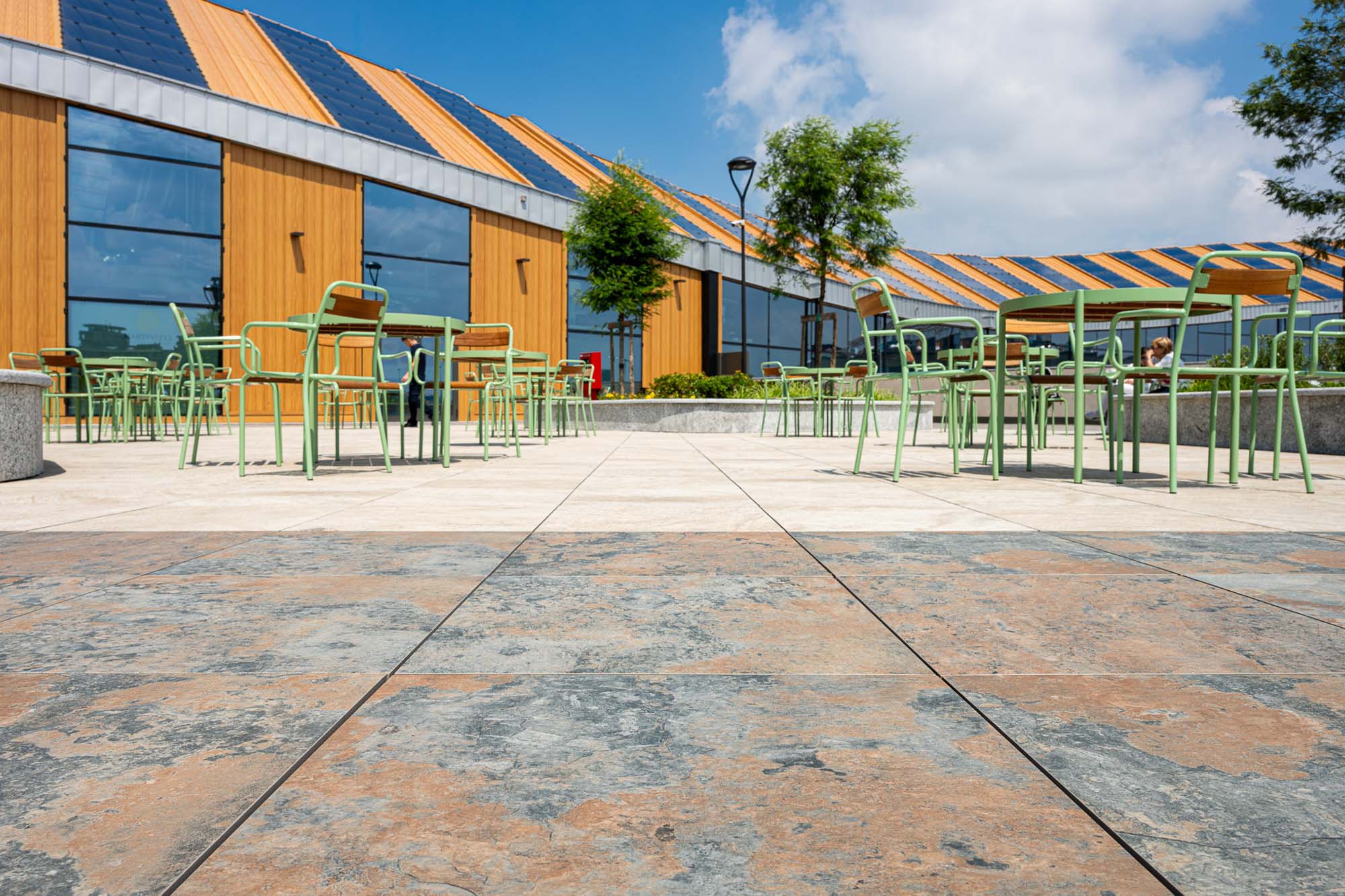 Para solar la pasarela verde de la cobertura —que flanquea un parque fotovoltaico de cinco mil metros cuadrados y está equipada con un moderno sistema de recogida de agua pluvial— se ha utilizado la colección Market en la versión Stone Grey. La estética de la imitación del cemento remarca la resistencia de este producto, concebido para pavimentar superficies sometidas a tráfico intenso, como las de los centros comerciales.