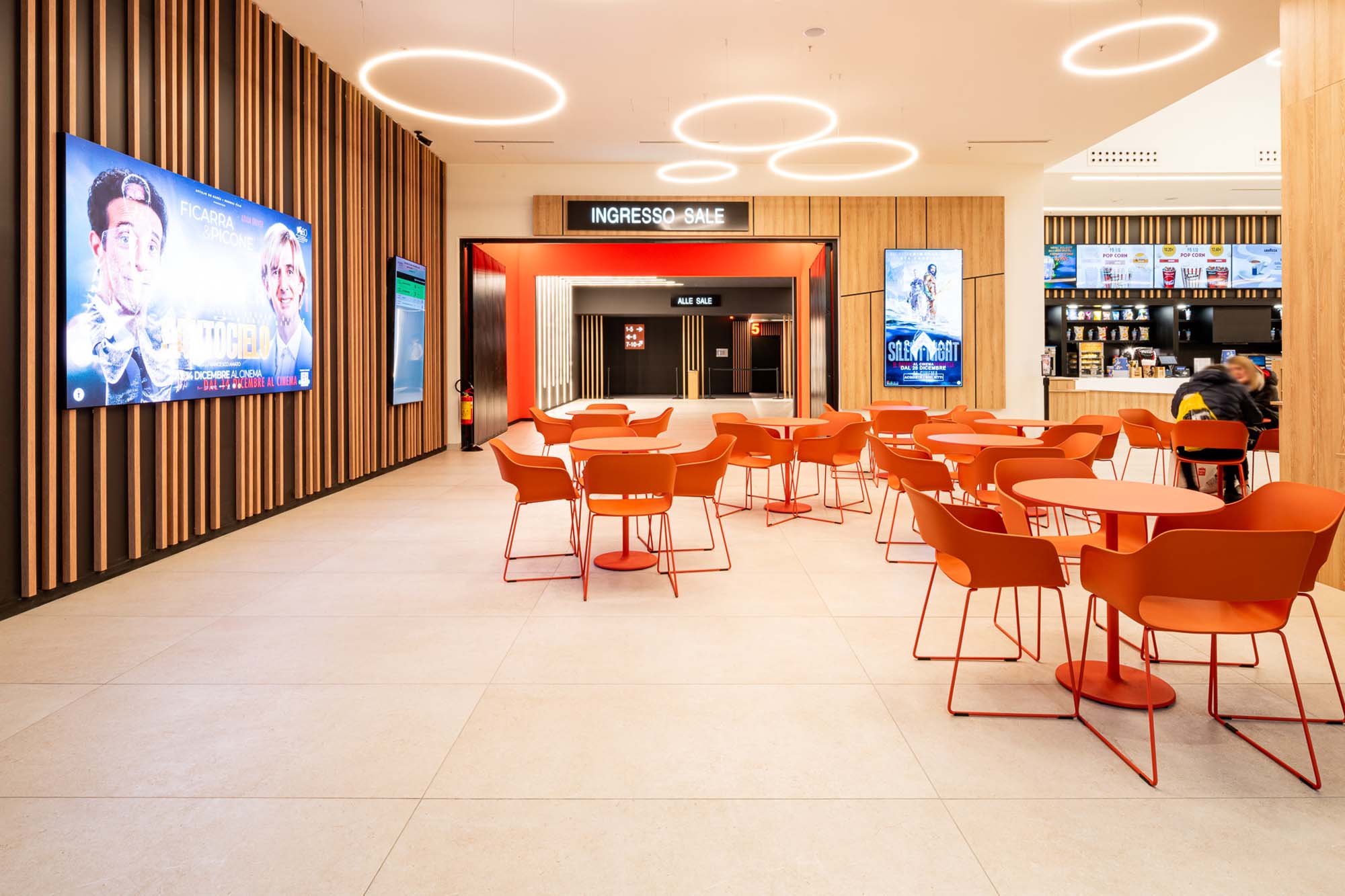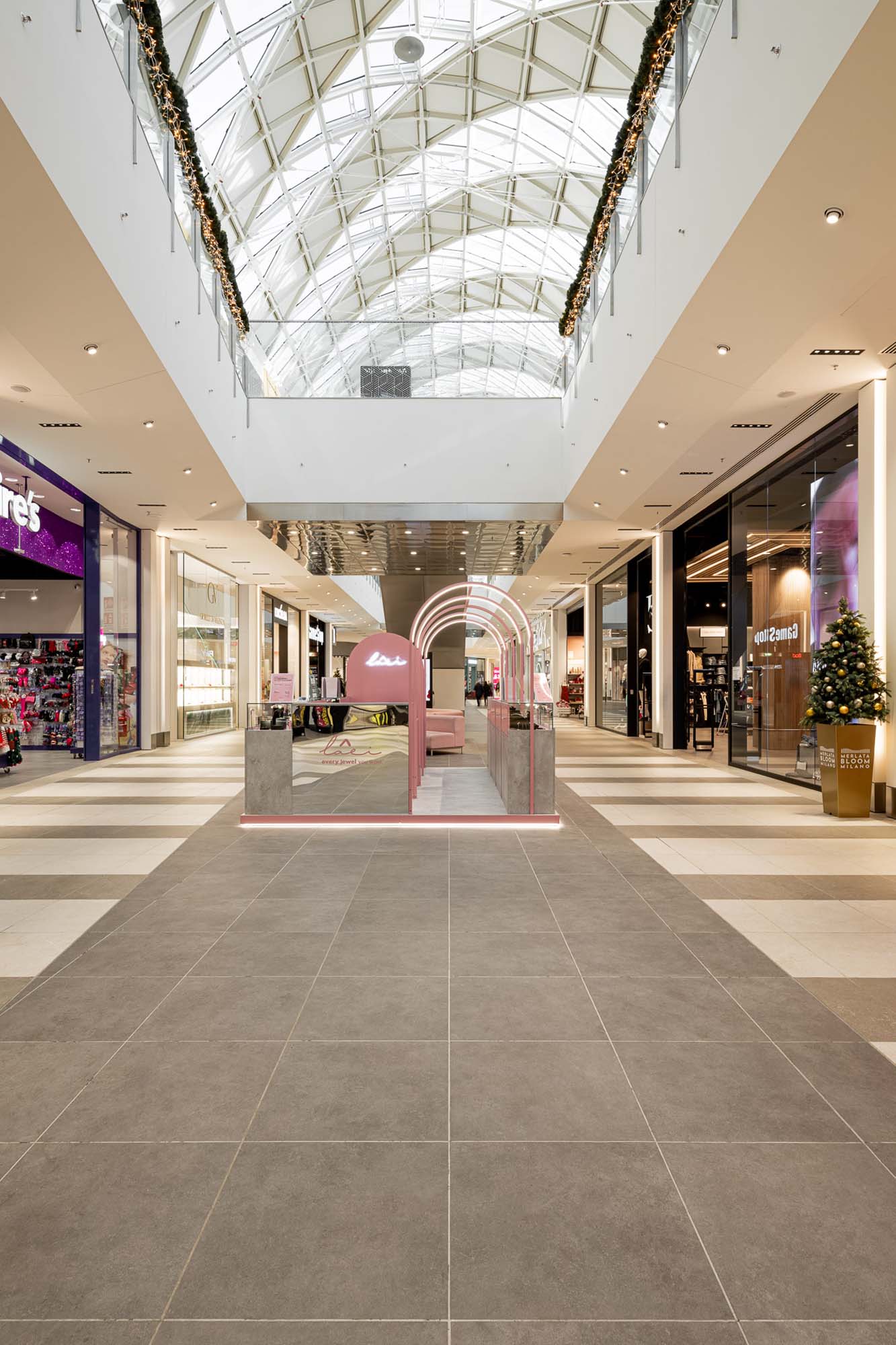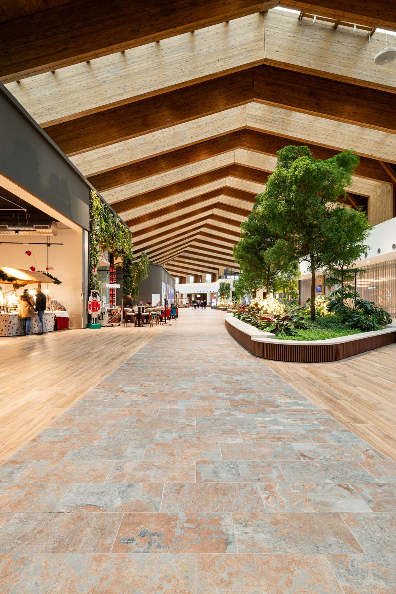 Los pasillos de las galerías, a los que se asoman las tiendas insignia de las numerosas marcas alojadas en Merlata Bloom, así como el gran multicine, se ven ritmados por los azulejos de la serie Rocking, siempre junto a las texturas de inspiración natural de la colección Treverkview, con superficie estructurada, en las versiones Multicolor —inspirada en la heterogeneidad de las piedras naturales— y Beige. Tales azulejos, en la versión de 20 mm de grosor, acompañan al visitante en los espacios públicos del exterior del Life Style Centre, convirtiéndose en el módulo compositivo de las áreas al aire libre.