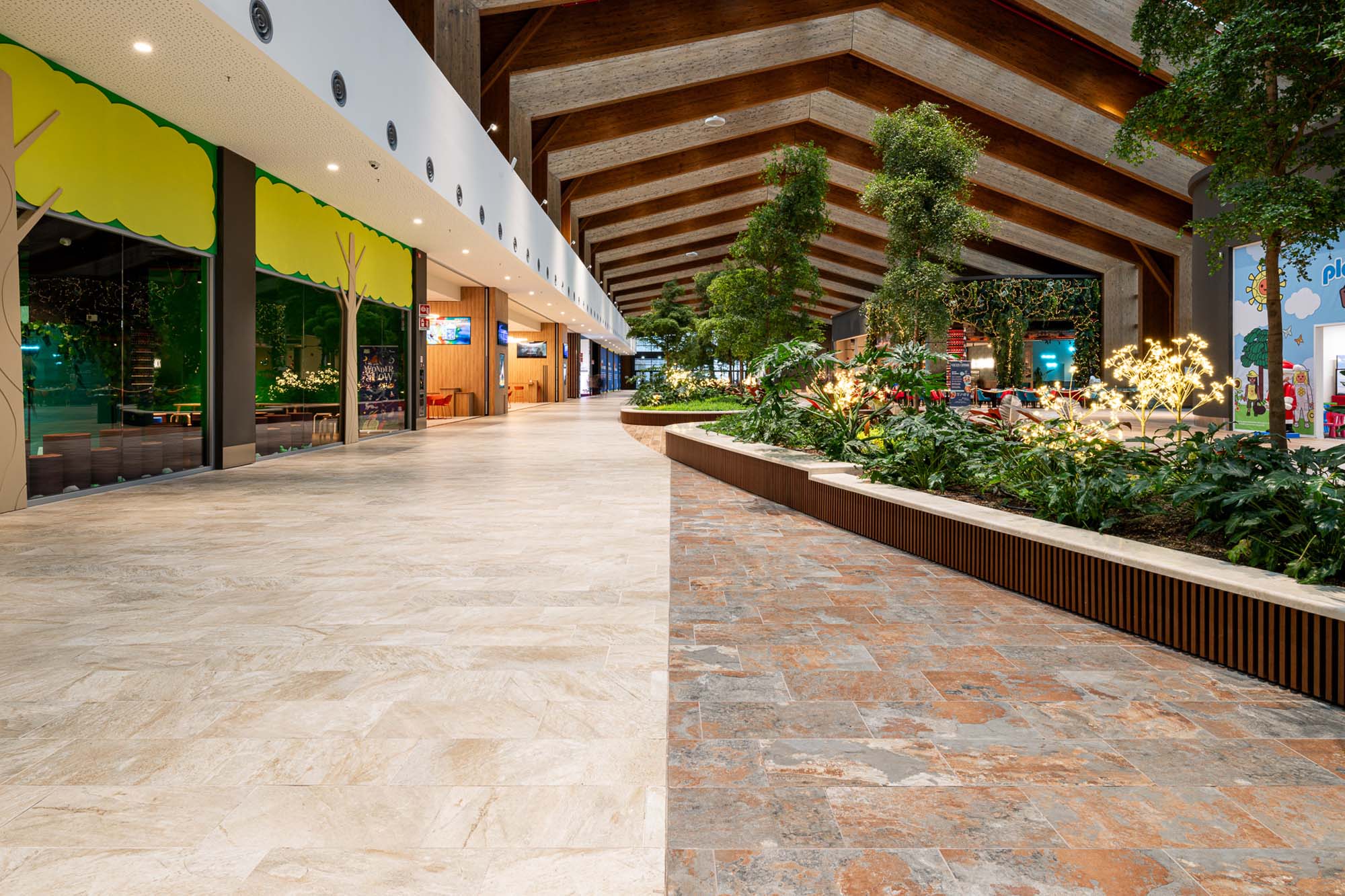 En las galerías, las texturas inspiradas en varios tipos de madera de Treverkview se ven flanqueadas por amplias islas y paseos revestidos con la colección de imitación de la piedra Mystone Limestone, en las suaves tonalidades Ivory y Sand.