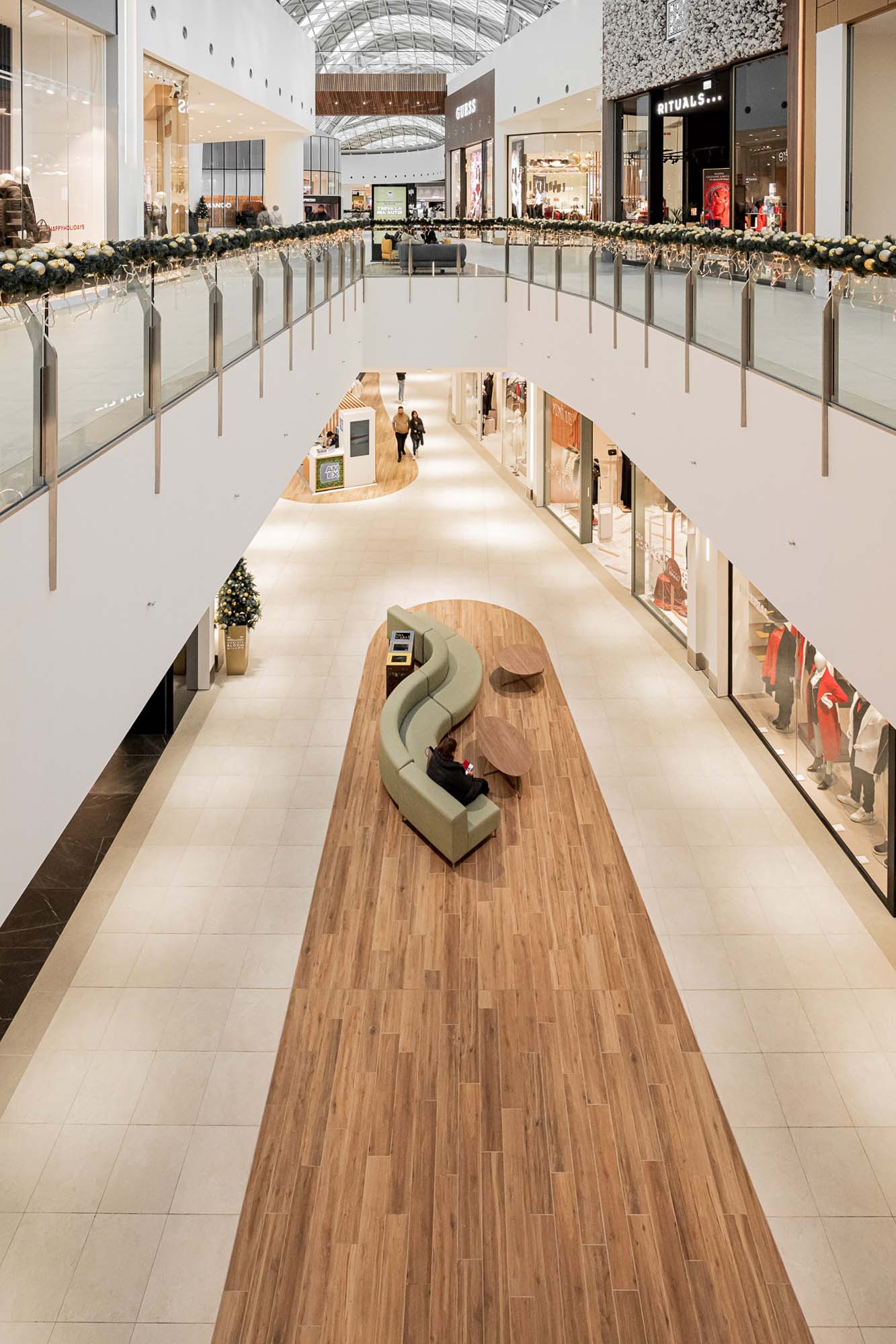 El parque urbano situado en frente del centro comercial es una referencia continua para la intervención, desde la plaza pública hasta el Sky Garden, pasando por el carril bici, junto con soluciones arquitectónicas, técnicas y de instalación atentas a la sostenibilidad que definen espacios con el máximo confort ambiental.