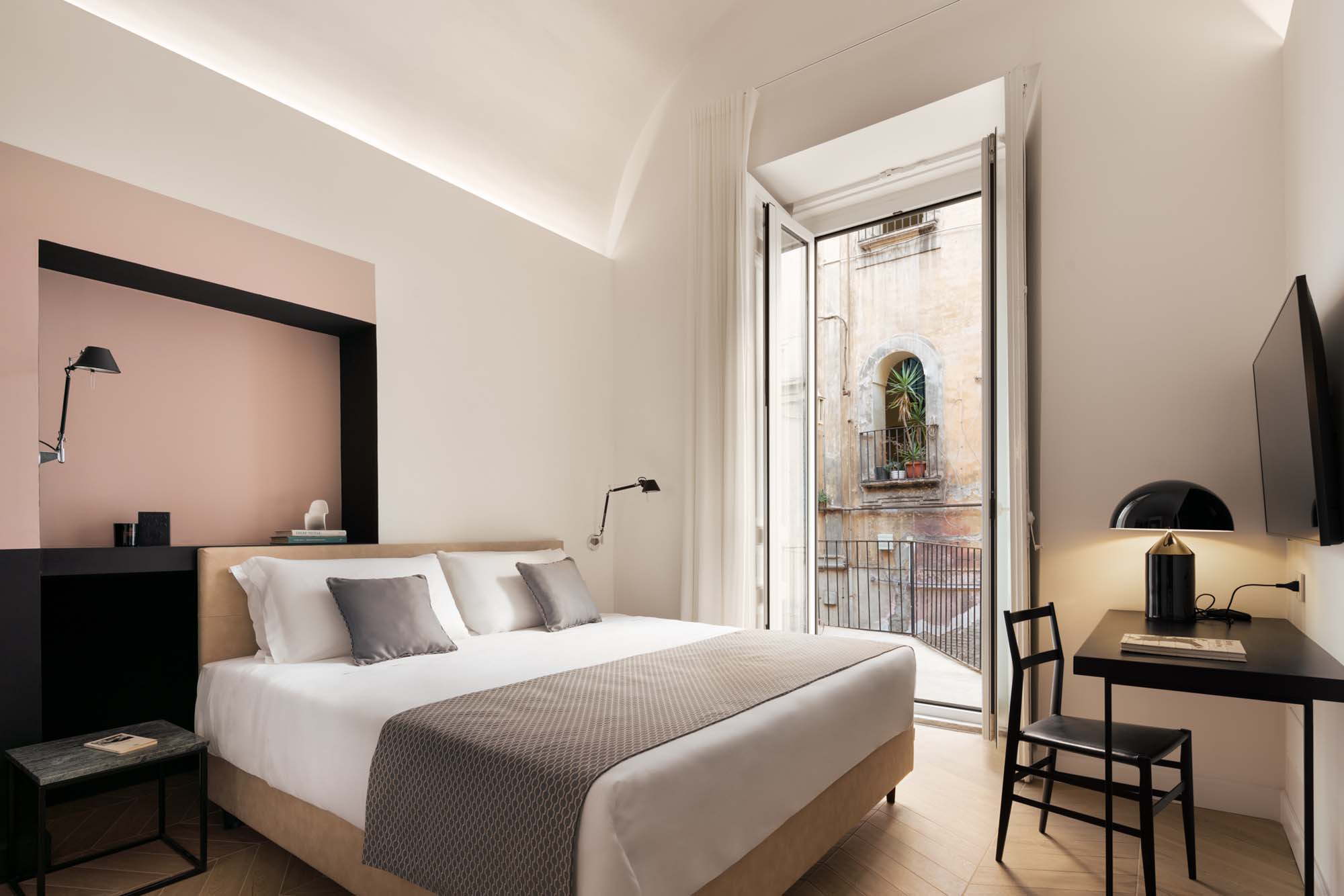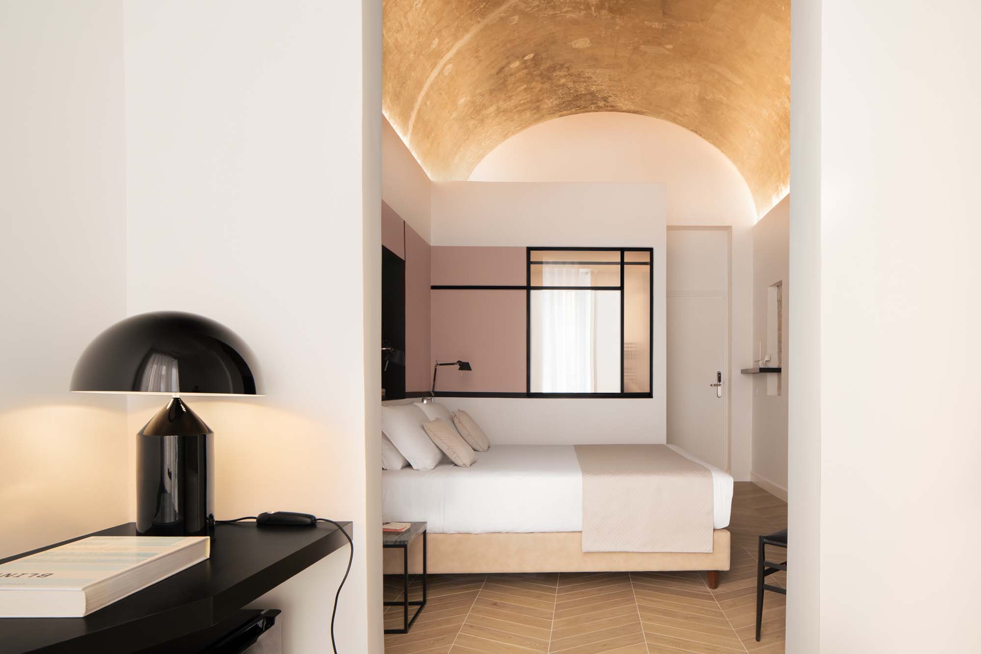 El arquitecto Pasquale Bianchini ha restaurado el hotel con sapiencia, rehabilitando y realzando los elementos originales con un toque delicado, mientras introducía contemporaneidad por medio de piezas emblemáticas del diseño que se funden armoniosamente con el ambiente histórico del edificio.