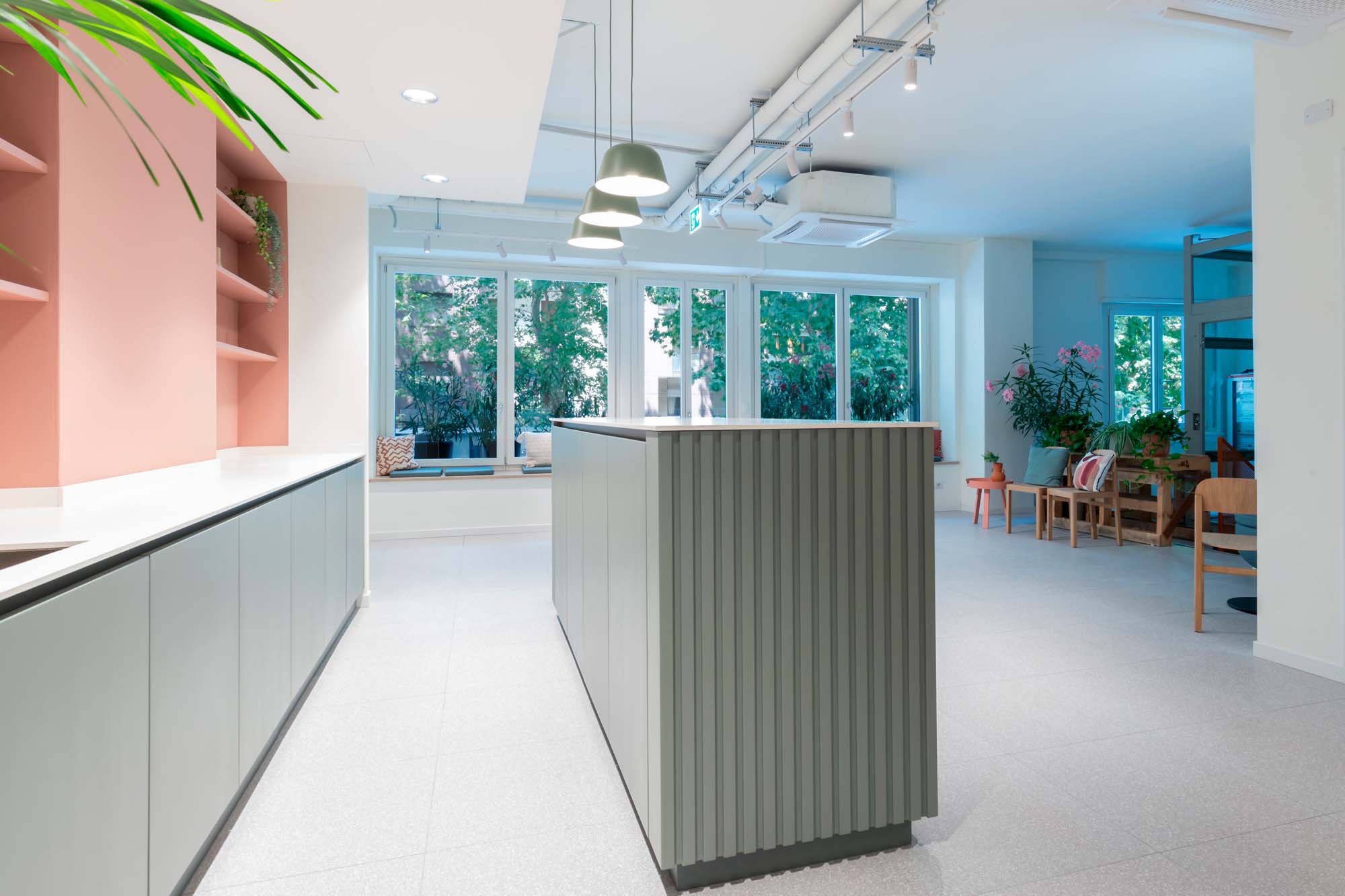 Un aspecto crucial de la transformación de Open ha sido la armonización de la pavimentación para garantizar continuidad y coherencia estética. La selección de un pavimento flotante, con sus características de practicidad y versatilidad, ha demostrado ser ideal para satisfacer las necesidades del proyecto, permitiendo crear, bajo la superficie de tránsito, un espacio técnico continuo en el que alojar las redes de la instalación. “La colección de gres porcelánico Pinch en el color Light Grey ha sido la solución perfecta, gracias a su imitación del terrazo veneciano contemporáneo, que ha enriquecido los ambientes con estilo y personalidad”, afirma la arquitecta.