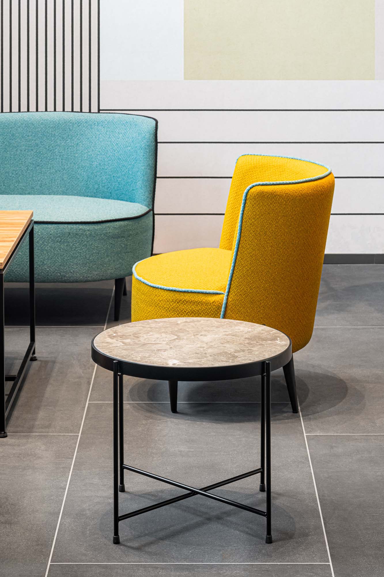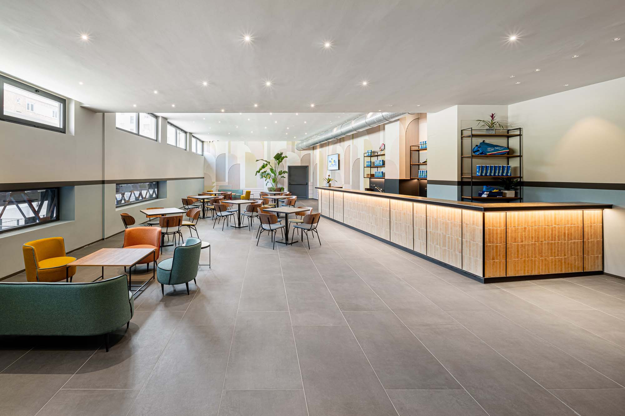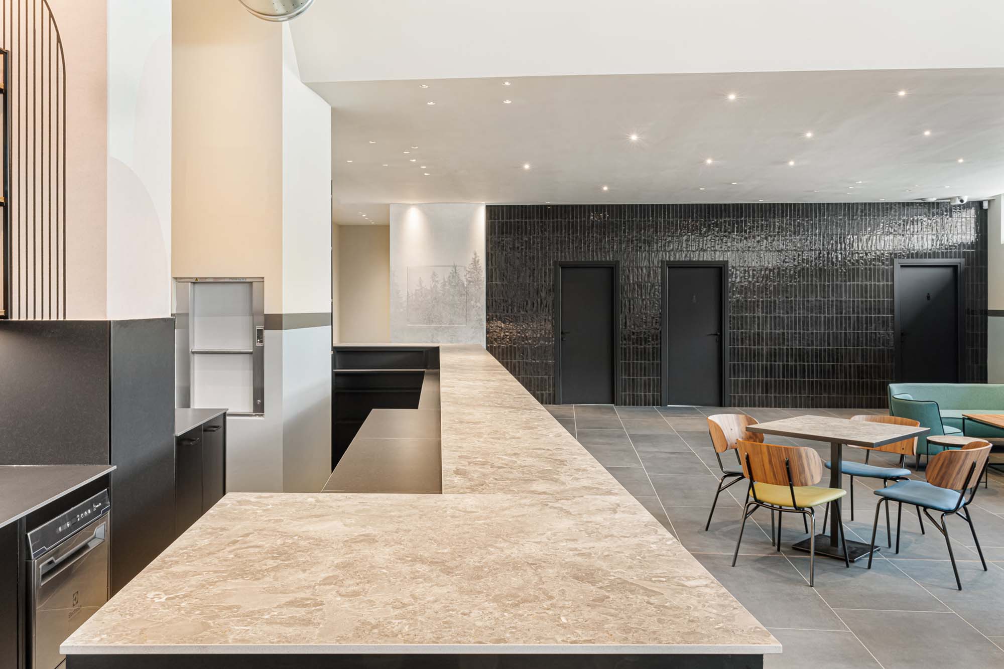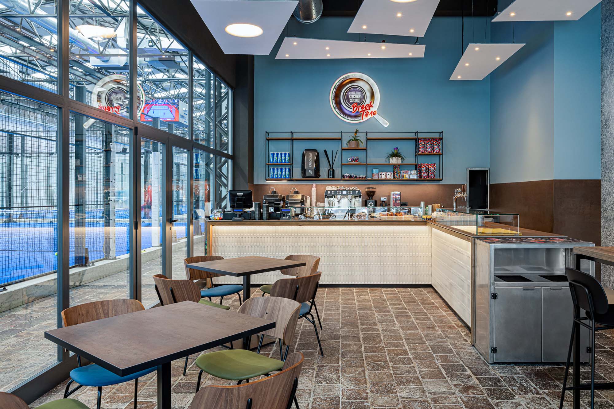 El bar de la planta baja es un ambiente informal con grandes ventanales con vistas a las pistas de juego. El punto focal es el gran mostrador en forma de “L”, que recuerda los de los locales tradicionales con vitrinas y comida expuesta. Está revestido en la parte frontal con azulejos claros de la colección Crogiolo Confetto, en el formato de 5 x 15 cm y estructura tridimensional Savoiardo que crea, gracias a la iluminación que cae sobre toda la superficie, un juego de profundidad y de luces y sombras. En contraste, en la encimera del mostrador y en las paredes posteriores se ha empleado The Top Metal Look en el acabado Corten (formatos de 160 x 320 cm y 6 mm, y de 162 x 324 cm y 12 mm), utilizado también en los sobres de las mesas a juego con las paredes.