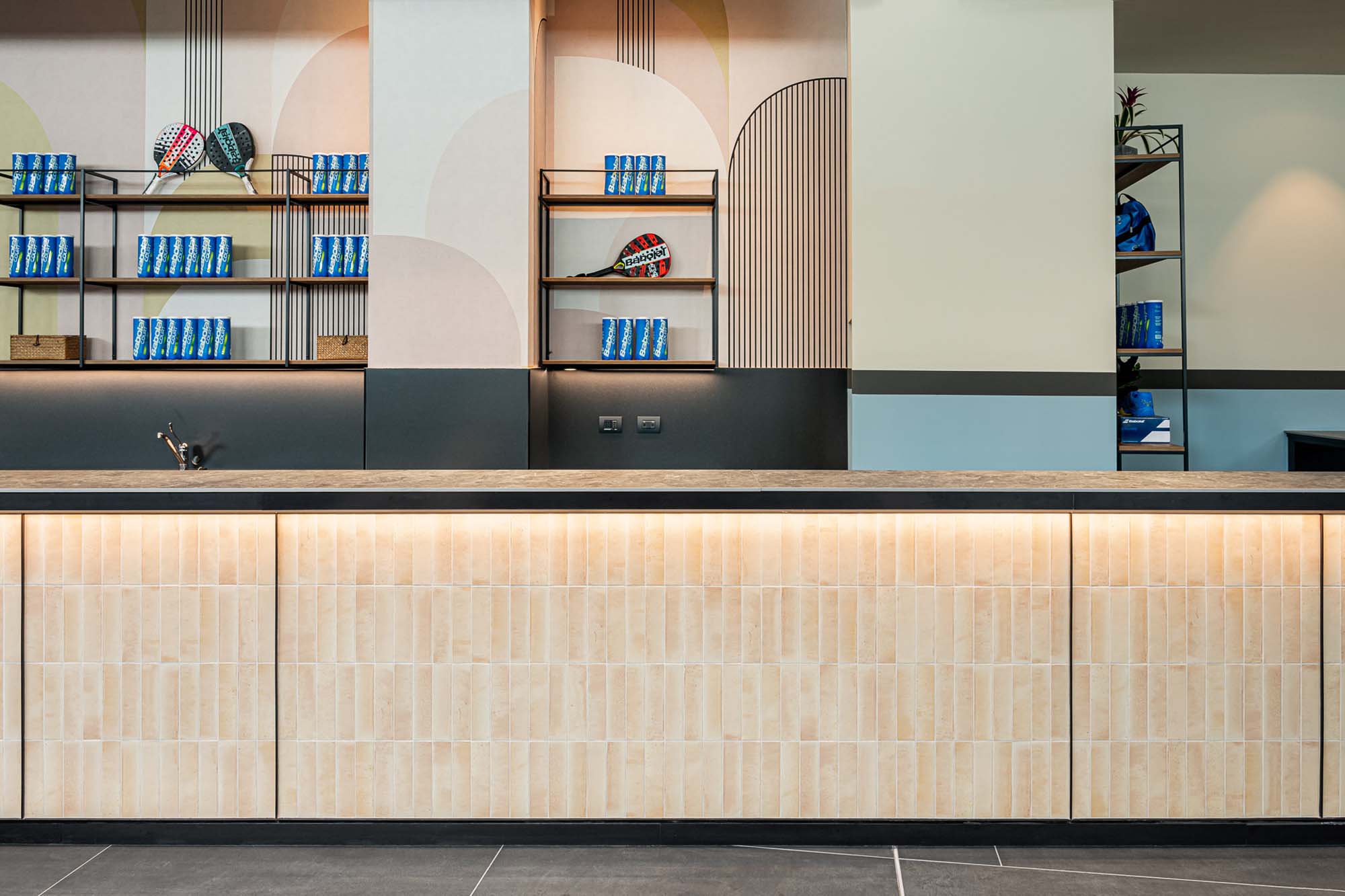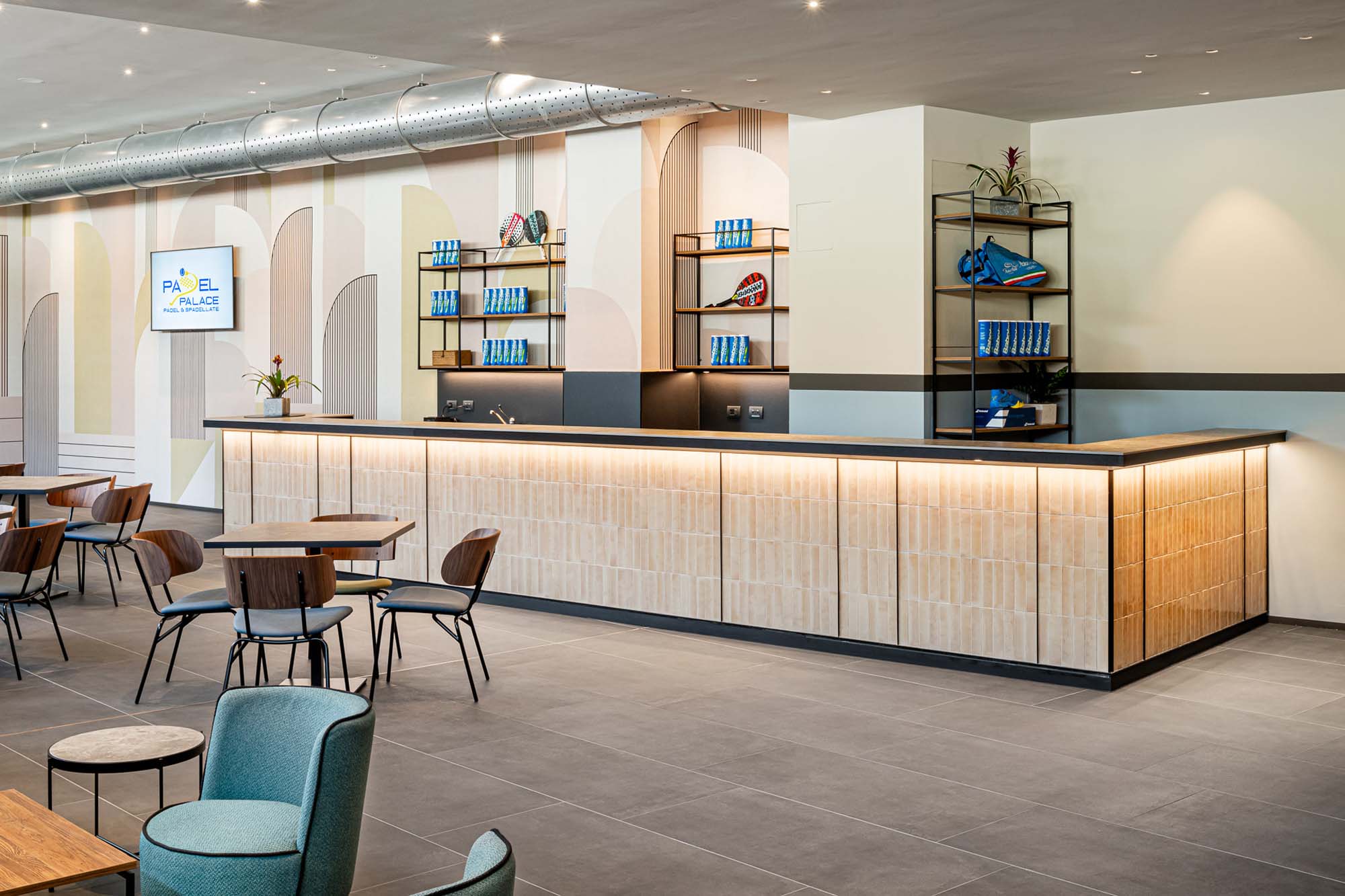 Restauración, Hostelería y Tiempo libreEn el club deportivo con bistró Padel Palace la cerámica se utiliza profusamente de los revestimientos de los mostradores a las encimeras de las mesas, desde las paredes matéricas hasta los pavimentos, dando valor a su diversidad y formatos