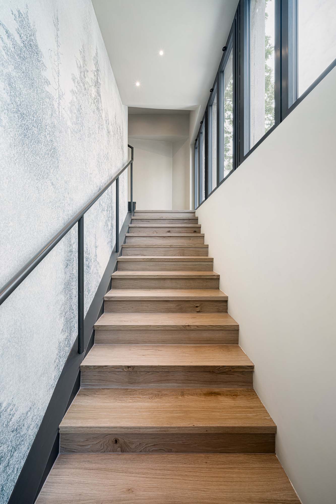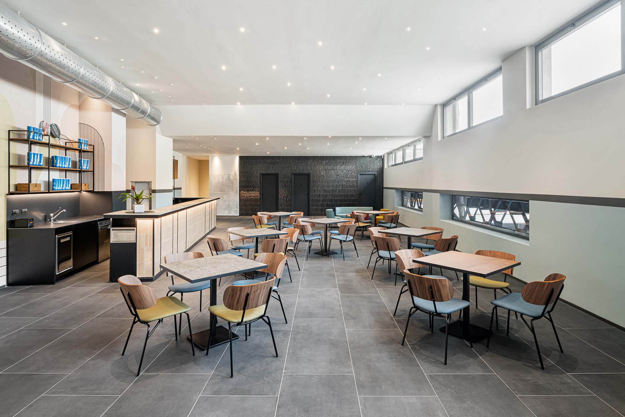 Desde la escalera revestida con duelas de 25 x 150 cm de imitación de la madera de Treverkmust se accede al bistró ABKS Break Time. “No queríamos evocar la identidad industrial del lugar, por lo que descartamos la típica idea de configurar un espacio ‘bruto’ con cemento a la vista. Hemos preferido un ambiente de elegancia insinuada, no chillona, caracterizado por los colores y texturas de los materiales”, prosigue Canelli. La sala está pavimentada con gres porcelánico oscuro de imitación del cemento (serie Cementum, de 60 x 120 cm) para dialogar con el contexto original, del que se conservan los conductos de aire industriales, las ventanas altas y los ventanales continuos. La planta superior también aloja un amplio mostrador, en este caso rectilíneo y revestido con los azulejos de formato pequeño Lume de la colección Crogiolo, de color rosa y superficie destonificada para crear efectos de luz tornasolados. Detrás del mostrador, para poner de relieve el rosa del revestimiento y resaltar el fondo gris y jaspeado de la encimera (colección The Top Stone Look, color Gris du Gent), se colocaron las placas cuadradas de Powder Graphite (de 60 x 60 cm). “Queríamos jugar con el efecto matérico, manteniendo al mismo tiempo la sencillez general del ambiente”, añade Canelli. Todo este juego de superficies y colores se propone asimismo en los sobres de las mesas.