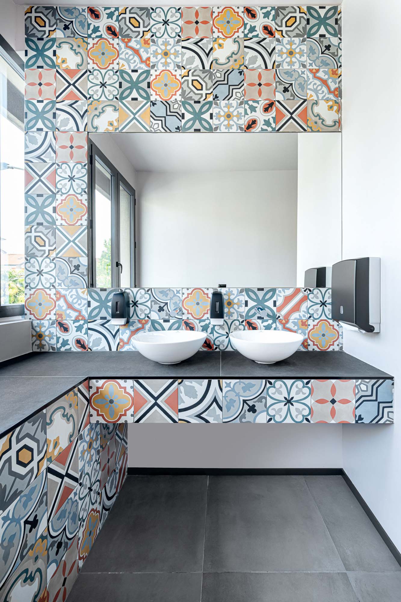 A los baños introduce una pared íntegramente revestida con azulejos negros de la colección Lume, creando un fondo brillante que refleja la luz natural que penetra rasante desde arriba. Pero la sorpresa es el uso maximalista y gracioso de las múltiples decoraciones de la colección Crogiolo D_Segni Colore (en el formato de 20 x 20 cm) que, aun recordando las tradicionales baldosas hidráulicas, aquí se convierten en un caleidoscopio de motivos decorativos. “Una curiosidad”, revela Canelli: “la colocación de los azulejos entraña un código: los puntos de las finales y semifinales de los tres últimos campeonatos mundiales de pádel”.