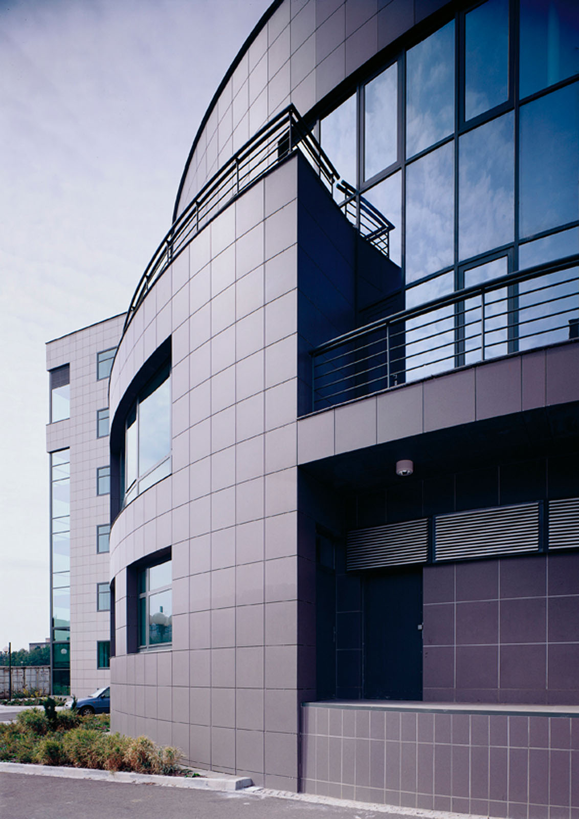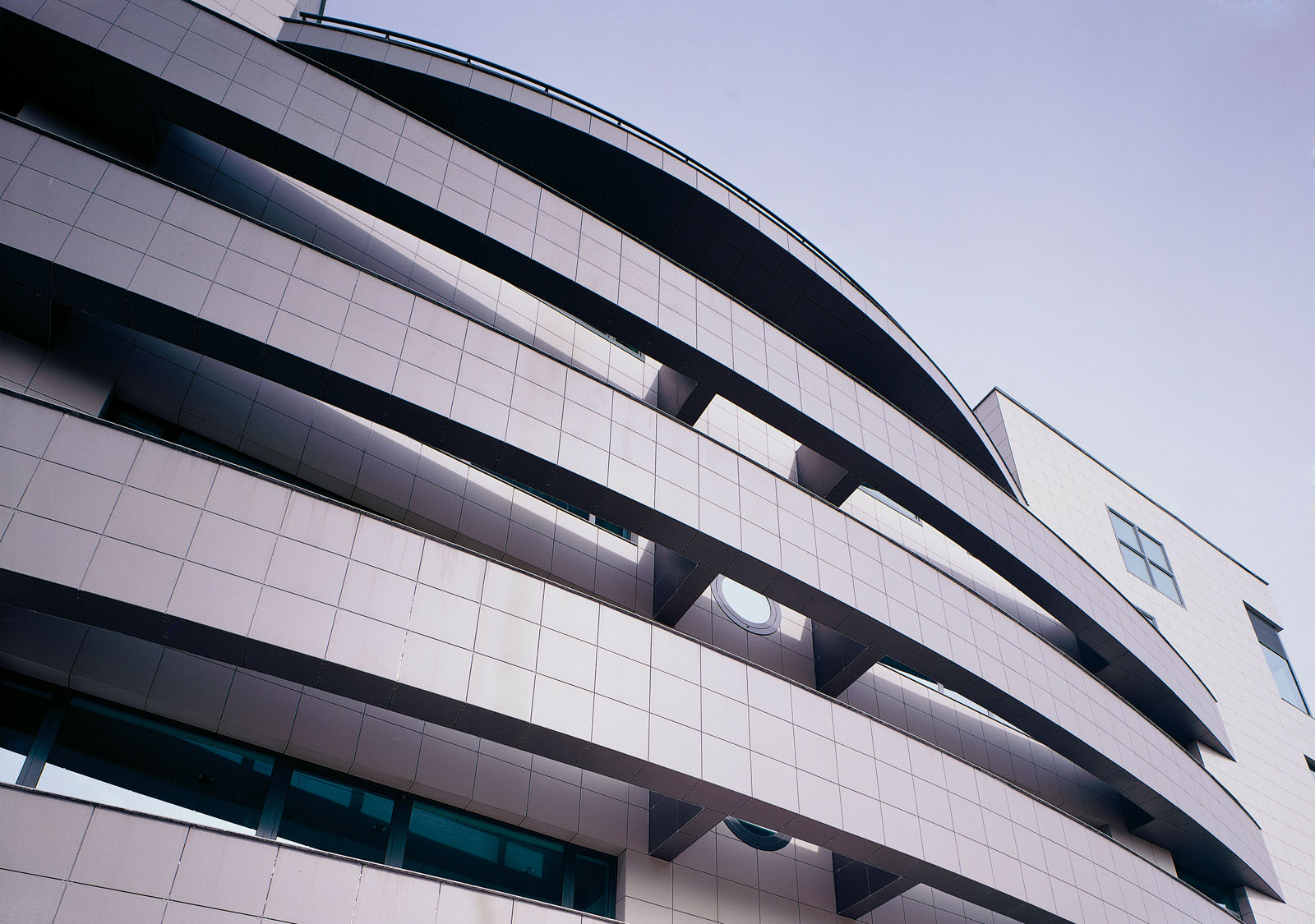 presenta como una de las actuaciones de mayor magnitud y complejidad. Para el revestimiento exterior de las fachadas ventiladas de los dos núcleos que componen el complejo, se emplearon baldosas cerámicas de gres porcelánico Marazzi con sistema oculto para el enganche de los paramentos a la subestructura metálica. Son dos los colores y los acabados elegidos por los proyectistas para aligerar más el complejo, en el que la cerámica se combina con grandes cristaleras panorámicas.