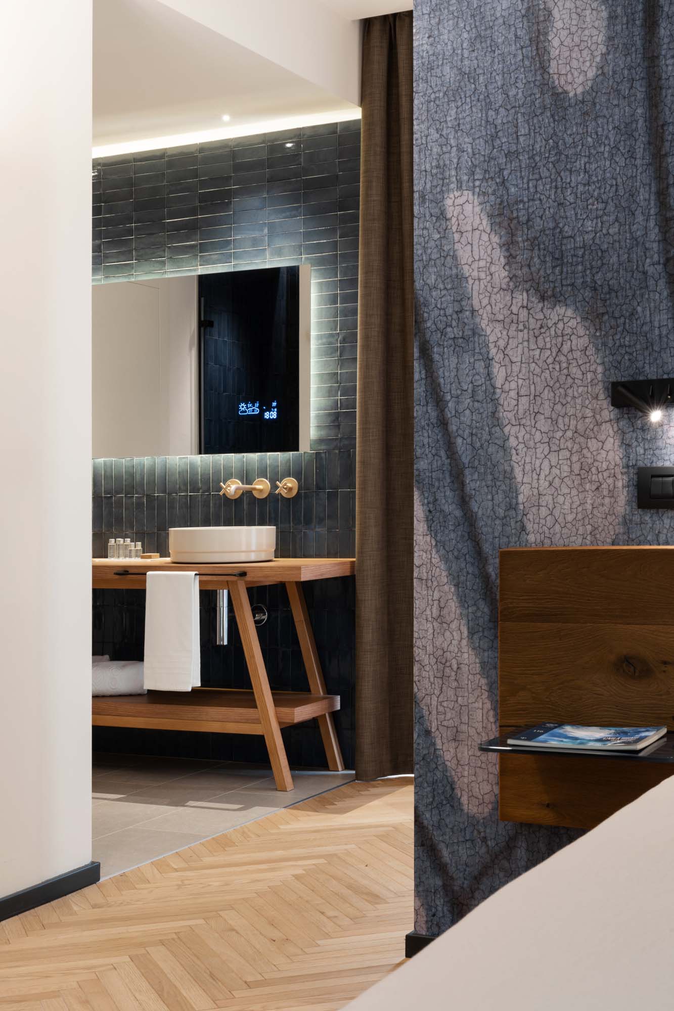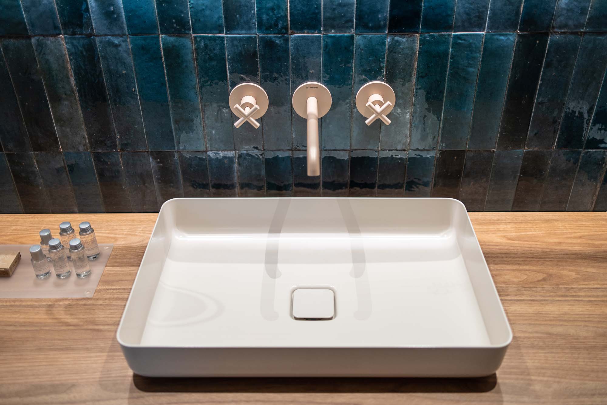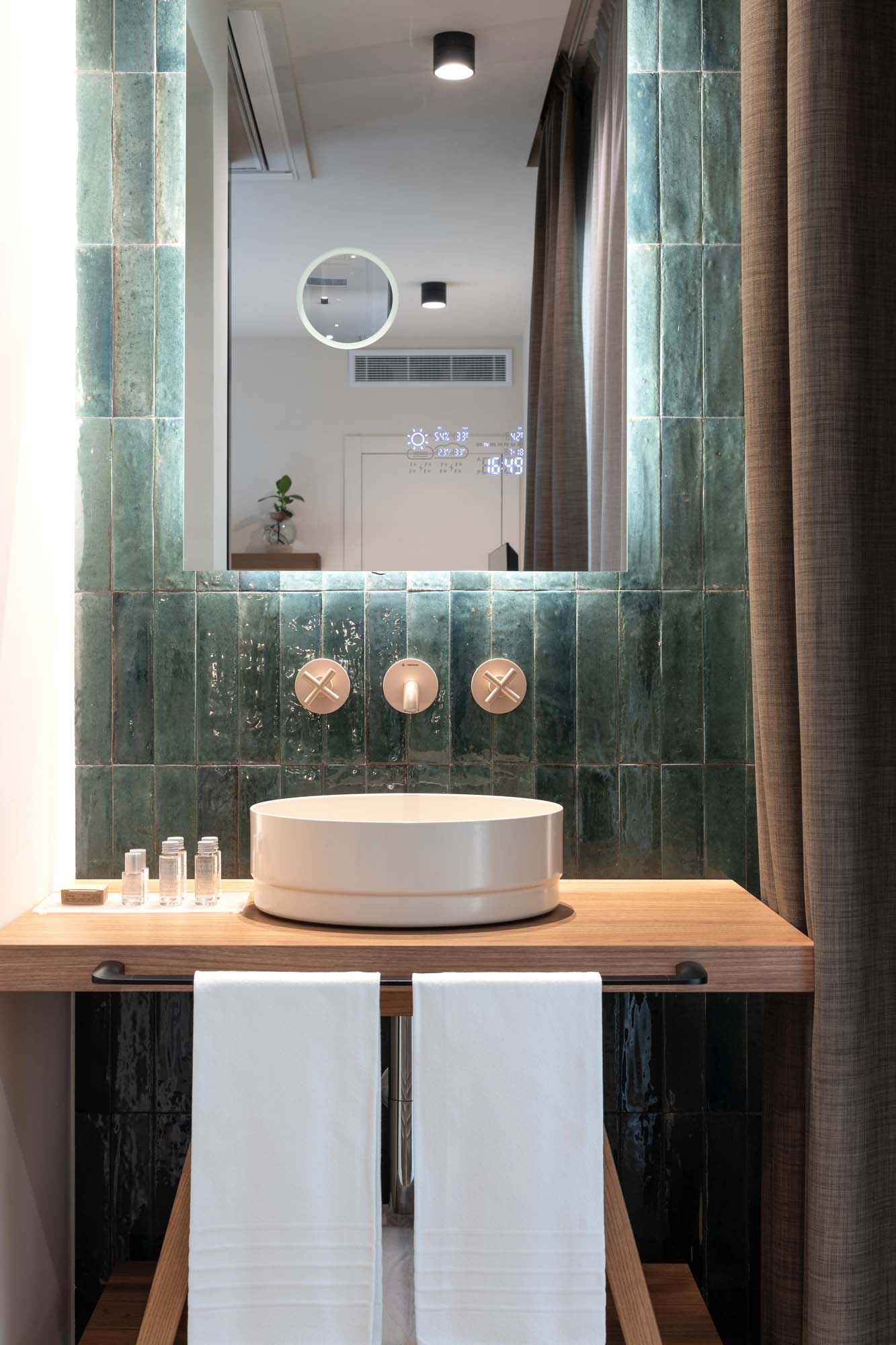 Los cuartos de baño de las habitaciones se han diseñado para brindar gran luminosidad y personalidad al ambiente mediante el uso de dos revestimientos distintos, ambos con gran fuerza expresiva y un efecto vibrante, elegidos entre las propuestas de la serie Crogiolo de formatos pequeños, que interpreta la sabiduría artesanal y la manualidad en clave contemporánea. La zona de la ducha se ha realizado con Crogiolo Zellige, pequeños ladrillos cuadrados que imitan la elaboración manual y se inspiran en la tradición norteafricana. Una característica distintiva de la colección consiste en los cambios de gradación, que, junto con la colocación aleatoria, crean un efecto blend de gran impacto. En cada habitación, la zona del lavabo se ha realizado con diferentes colores de Crogiolo Lume, ladrillos en formato de 6 × 24 cm con una atractiva estética contemporánea y un efecto superbrillante, que viste el ambiente con variaciones cromáticas y motivos de aspecto imperfecto y desgastado, capaces de hacer que los espacios vibren.
